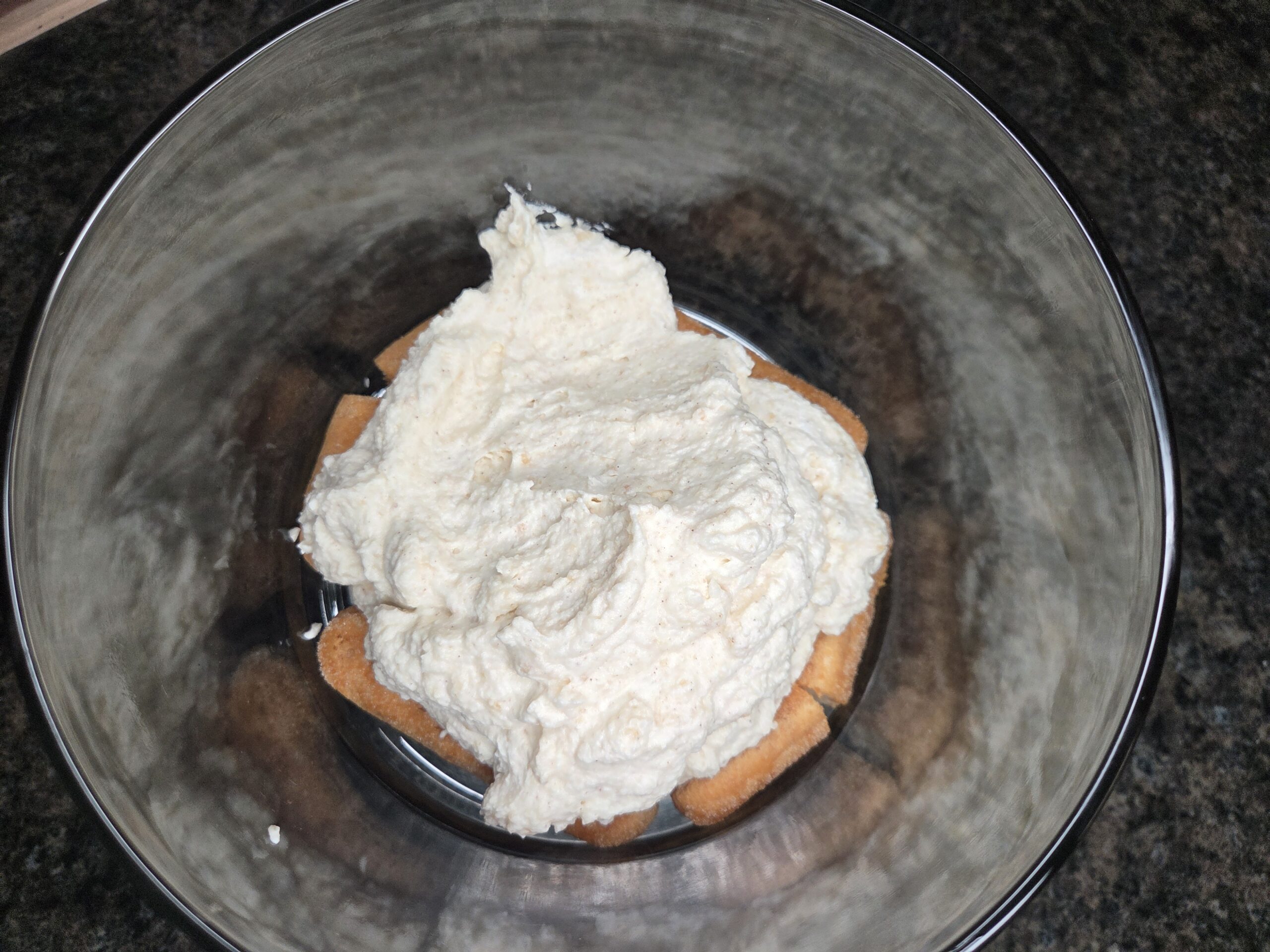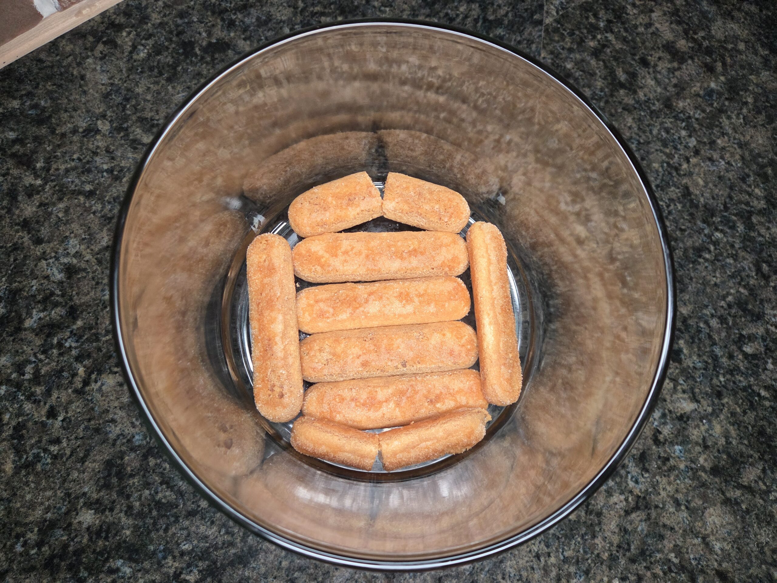 Quickly dip each ladyfinger into the cold coffee mixture and arrange them in a single layer on the bottom of your dish. If you’re using a trifle dish, you can gently break a few of the outer cookies to fit the bowl's curve.