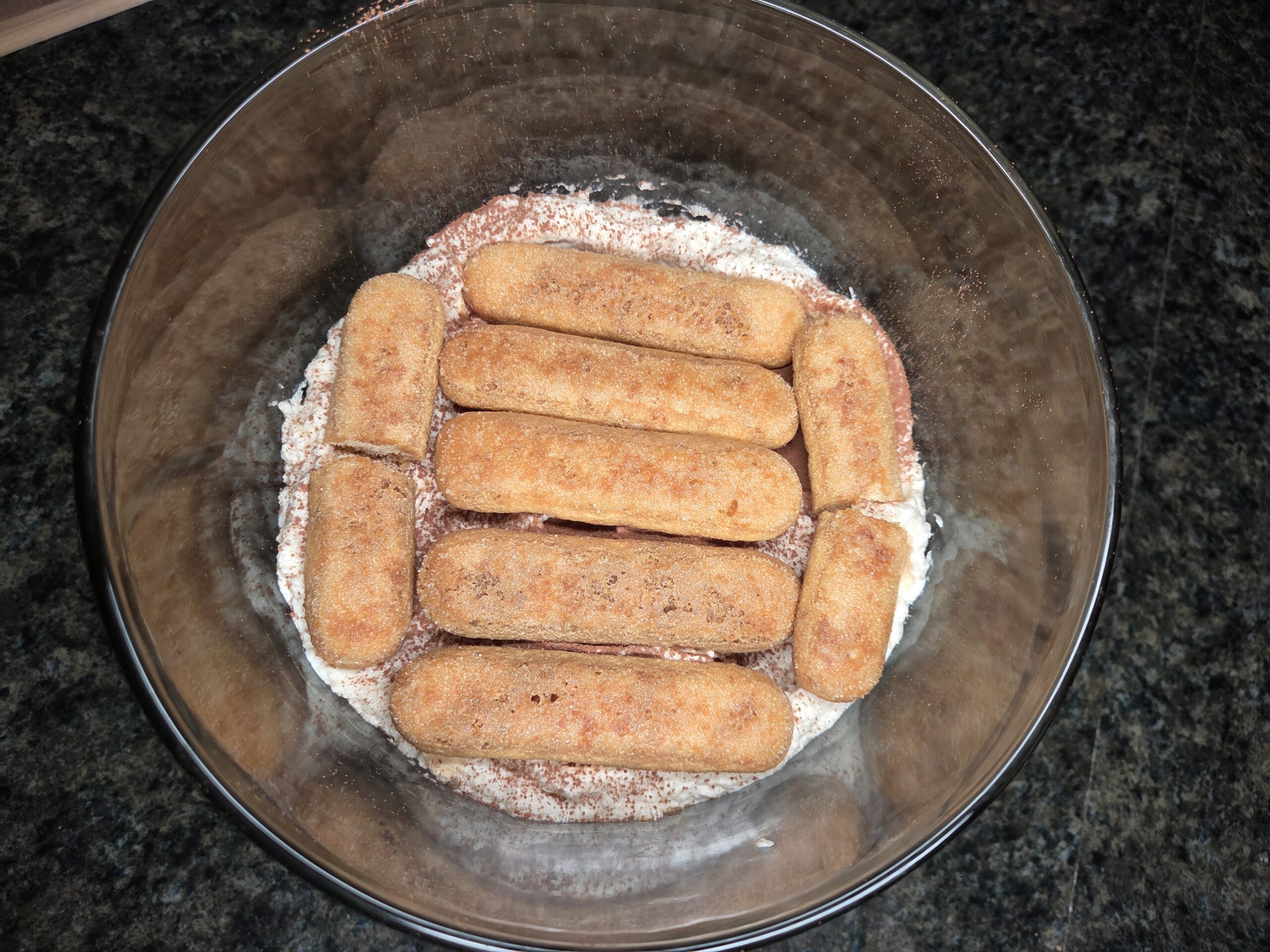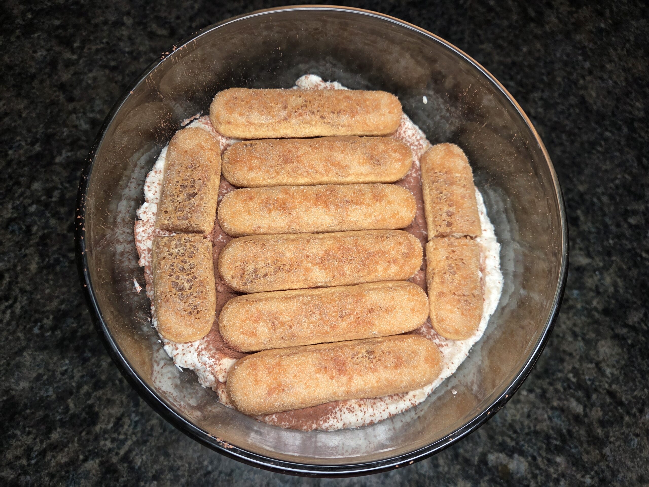 Repeat the layers: dipped ladyfinger cookies, a layer of hazelnut cream, and a dusting of cocoa powder.