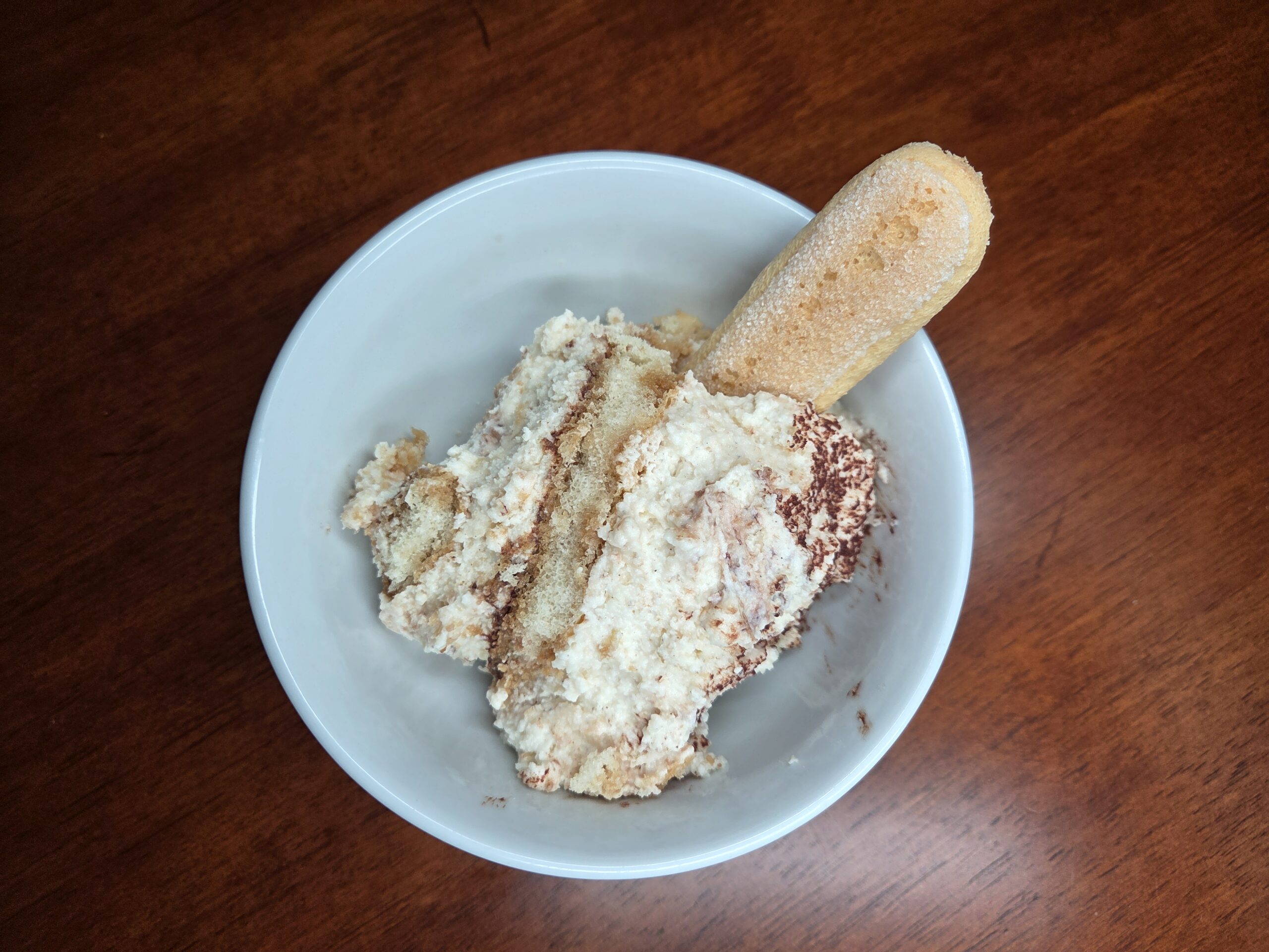 Tiramisu with homemade cinnamon, hazelnut cream filling, Kahlua, and coffee-dipped ladyfinger cookies, and cocoa powder—no baking required.