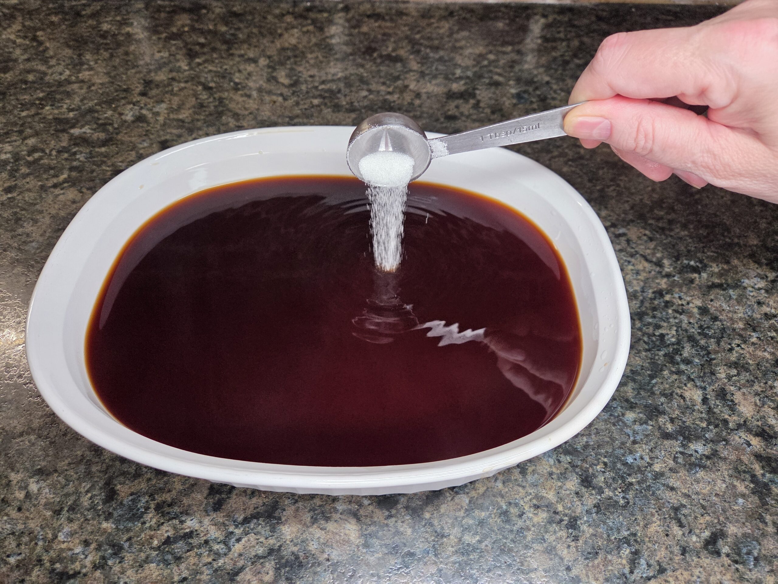 Stir 1 tablespoon of sugar into the hot coffee so it dissolves. Let the coffee cool, then add 1/8 cup of Kahlúa, if you’re using it.