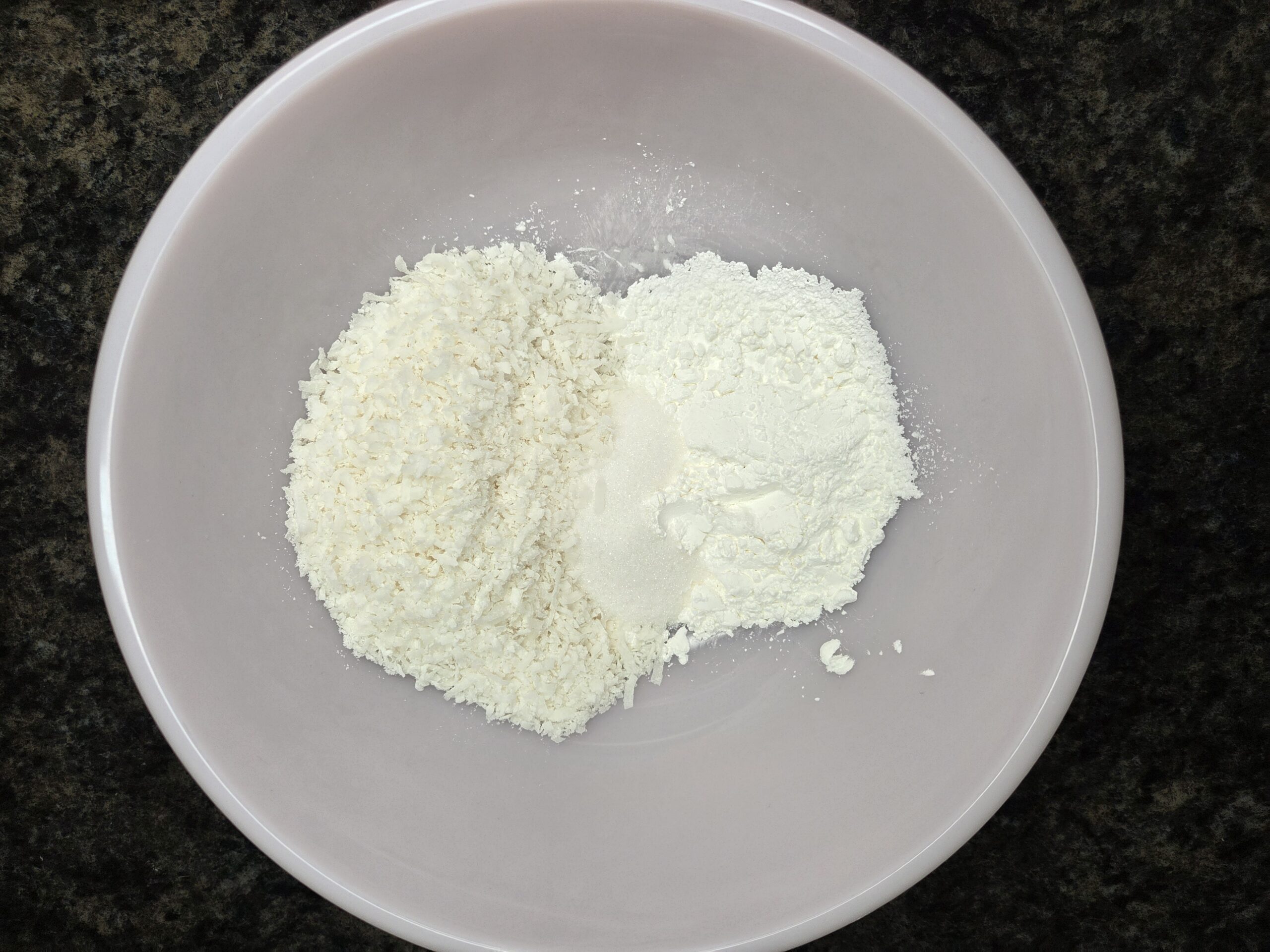 In another separate large bowl, combine the remaining 1/3 cup of cornstarch, all of the shredded coconut, 1 tablespoon of sugar, 1/2 teaspoon of salt, and 1/2 cup of flour.