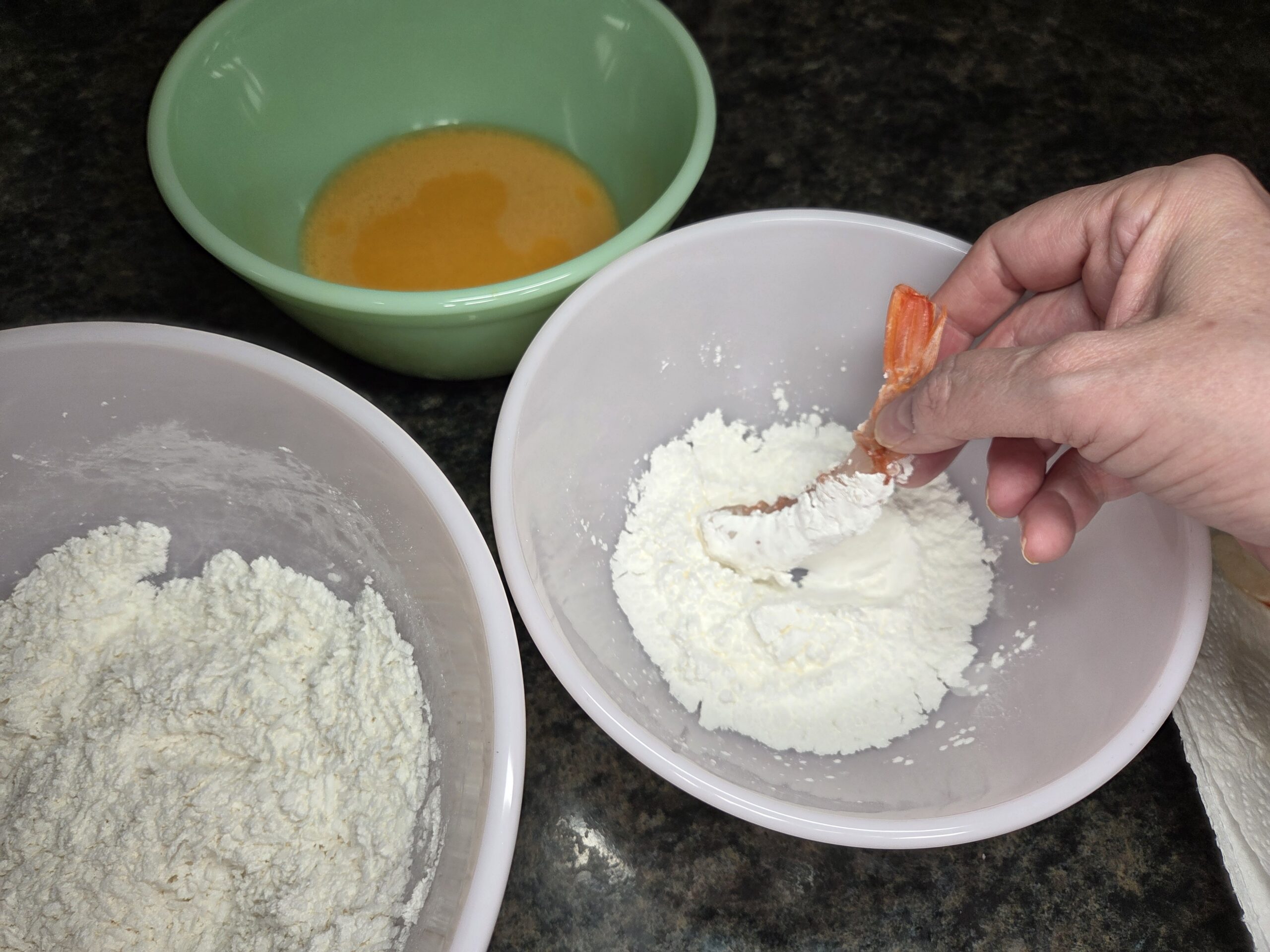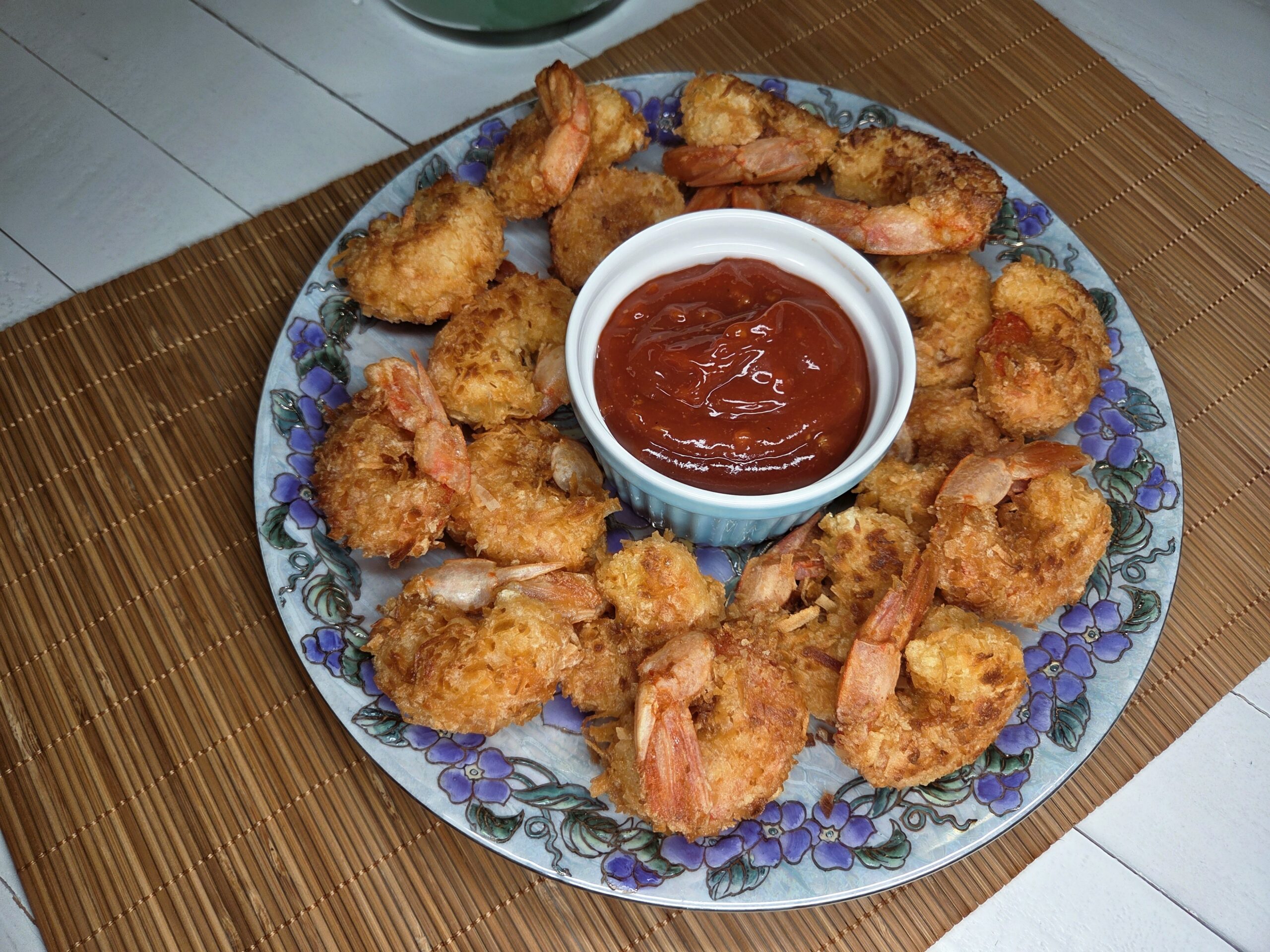 Roll the shrimp in the cornstarch, shaking off the excess, then dip them into the egg mixture, and finally coat them thoroughly in the coconut mixture.