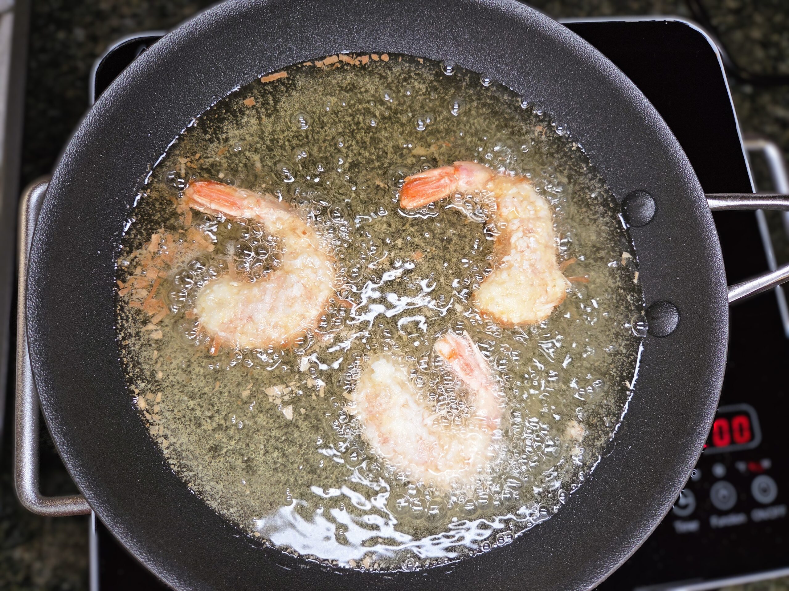 Carefully place the shrimp in the hot oil and fry until the coating turns golden brown, about a few minutes per side.