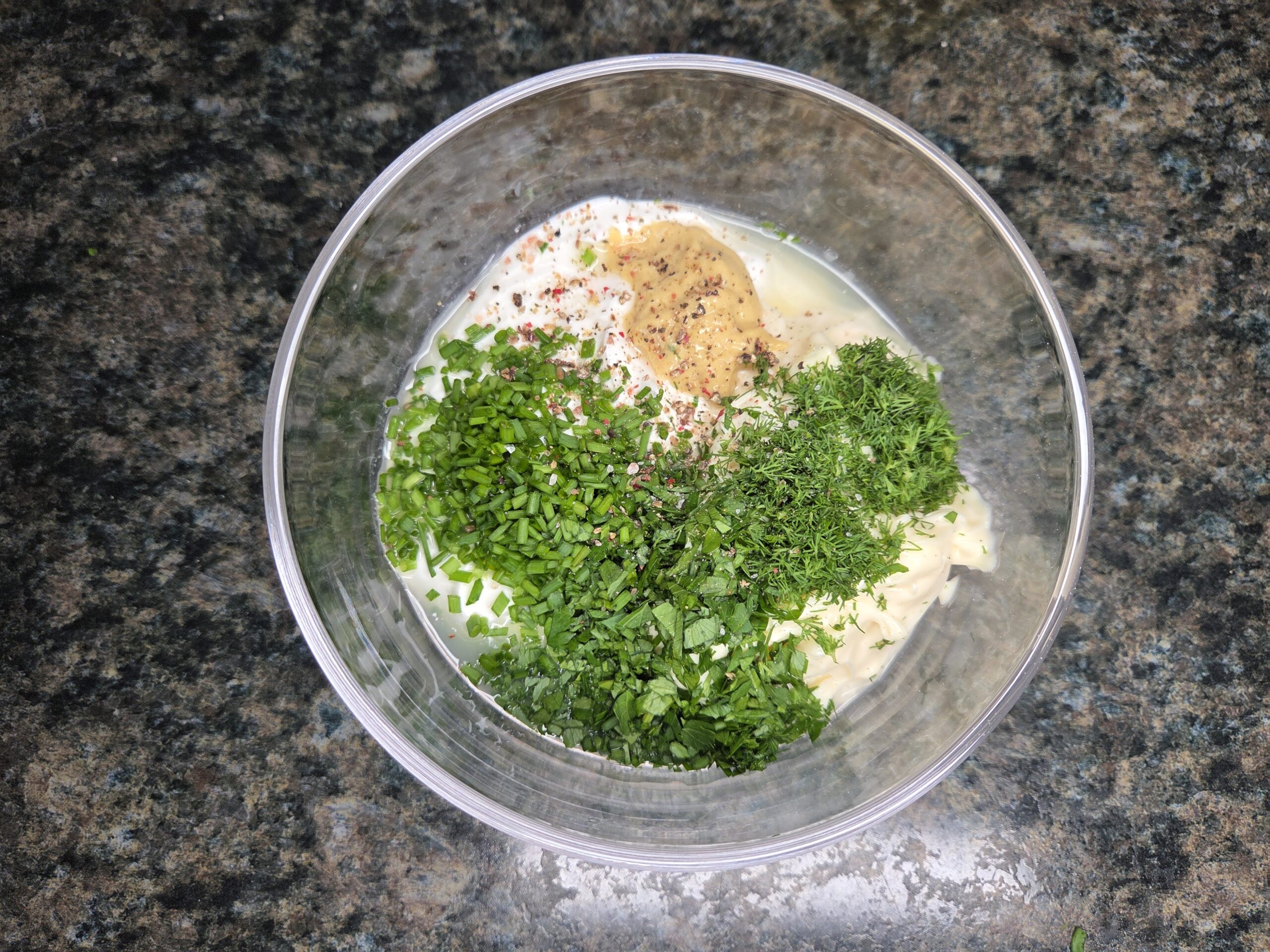 Place 1/2 cup of mayonnaise and 1/2 cup of sour cream or yogurt in a medium bowl. Add 1 tablespoon of lemon juice or white vinegar and 1 teaspoon of Dijon mustard. Finely mince 2 tablespoons of fresh chives, 1 tablespoon parsley, and 1 tablespoon fresh dill, then add them to the bowl—season with salt and pepper to taste.