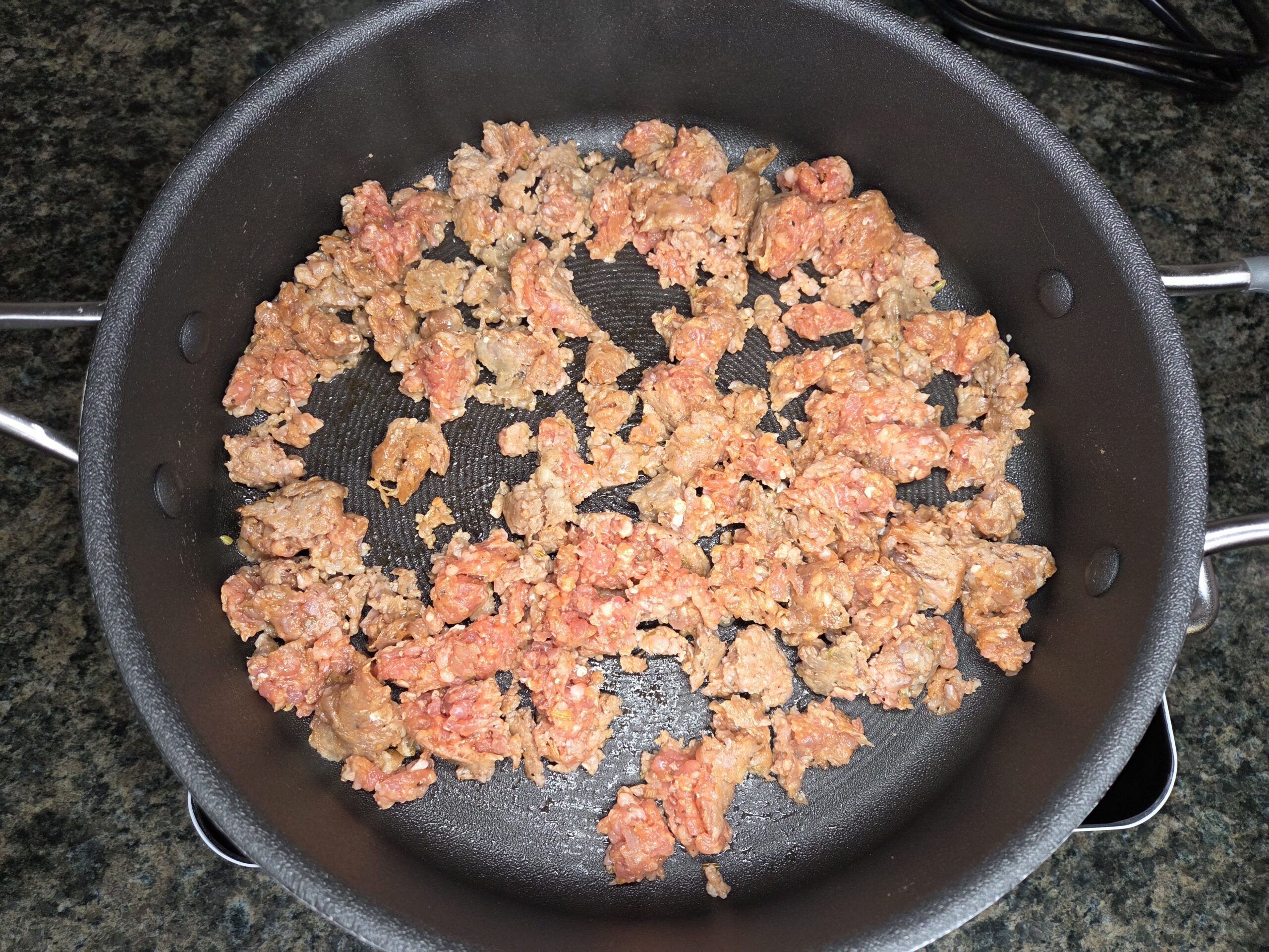 Start heating a pot of water for the pasta, following the cooking instructions on the packaging. In a large skillet over medium heat, add sausage and cook until browned, breaking it apart as it cooks.