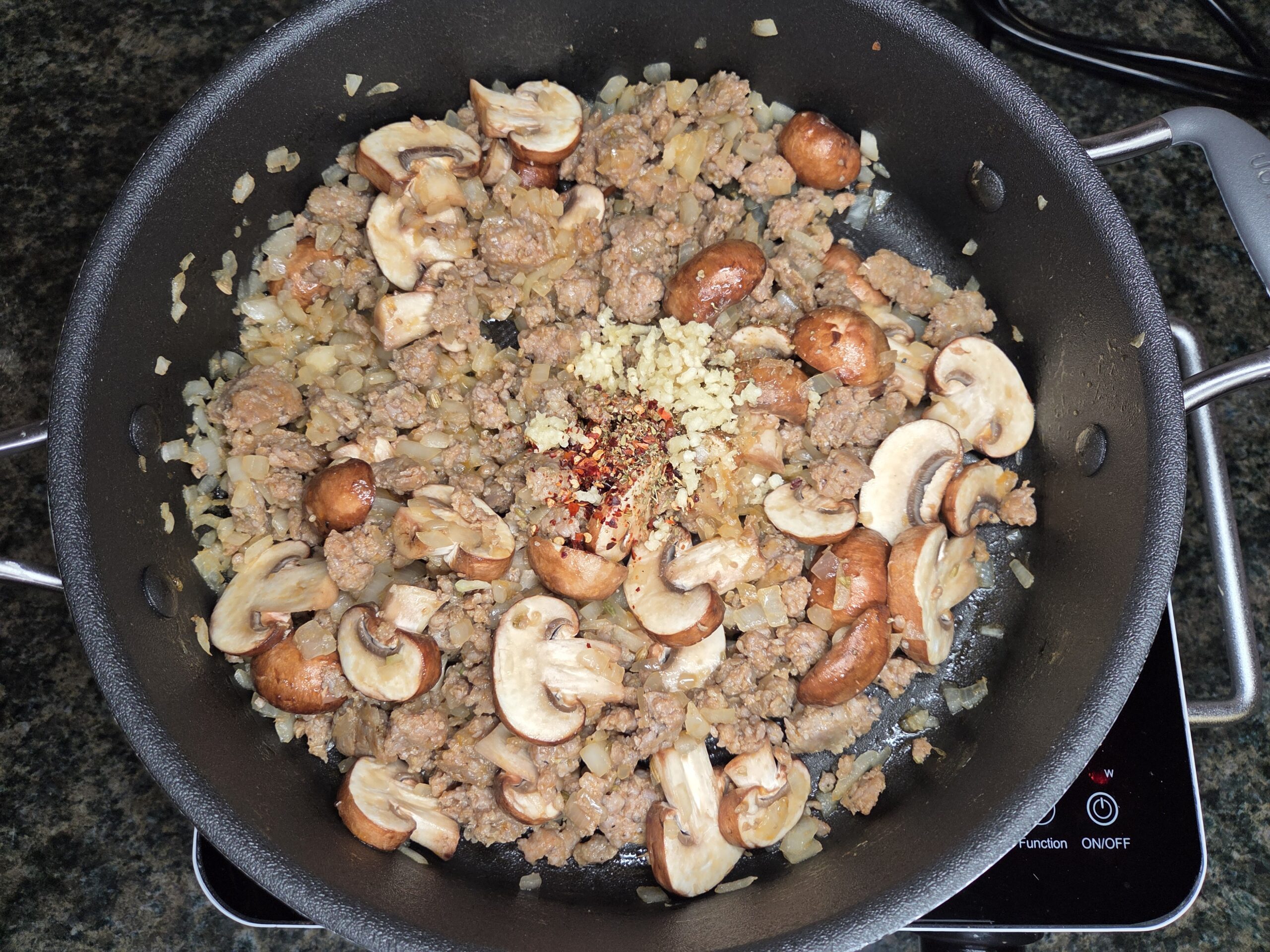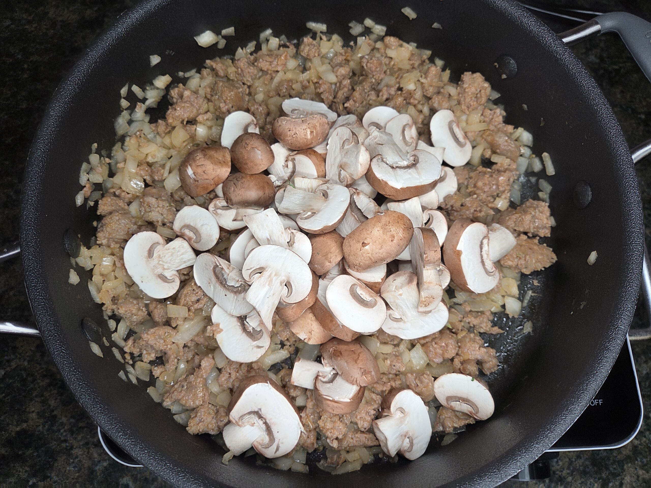 Add 2 cups of mushrooms to the skillet and sauté for a few more minutes until lightly browned.