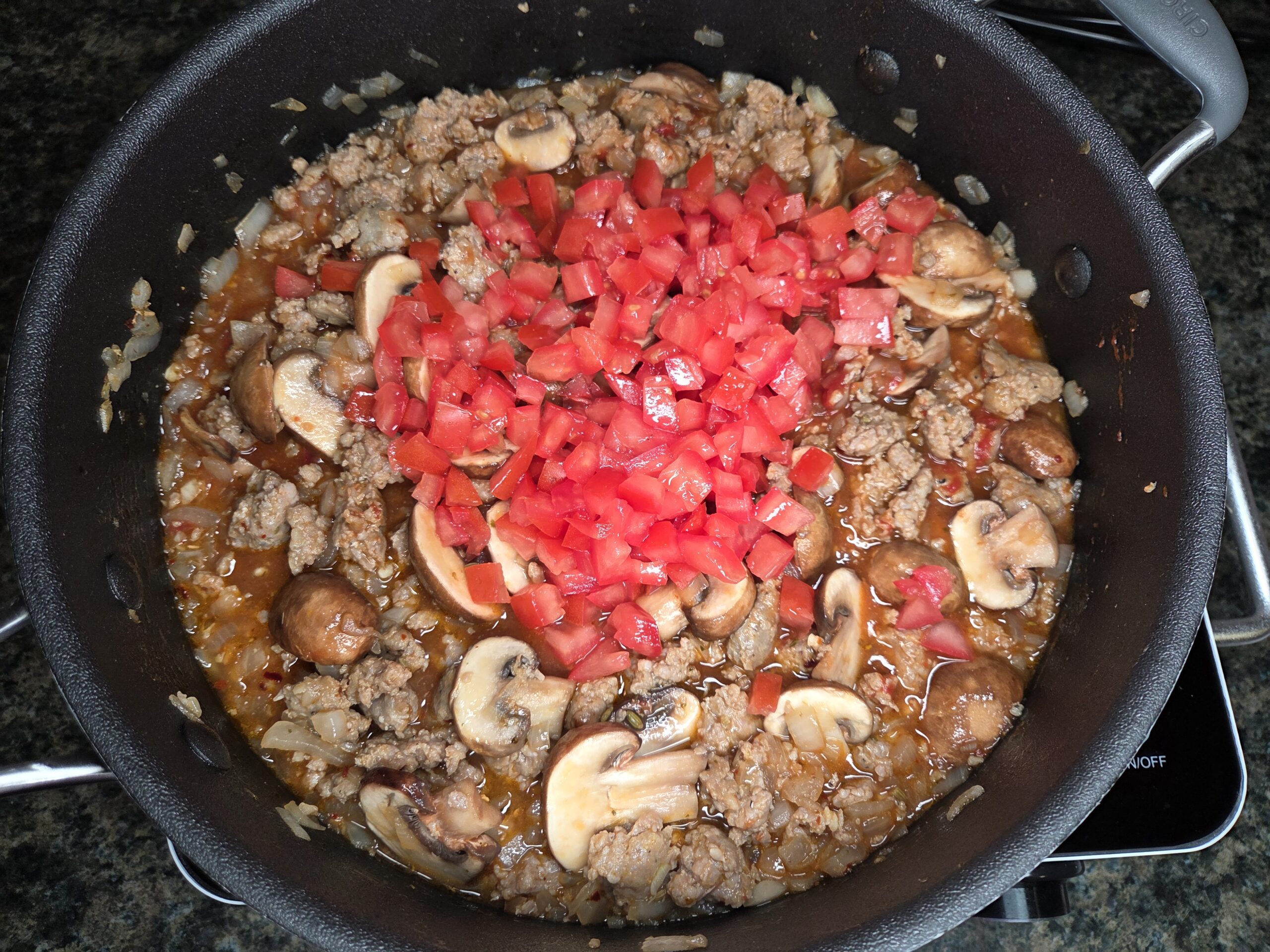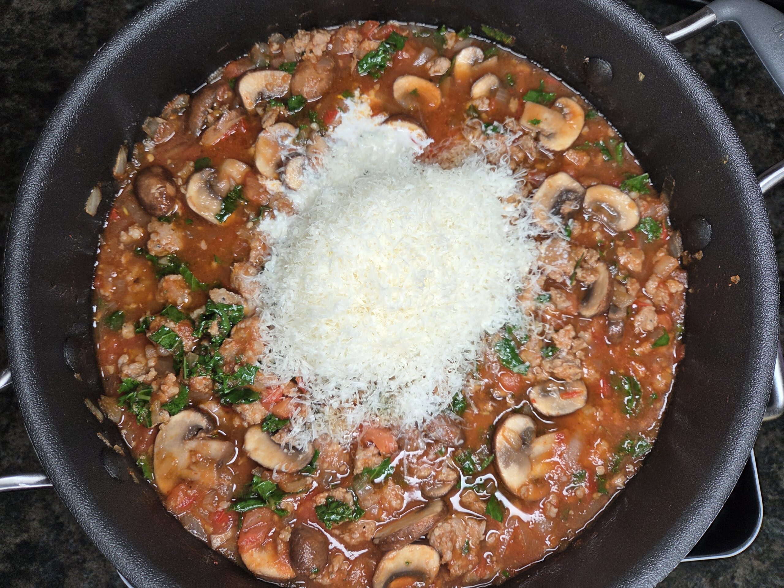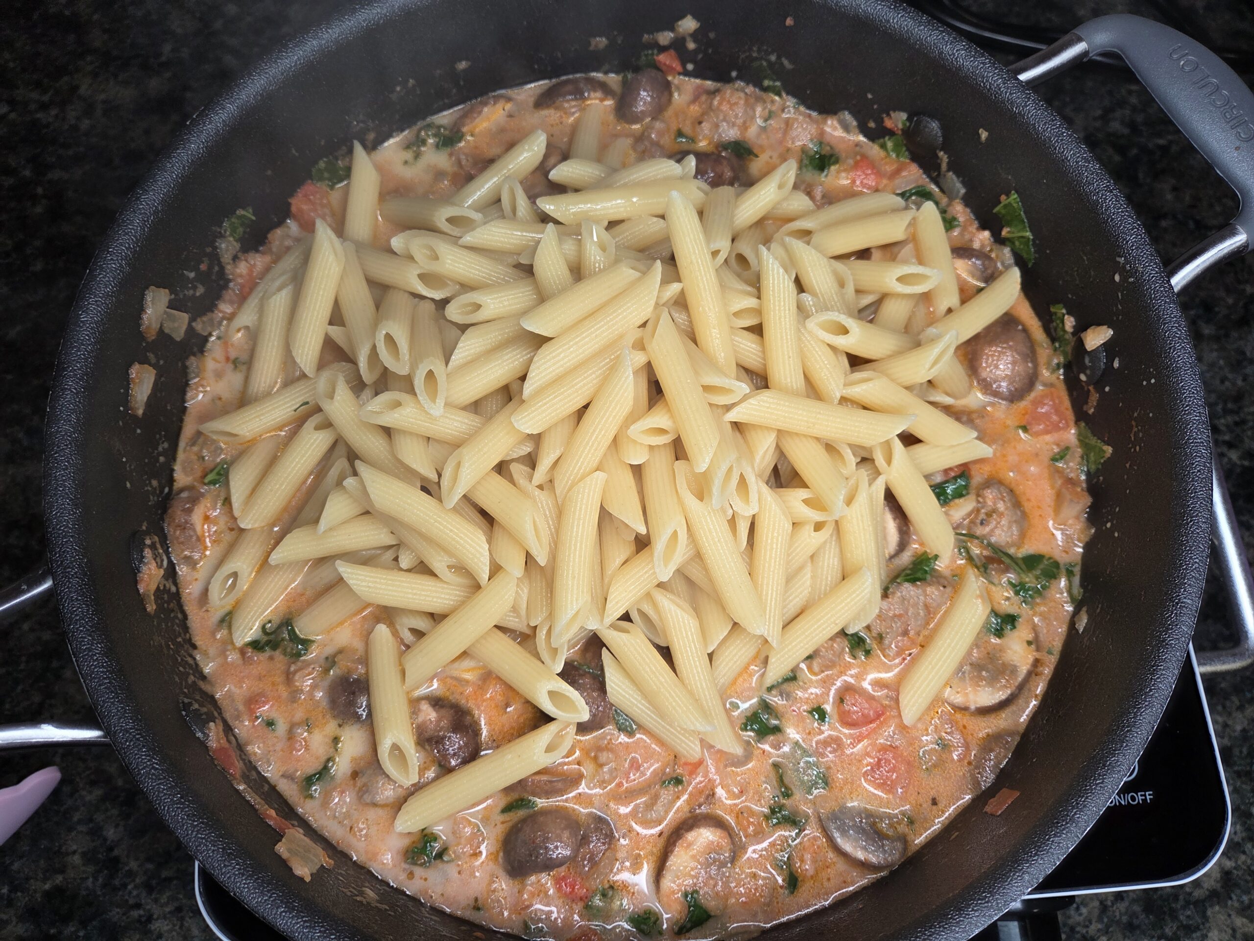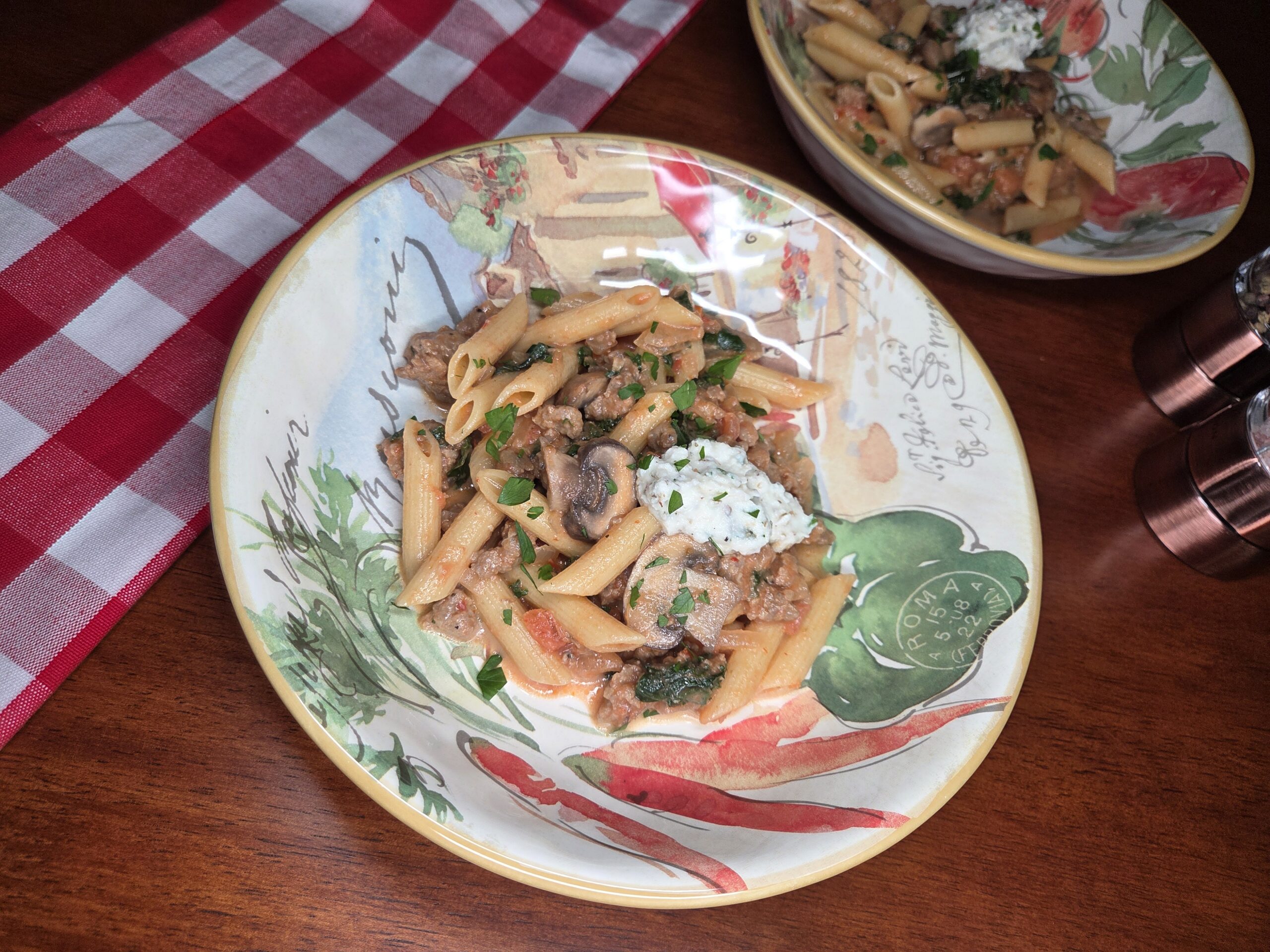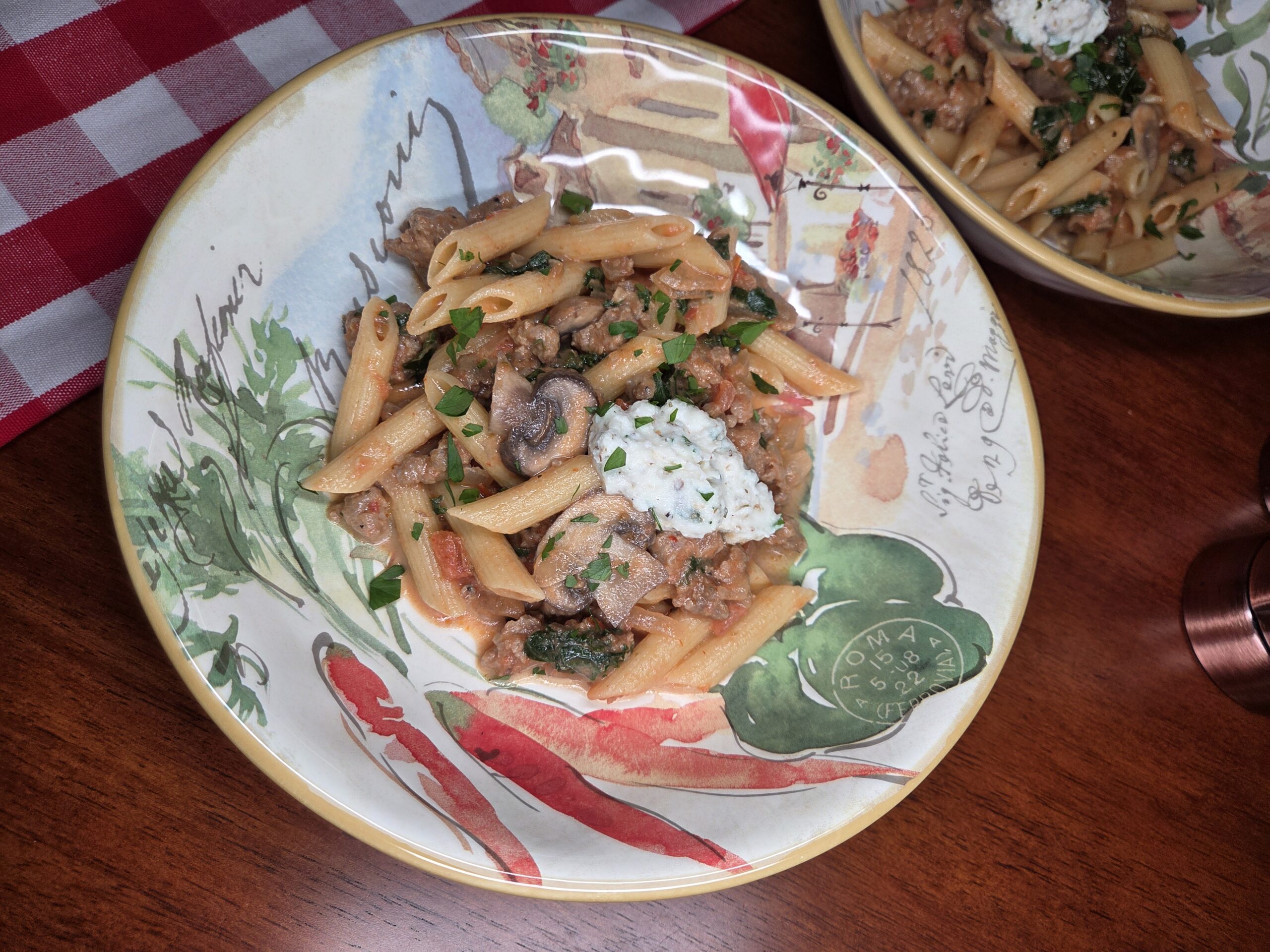 This pasta recipe brings together rich, savory Italian sausage with the brightness of tomatoes and the warmth of garlic and oregano. A gentle heat from red pepper flakes lingers softly, while earthy mushrooms and tender kale add depth and balance. Parmesan and half & half melt into a silky, creamy sauce that clings to every noodle, and a cool dollop of herbed ricotta on top adds a luxurious finish that ties every flavor together.