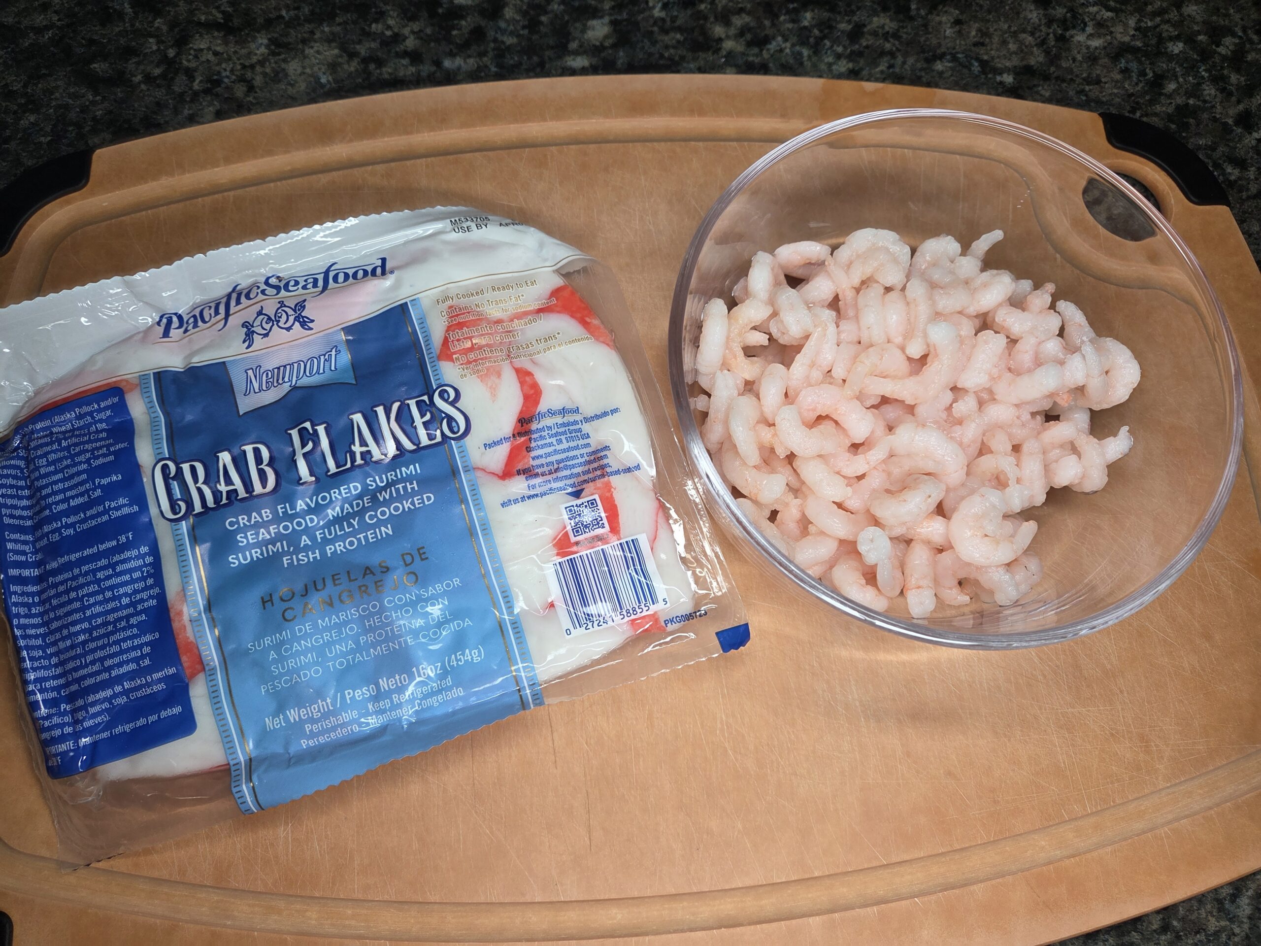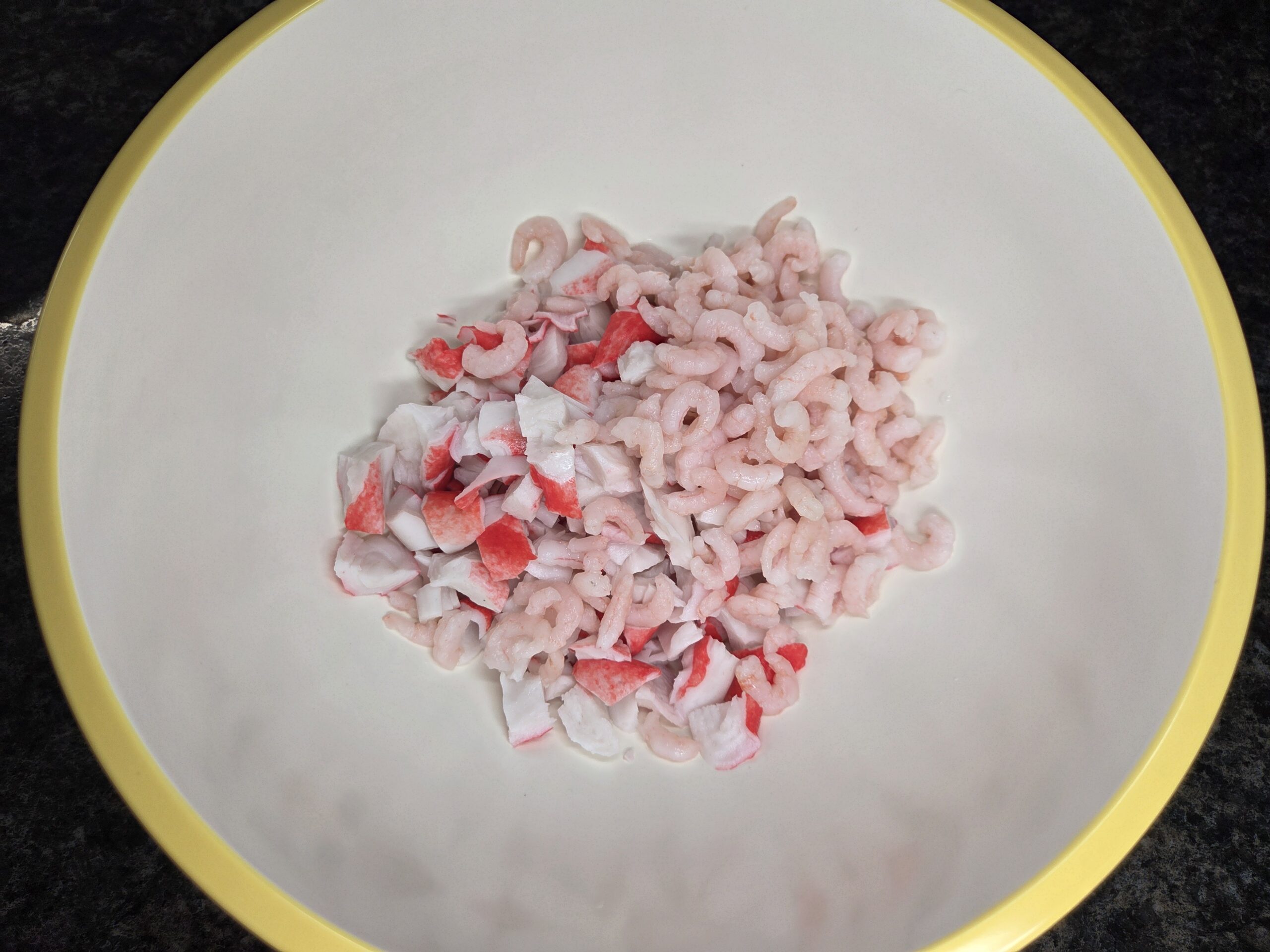 Chop the imitation crab into your desired size — either bite‑size chunks or shredded pieces — and place it in a large mixing bowl. Add the prepared shrimp and gently toss to combine.