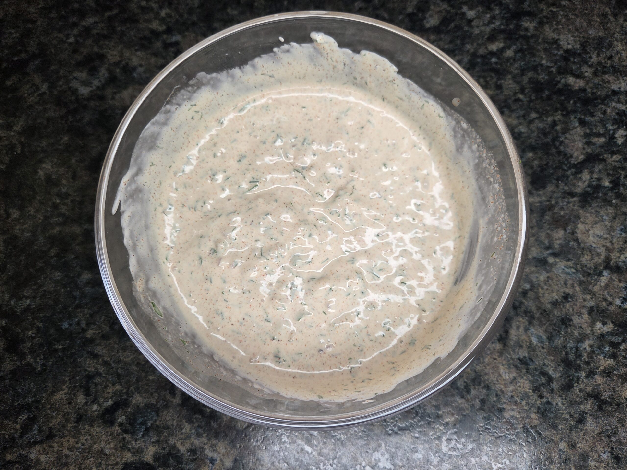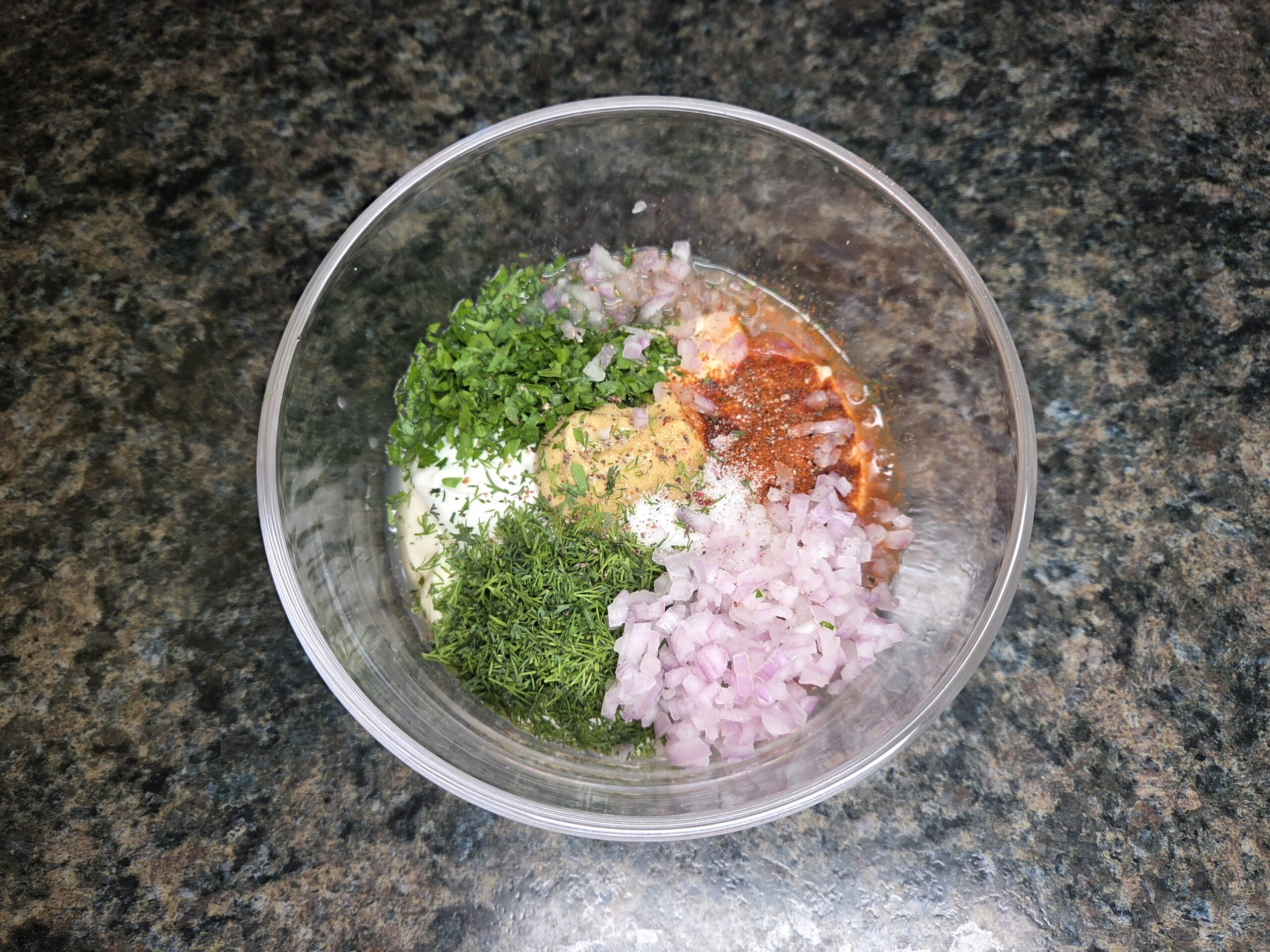 Make the dressing. In a small bowl, stir together the mayonnaise, sour cream, lemon juice, paprika, seasoning salt, sugar, red onion (or shallot), dill, parsley, and cracked pepper until smooth and well combined.