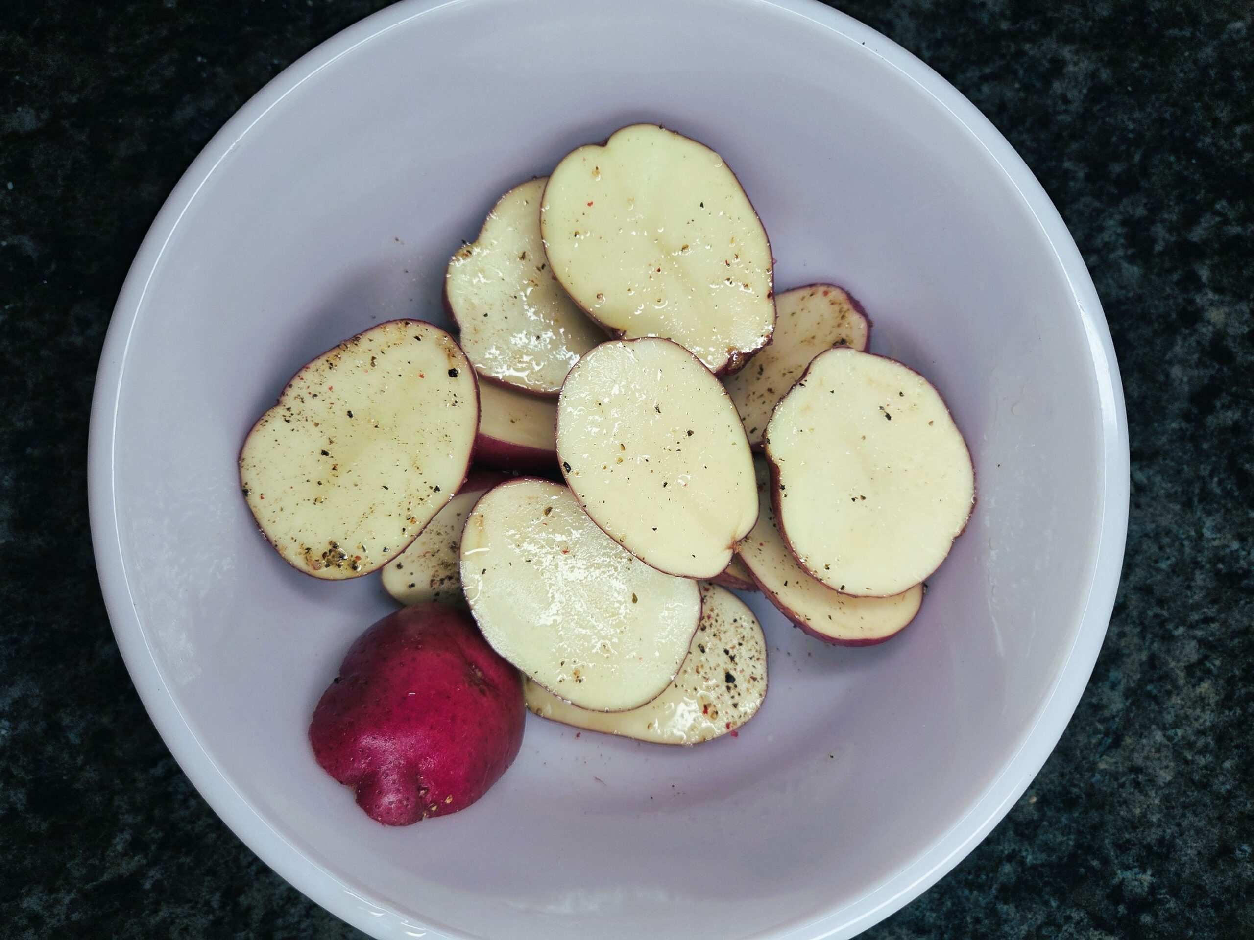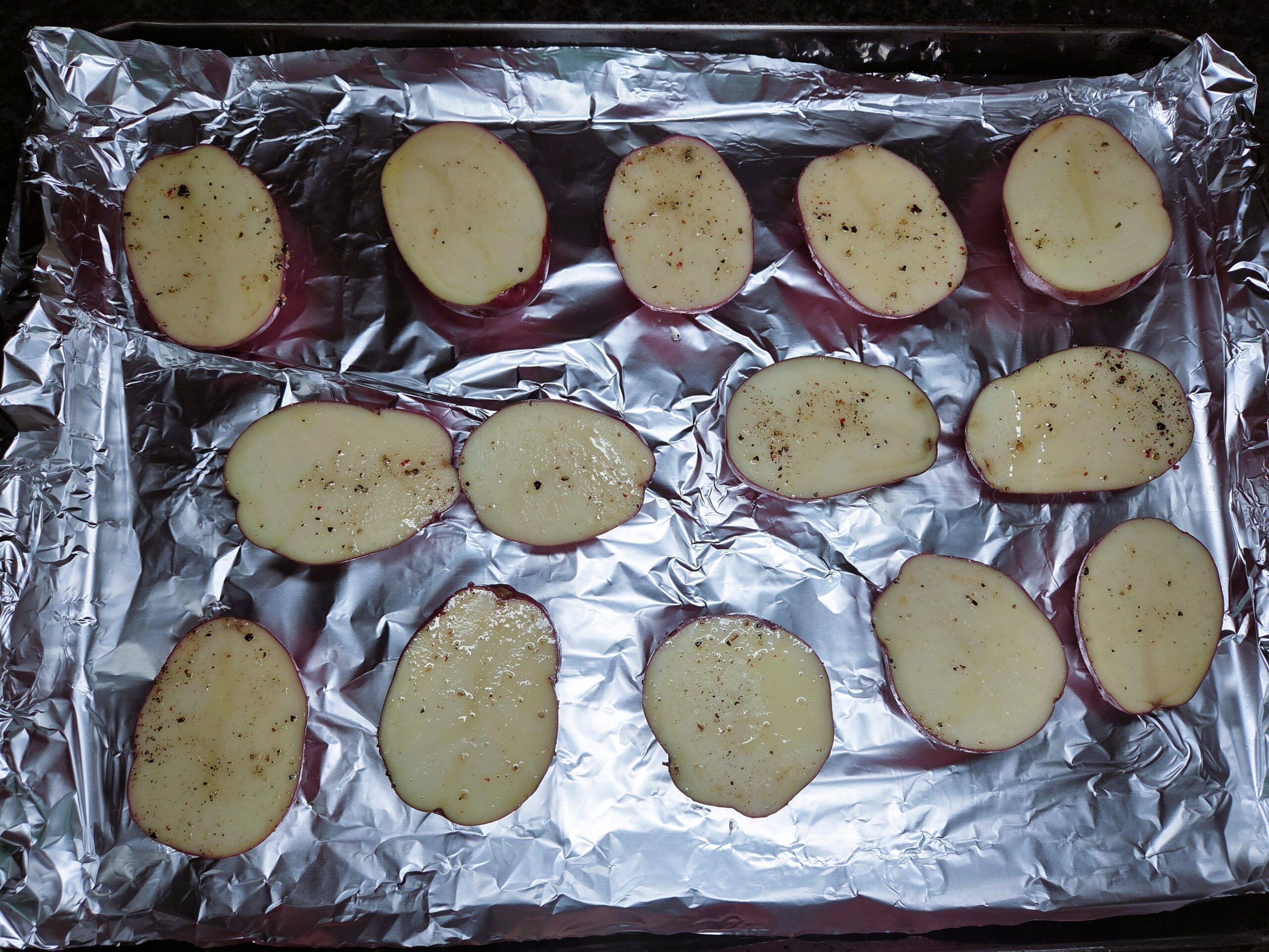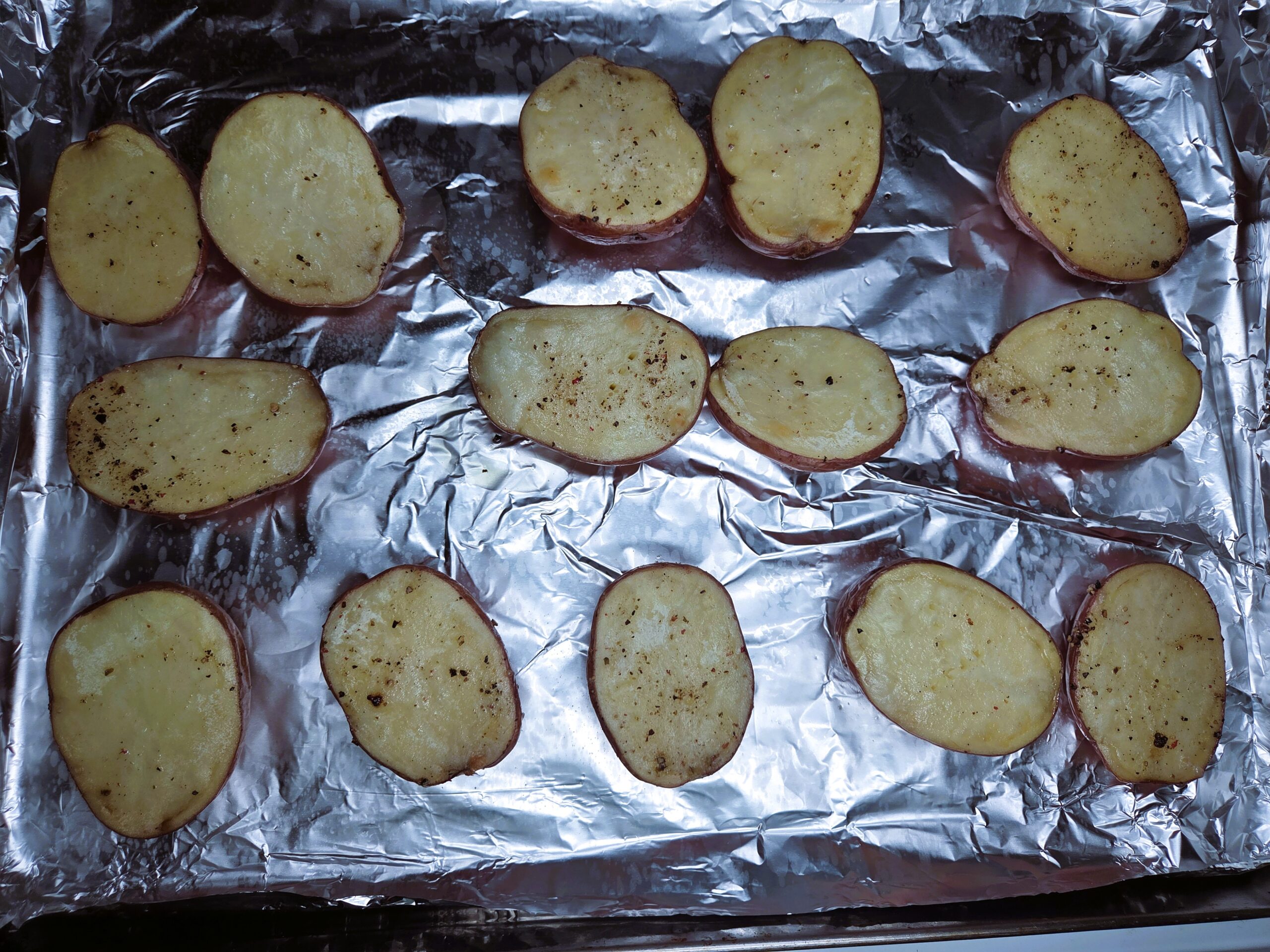 Preheat your oven to 400°F. Line a baking sheet with aluminum foil to make cleanup simple. Rinse and dry the baby potatoes, then slice each one in half lengthwise. Transfer them to a mixing bowl, drizzle with olive oil, and season generously with salt and pepper. Toss until every potato is evenly coated.