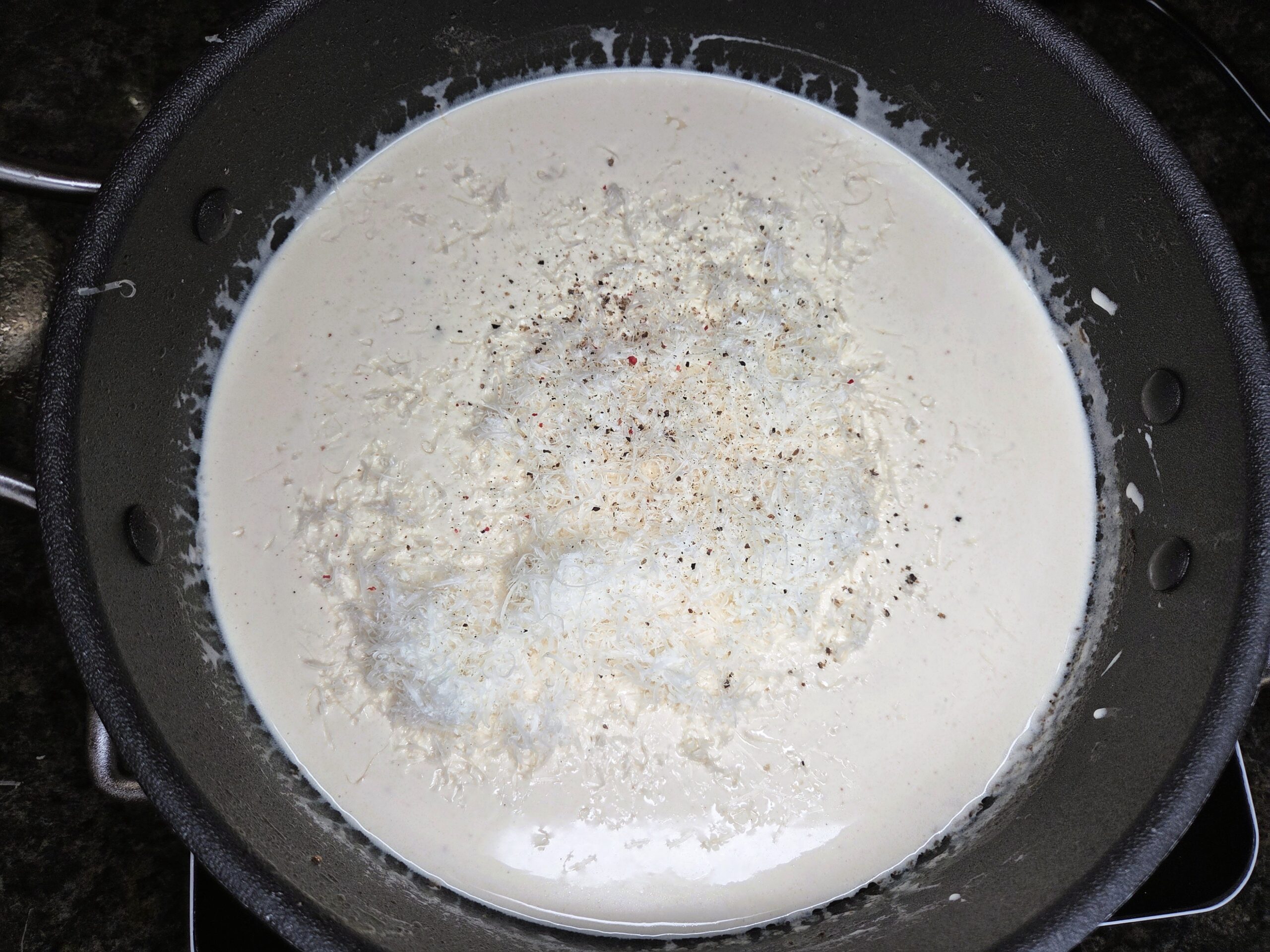 Whisk in 1 1/2 cups heavy cream, 1/8 teaspoon cracked pepper, and 1/2 cup grated Parmesan cheese. Cook and whisk until the sauce thickens to your desired consistency, about 5 minutes. Season with salt to taste.
