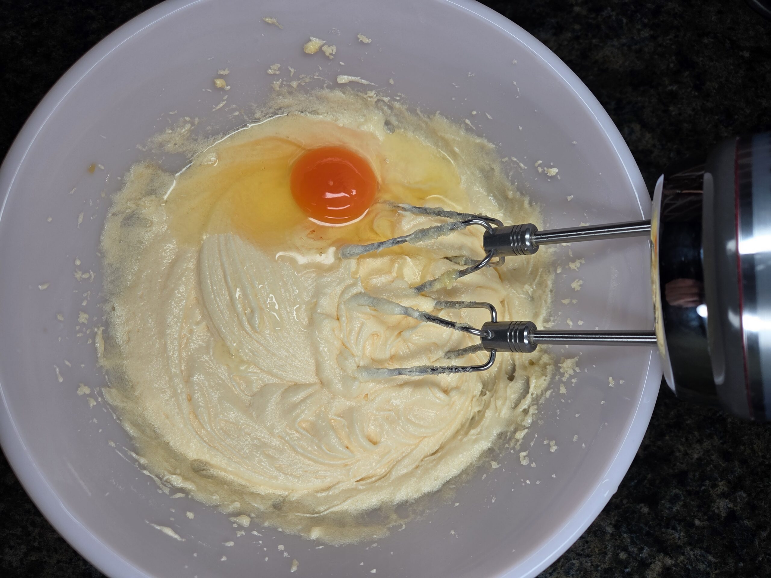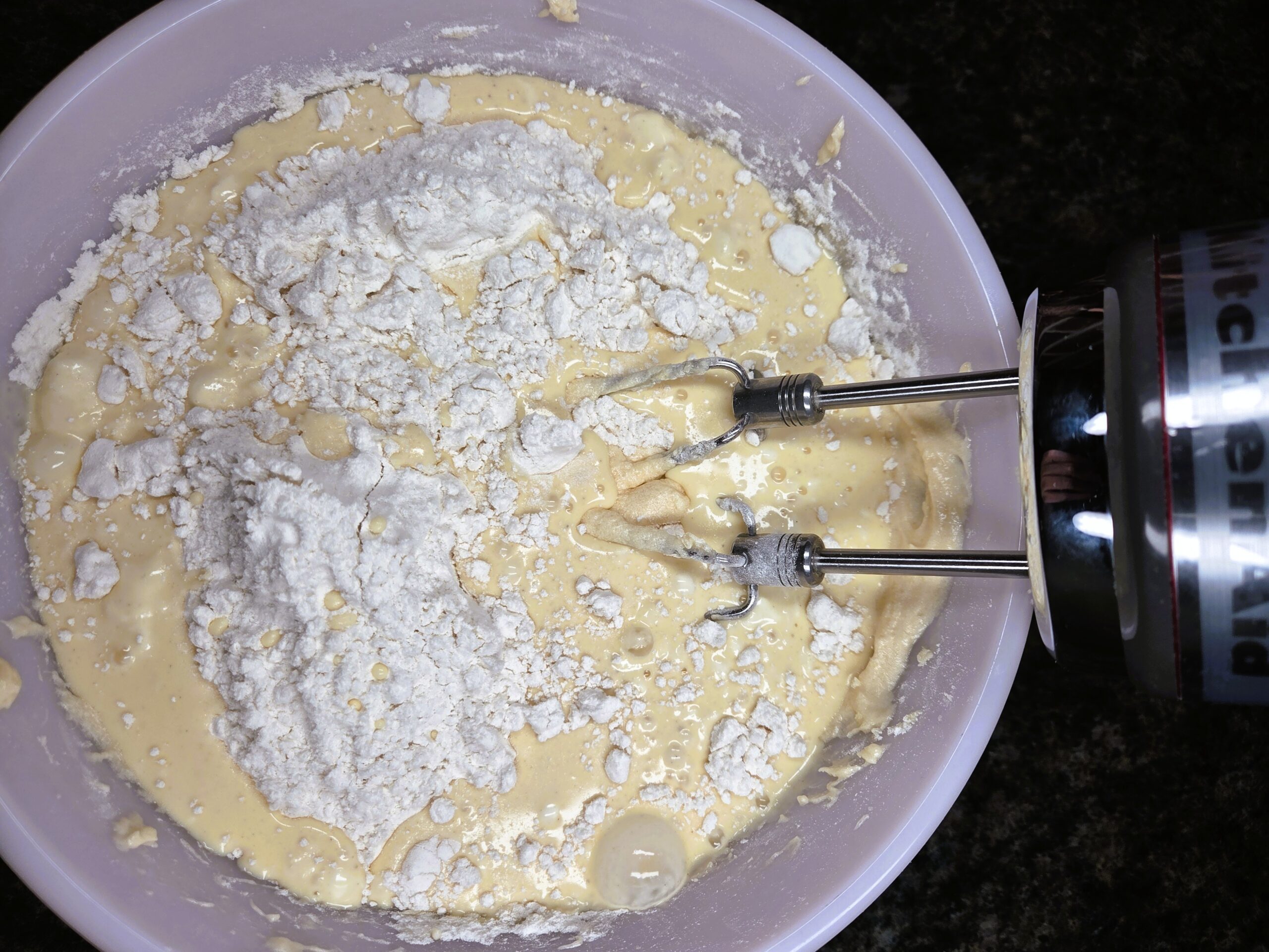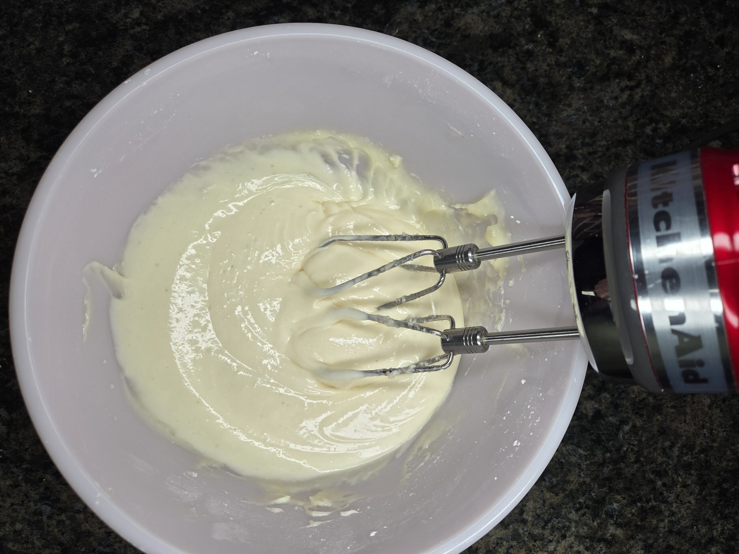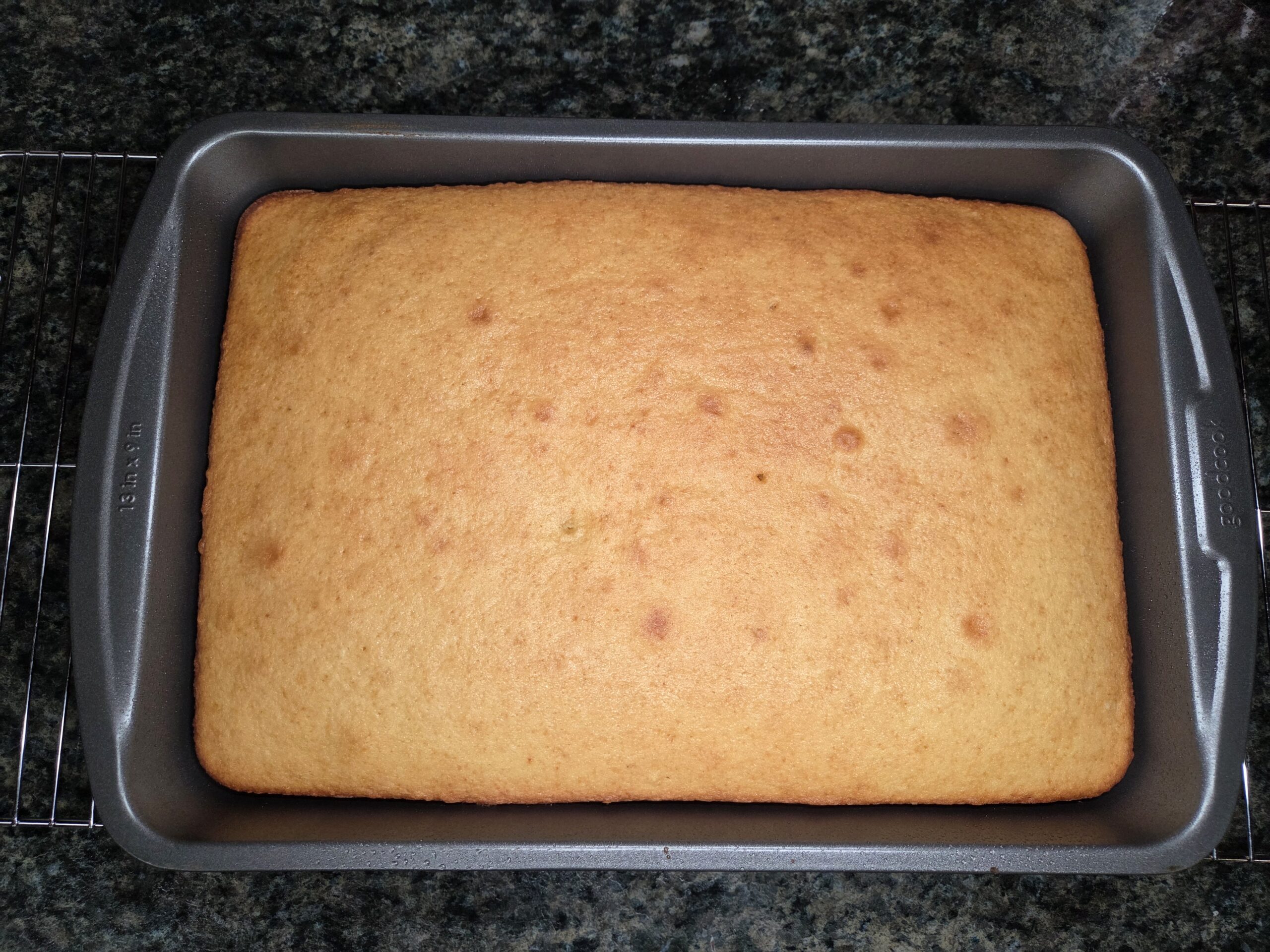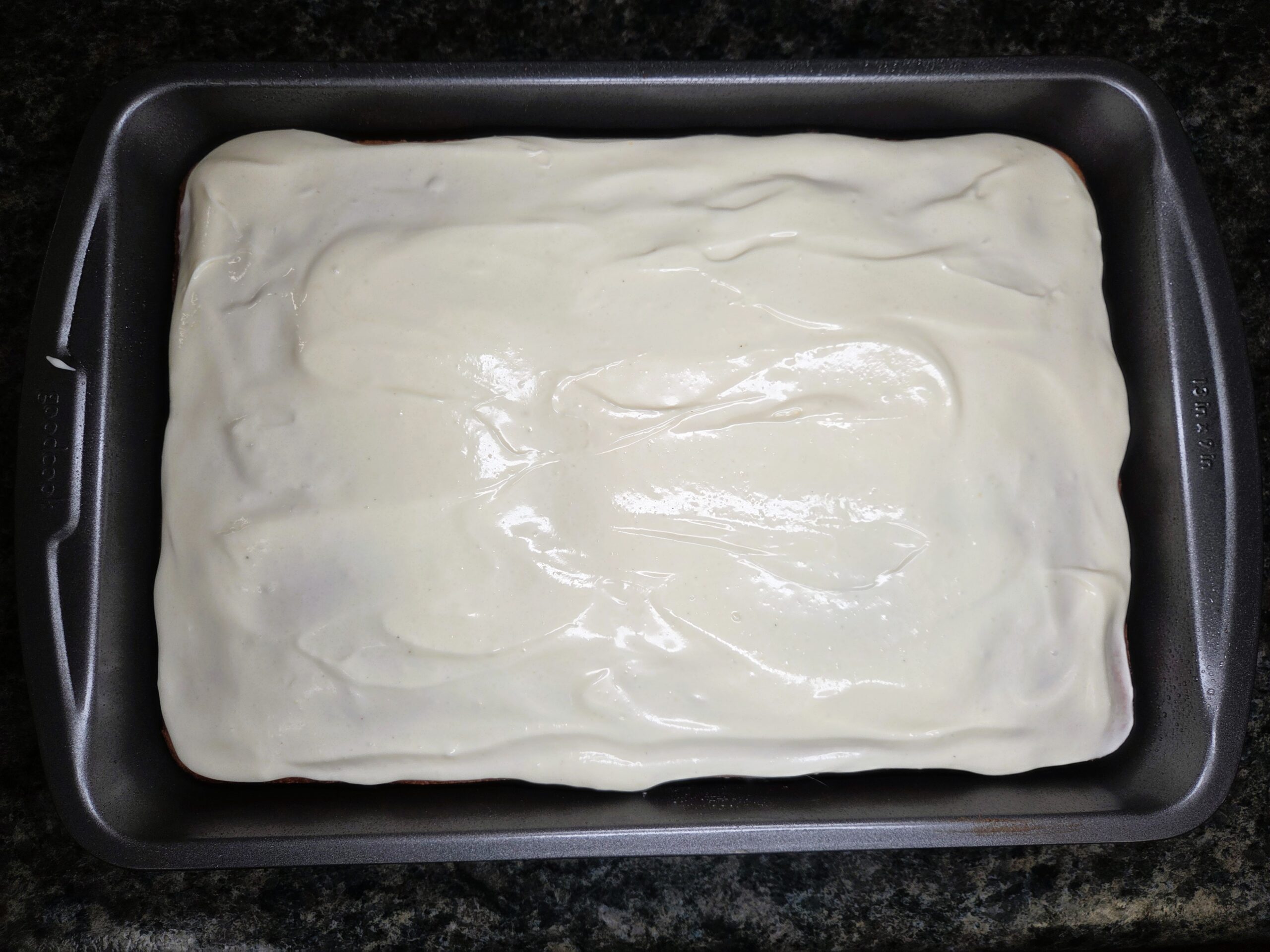 Preheat oven to 350. Spray a 9x13-inch baking pan with a neutral non-stick cooking spray. In a large bowl, mix 1/2 cup of room temperature butter and 1 1/4 cups of granulated sugar. Once the butter and sugar are combined, add in 1 teaspoon of vanilla extract and 3 eggs, one at a time, mixing after each addition.
