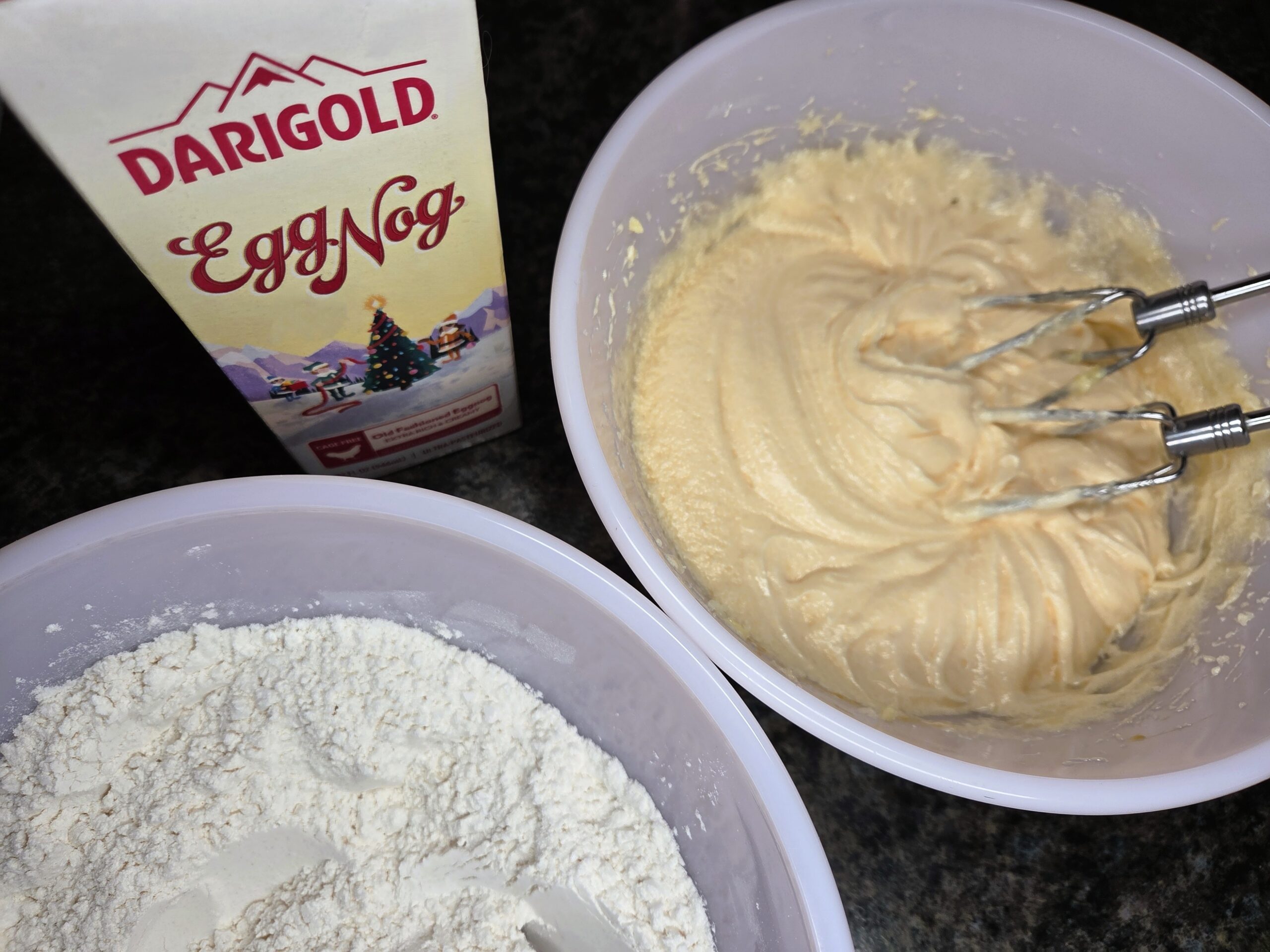 In another large bowl, mix together 2 1/4 cups of flour, 2 teaspoons of baking powder, and 1/2 teaspoon of salt. Add half of the dry ingredients to the egg and butter mixture, along with half of the 1 1/4 cups of eggnog. Then, mix in the remaining dry ingredients and the rest of the eggnog, stirring until just combined.