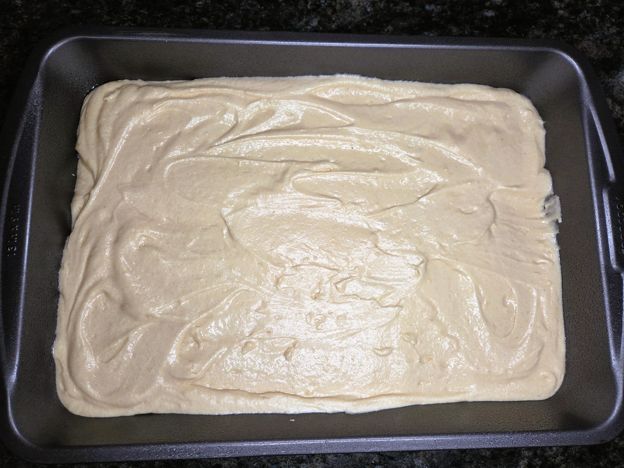 Spread the batter into the prepared baking pan. Bake for 30-35 minutes or until a toothpick inserted in the middle comes out with moist crumbs and not wet batter.