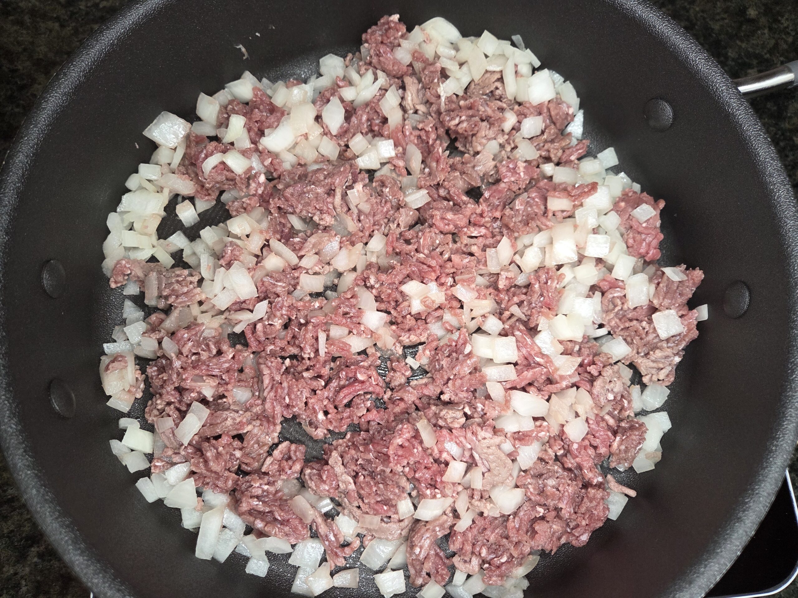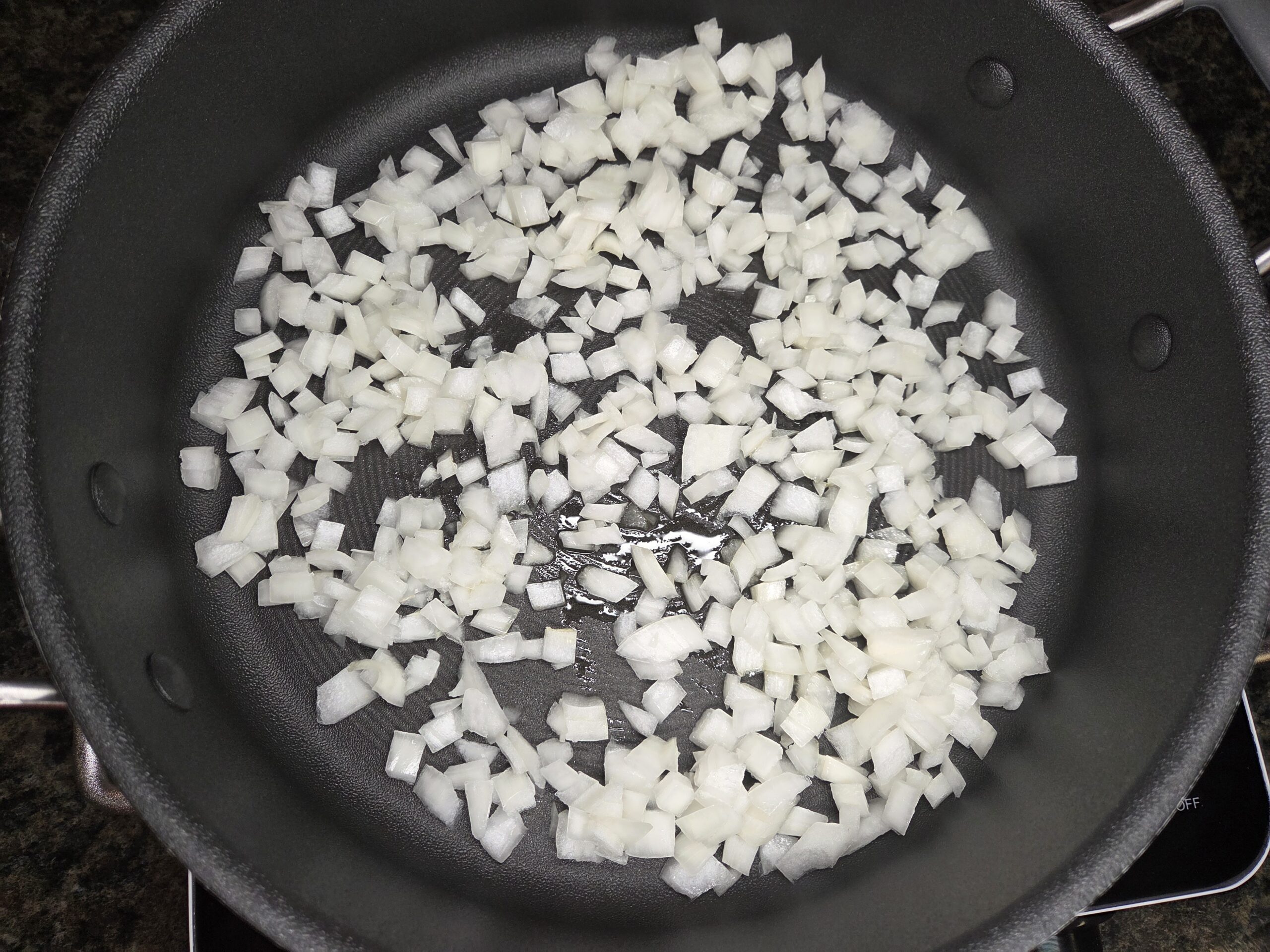 Heat a tablespoon of olive oil in a large skillet over medium heat. Add 1 diced yellow onion to the skillet and cook until softened, 4-5 minutes.