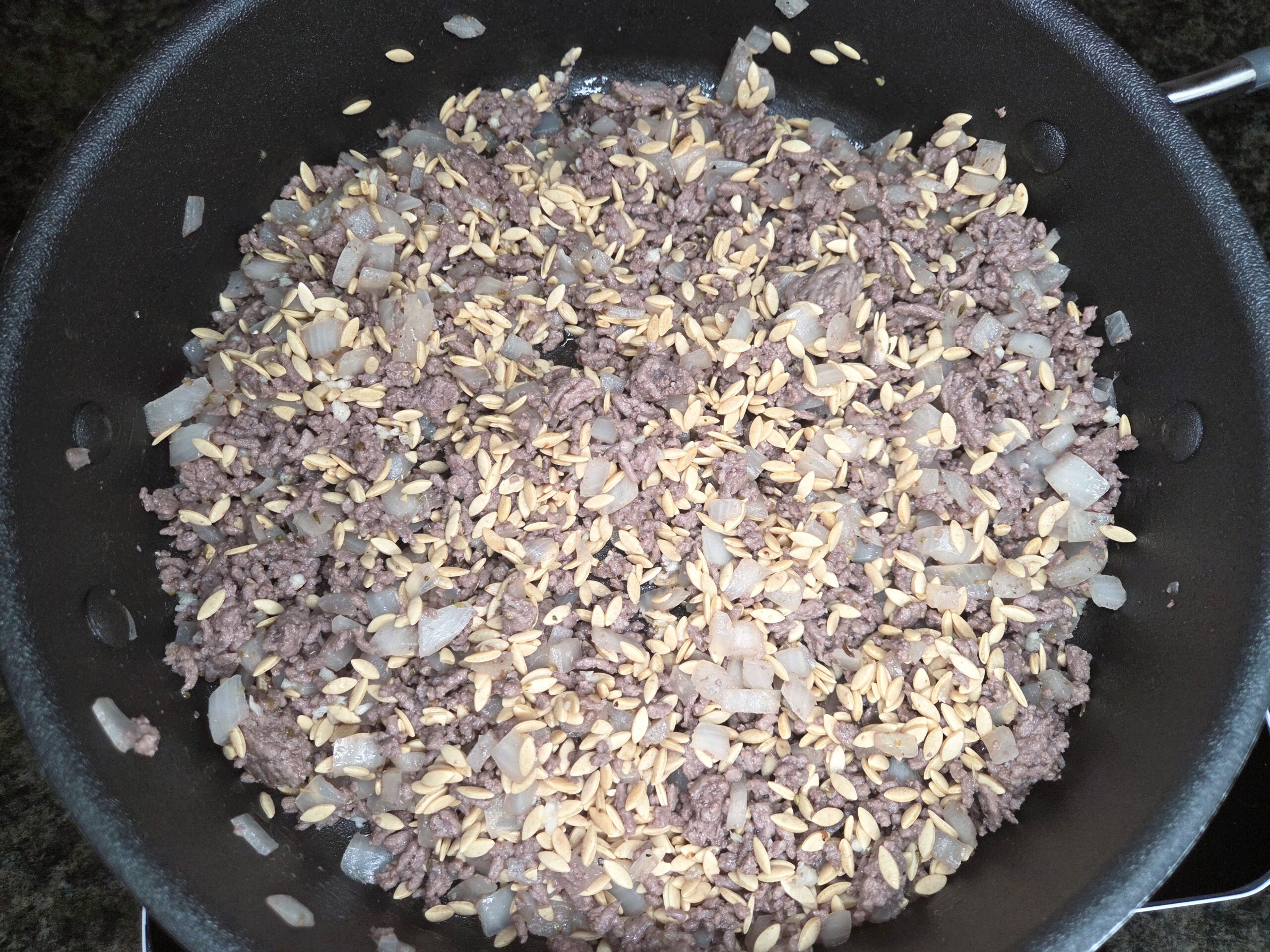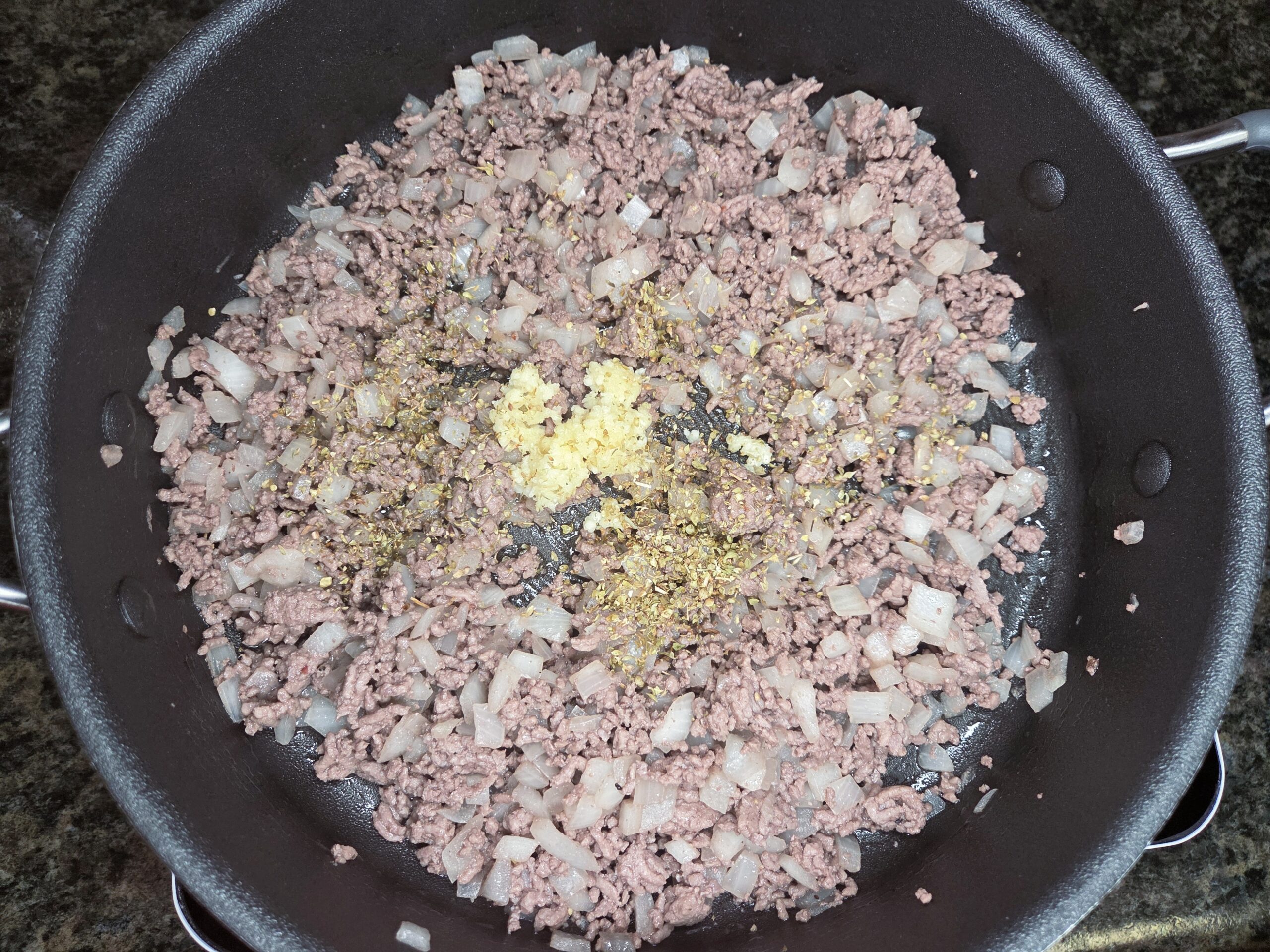 Cook the meat until no longer pink and drain any excess grease. Add 3 cloves of minced garlic, 1 teaspoon of dried oregano, salt, and pepper to taste, and cook just until fragrant, about 1-2 minutes.