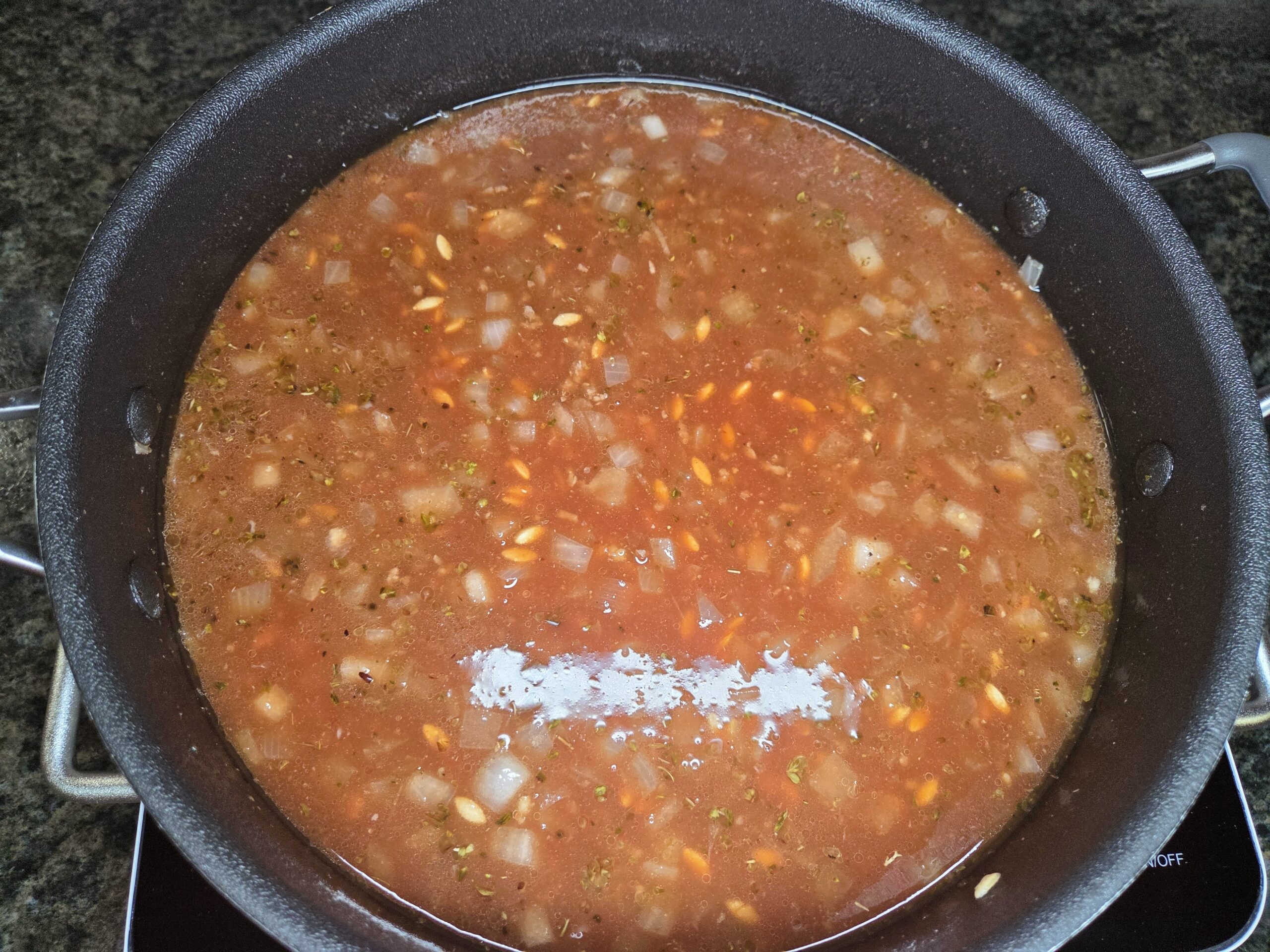 Add 3 cups of broth and 1 can of crushed tomatoes or tomato sauce; I used tomato sauce in the photos. Bring the mixture to a gentle boil, then reduce to a simmer and cook for 15 minutes.