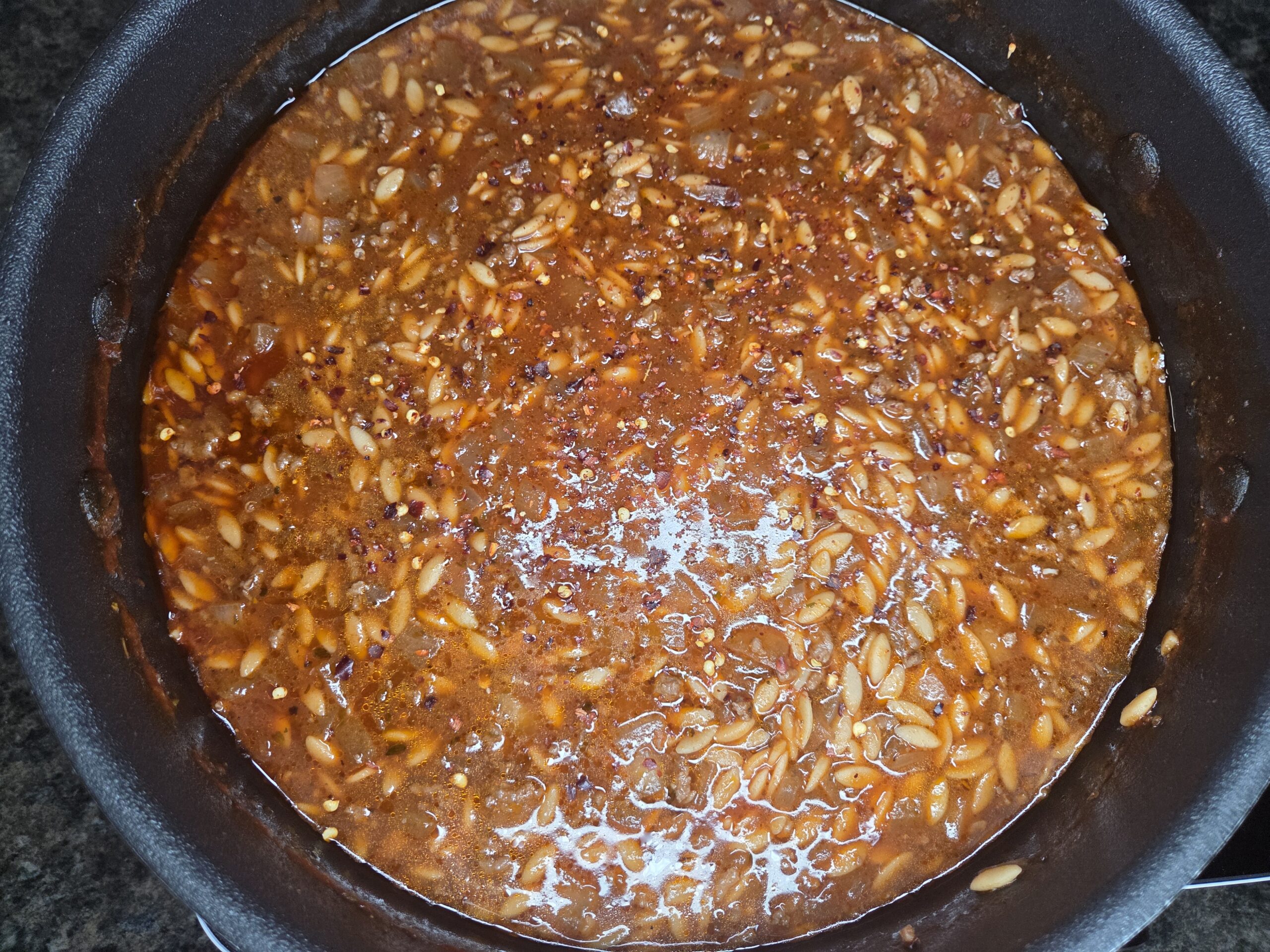 After the orzo has cooked and the sauce has thickened, give everything a good stir and check the texture. If the mixture looks too thick, splash in a little extra broth or water until it reaches the consistency you like. If it’s still a bit loose, let it simmer for a few more minutes so the orzo can absorb more liquid. Taste and adjust the seasoning with salt, pepper, and red pepper flakes if using. When the orzo is tender, and the sauce is rich and silky, remove it from the heat and let it rest for 5 minutes — this helps it thicken just a bit more. A sprinkle of grated cheese and parsley on top is a perfect finishing touch.