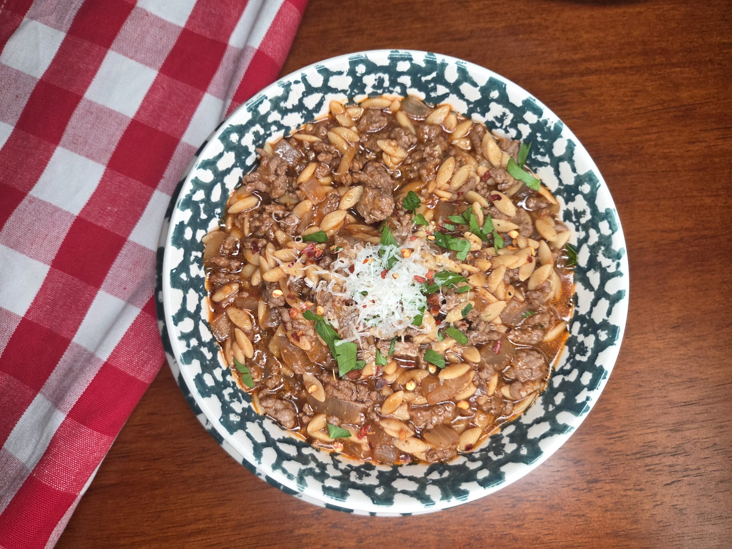 Easy One-Pot Manestra with orzo, ground beef, onions, herbs, and spices in a rich tomato sauce.