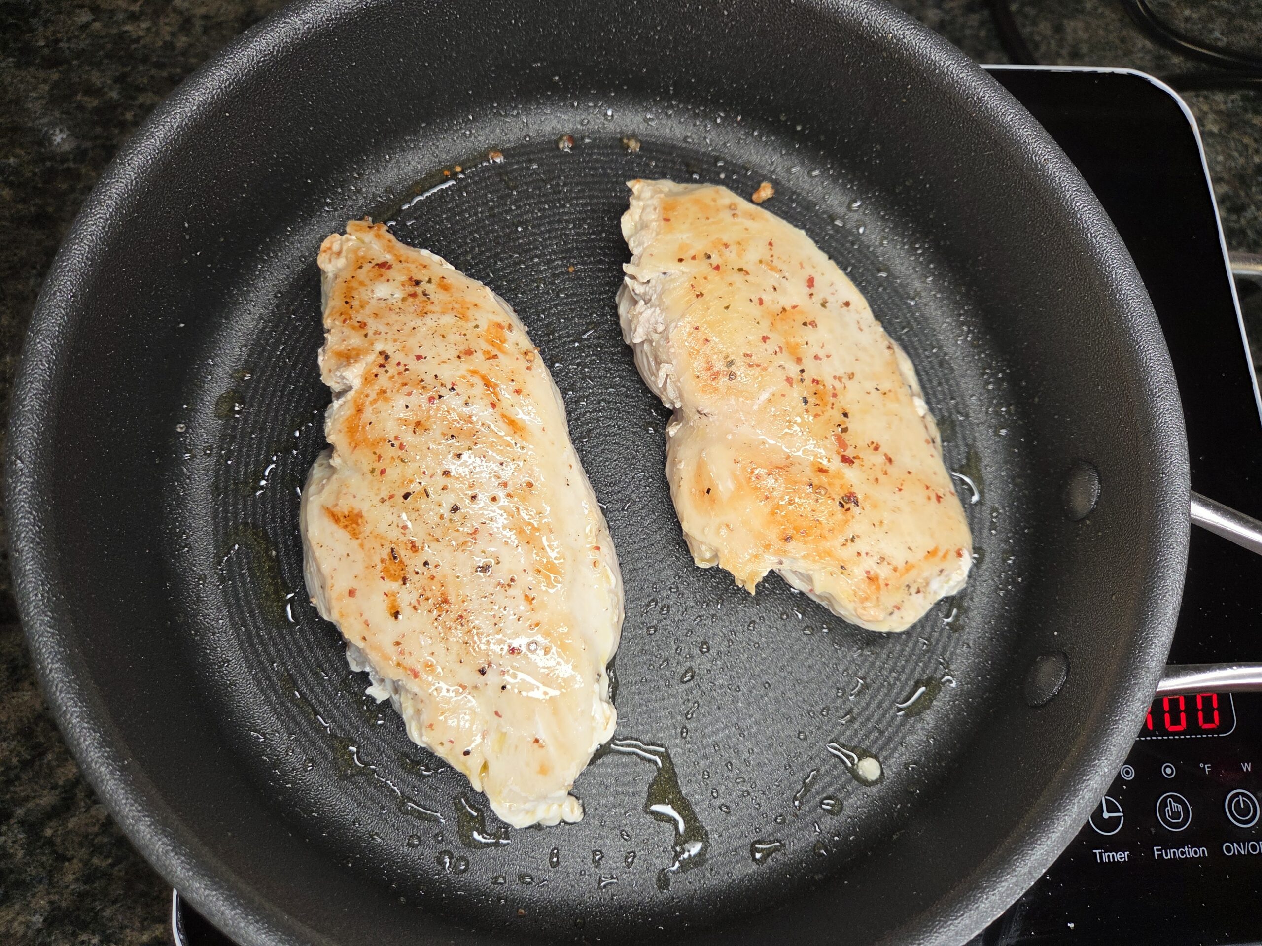 Pat chicken breasts dry with a paper towel this will help them brown, salt and pepper both sides.