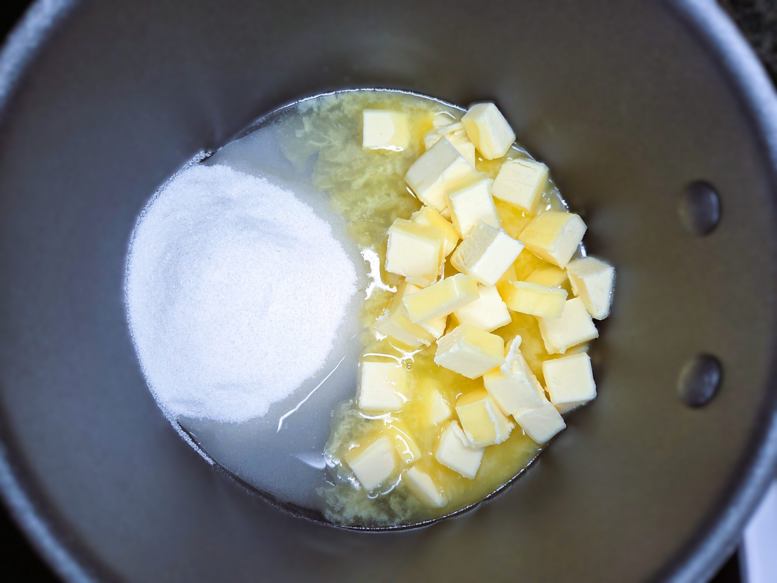 You will need a clean, ungreased metal baking sheet and a candy thermometer before you begin. In a heavy‑bottomed large saucepan (the saucepan in the photo is a 3-quart), combine 1 cup salted butter, 1 ¼ cups granulated sugar, and ¼ cup water.