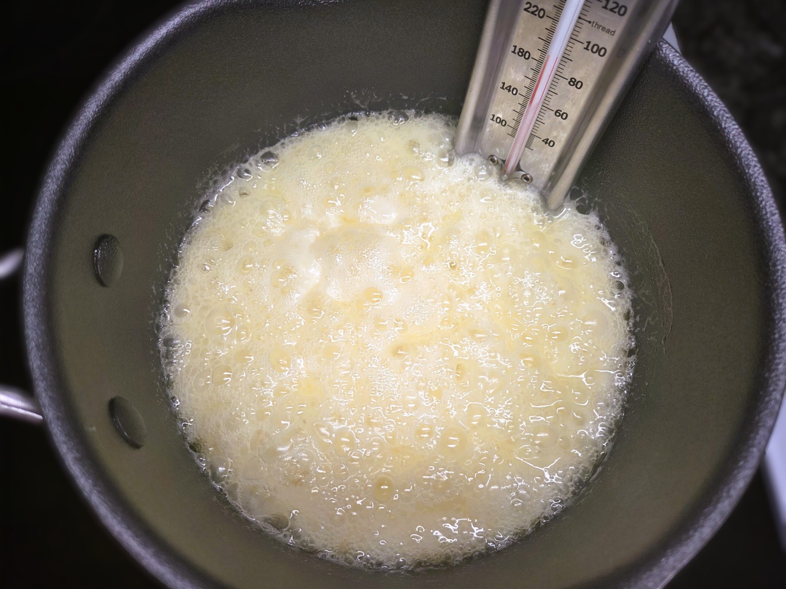 Stir quickly and constantly while cooking over medium heat, allowing the temperature to rise slowly. It is important not to rush this stage, as heating the mixture too quickly can cause the butter and sugar to separate. Keep the thermometer clipped to the pan and continue stirring until the mixture cooks evenly.