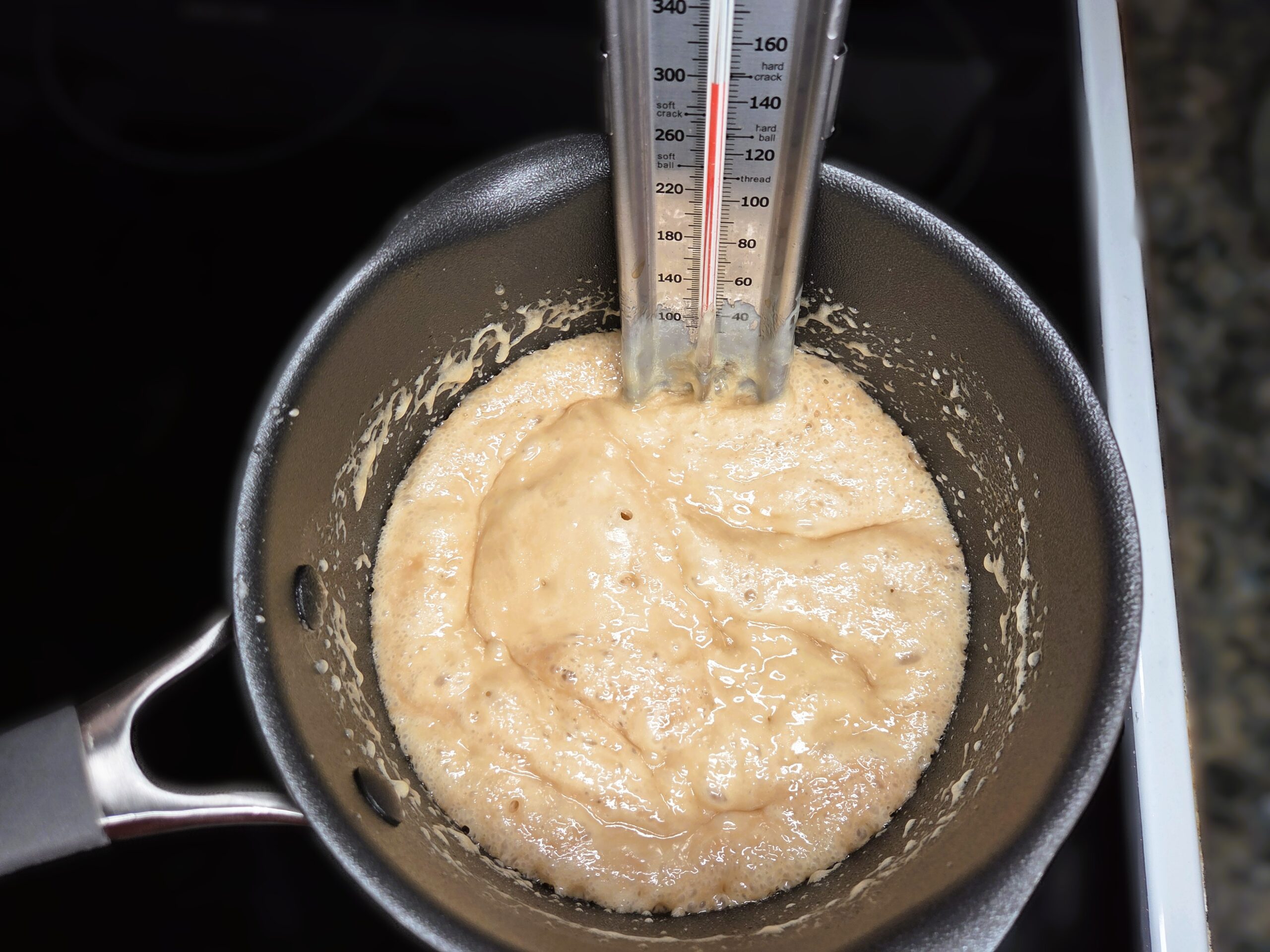 Continue cooking the mixture until it reaches 300–305°F, the hard-crack stage. Once the thermometer registers this temperature, stir in 1 teaspoon of vanilla extract. My candy thermometer shows the hard crack stage at 300 degrees, which is foolproof.