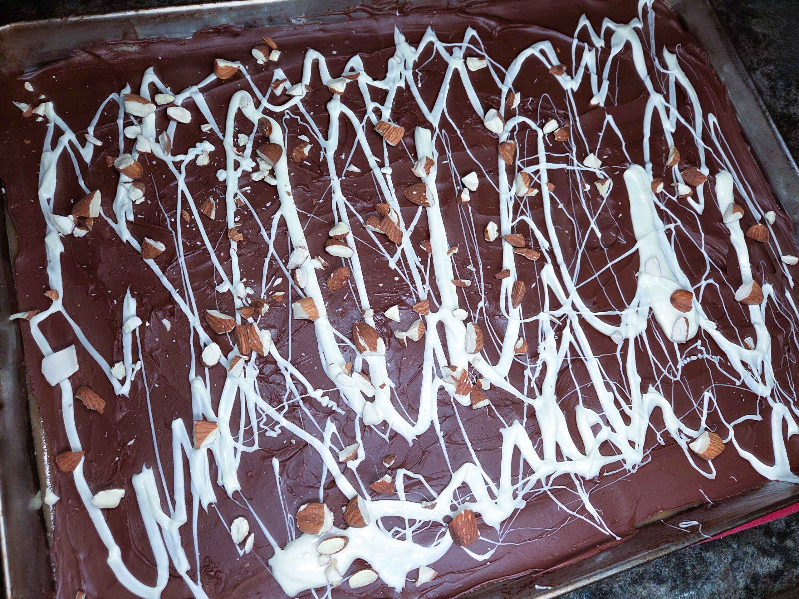 Spread the melted semi‑sweet chocolate evenly across the cooled toffee, then drizzle the white chocolate decoratively over the top. Finish by scattering the almonds across the chocolate layer and lightly pressing them into the chocolate with a spatula before the chocolate sets completely. This method will give you lovely clean layers of toffee, chocolate and almonds. Once fully set, break the English toffee into pieces and enjoy right away or wrap them up as sweet gifts.