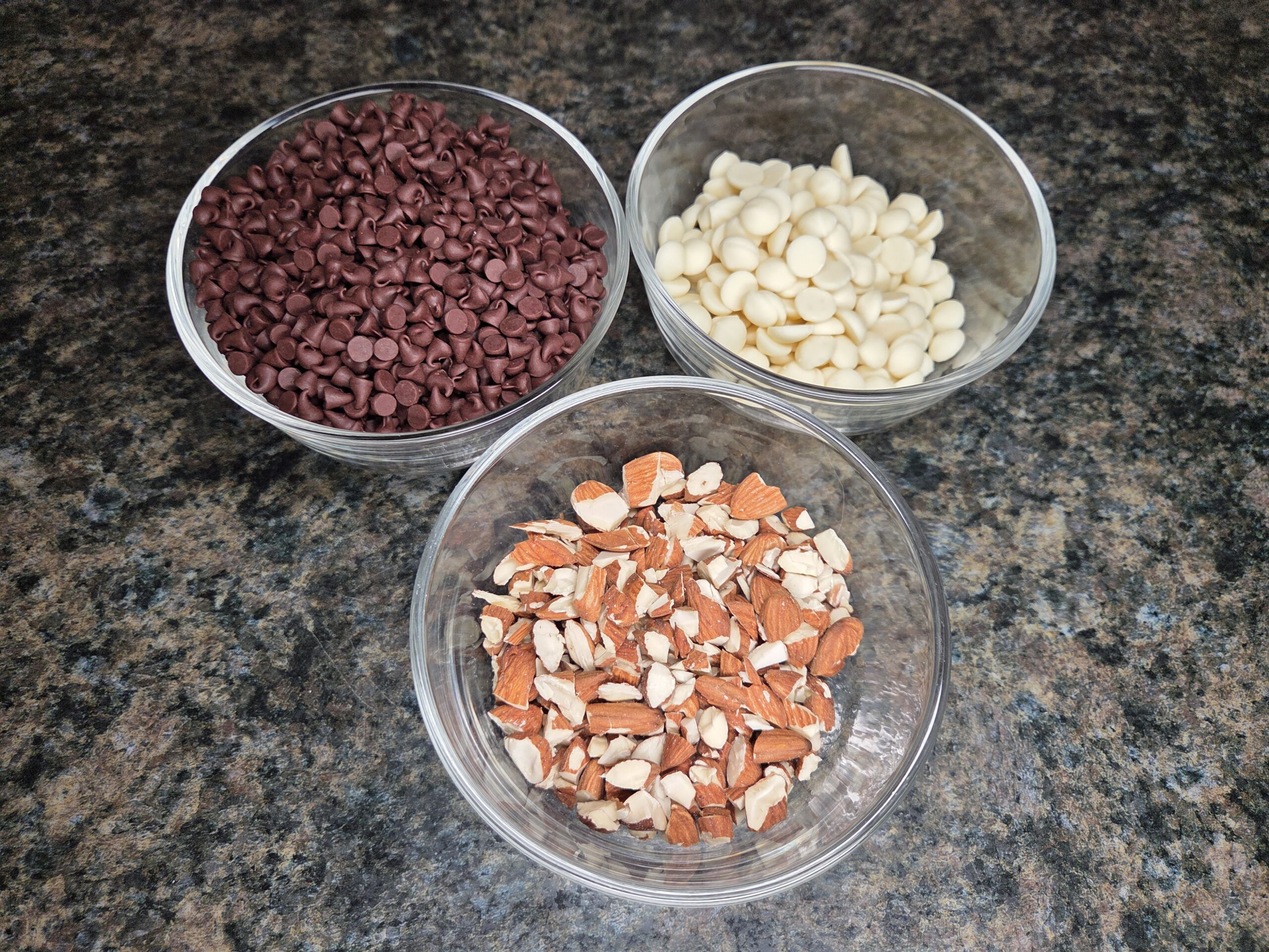 Once the toffee has chilled and become firm, prepare the chocolate layers. Melt 2 cups of semi‑sweet chocolate in a medium microwave‑safe bowl, heating in 30‑second intervals and stirring until smooth. In a separate small bowl, melt ½ cup of white chocolate using the same method. Have the toasted, chopped almonds ready to sprinkle over the surface.