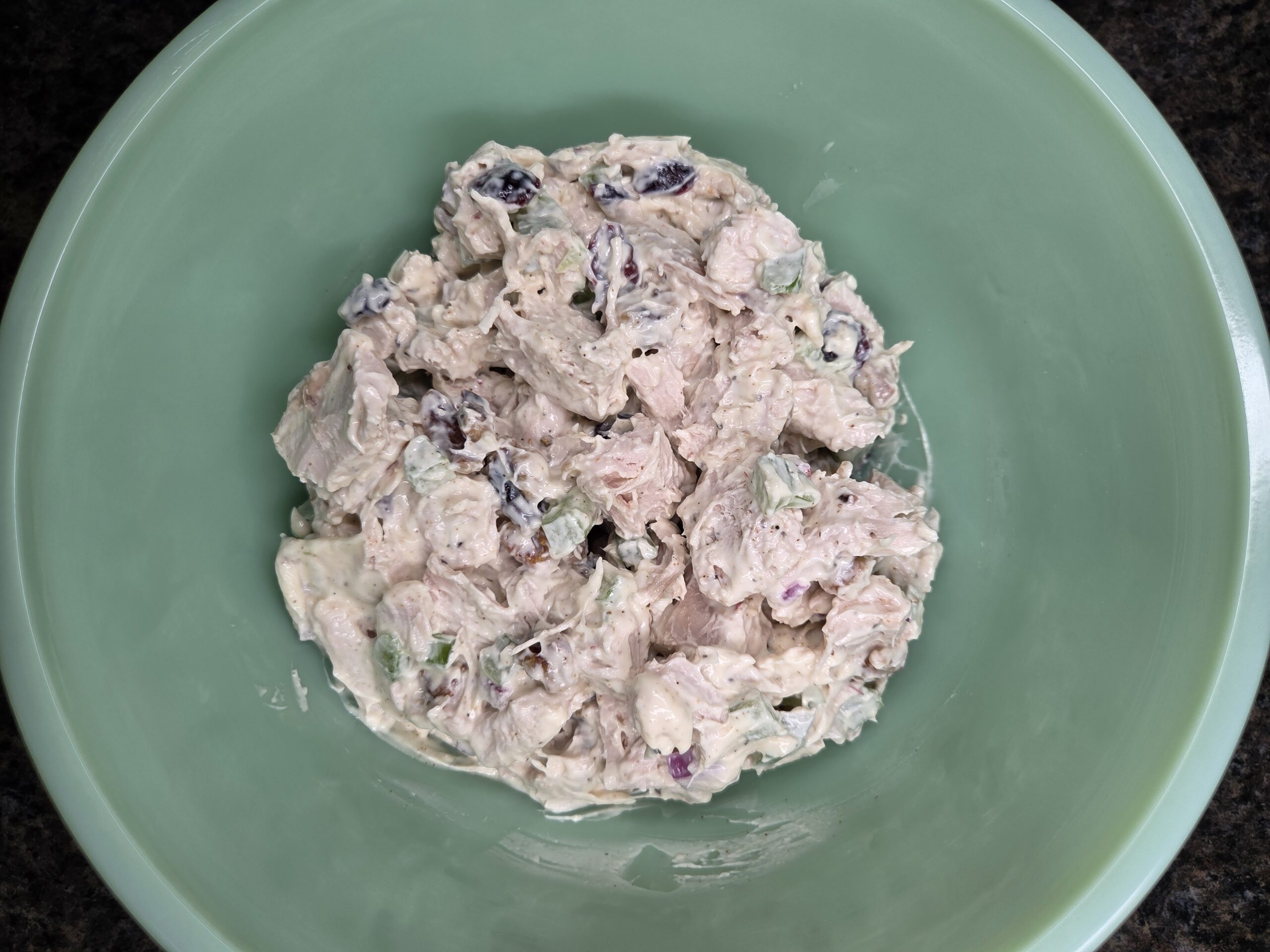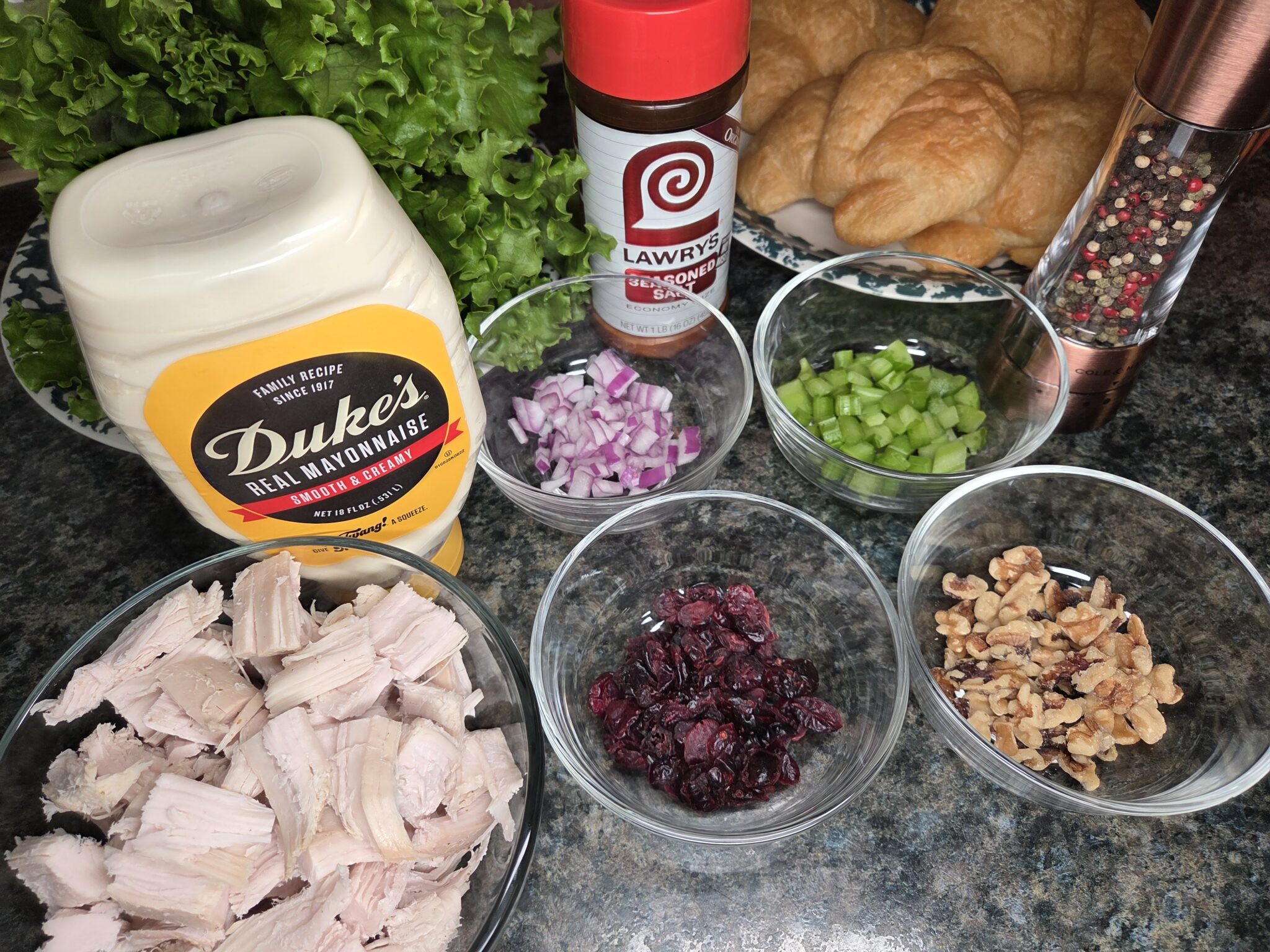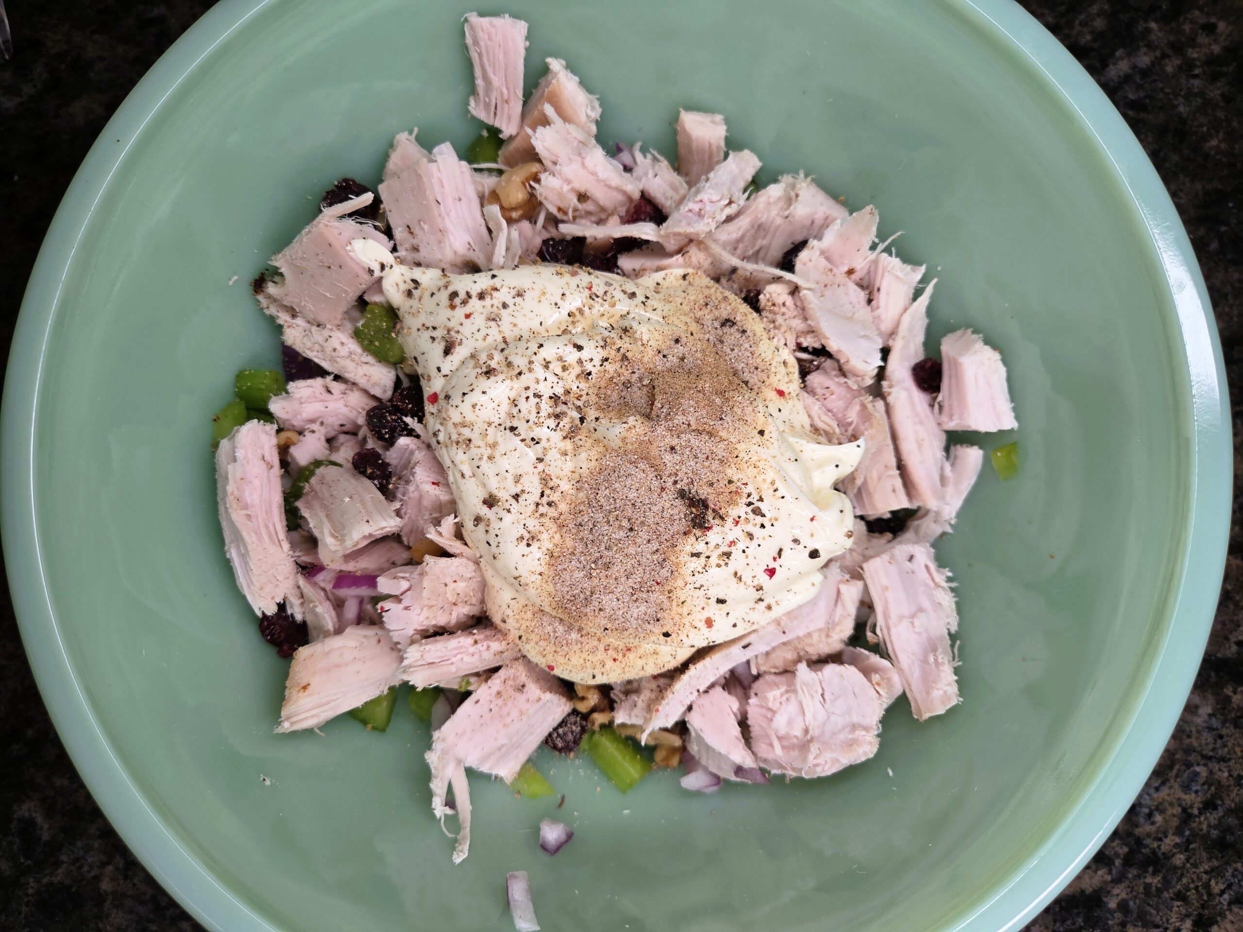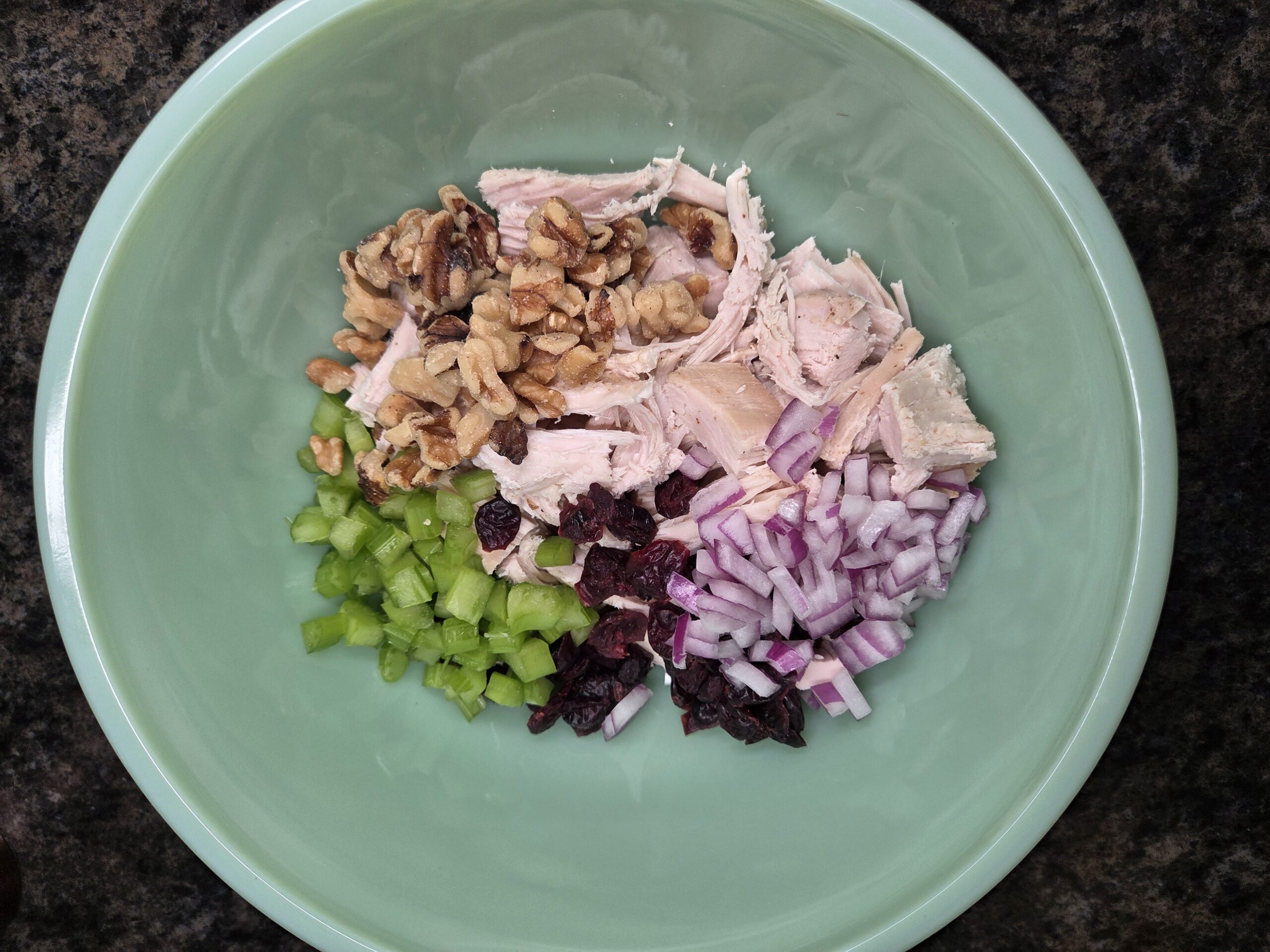 Combine diced turkey, cranberries, walnuts, red onions and celery in a bowl.