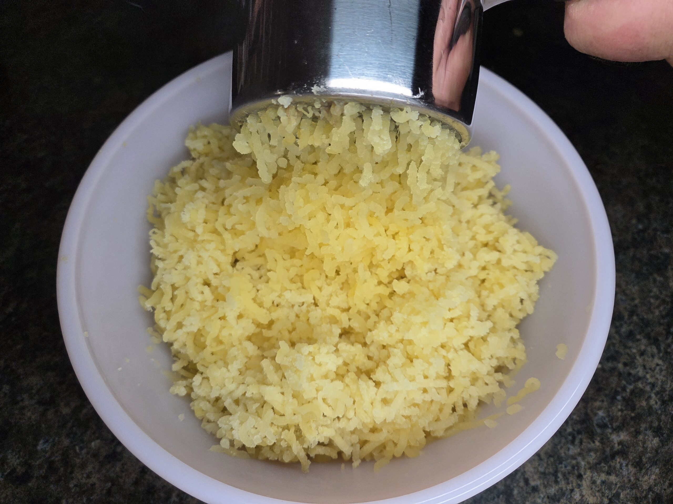 Peel and boil 2 pounds of potatoes in salted water until fork-tender. If you're using a potato ricer, you can skip peeling; simply press the cooked potatoes through, and the skins will stay behind.
