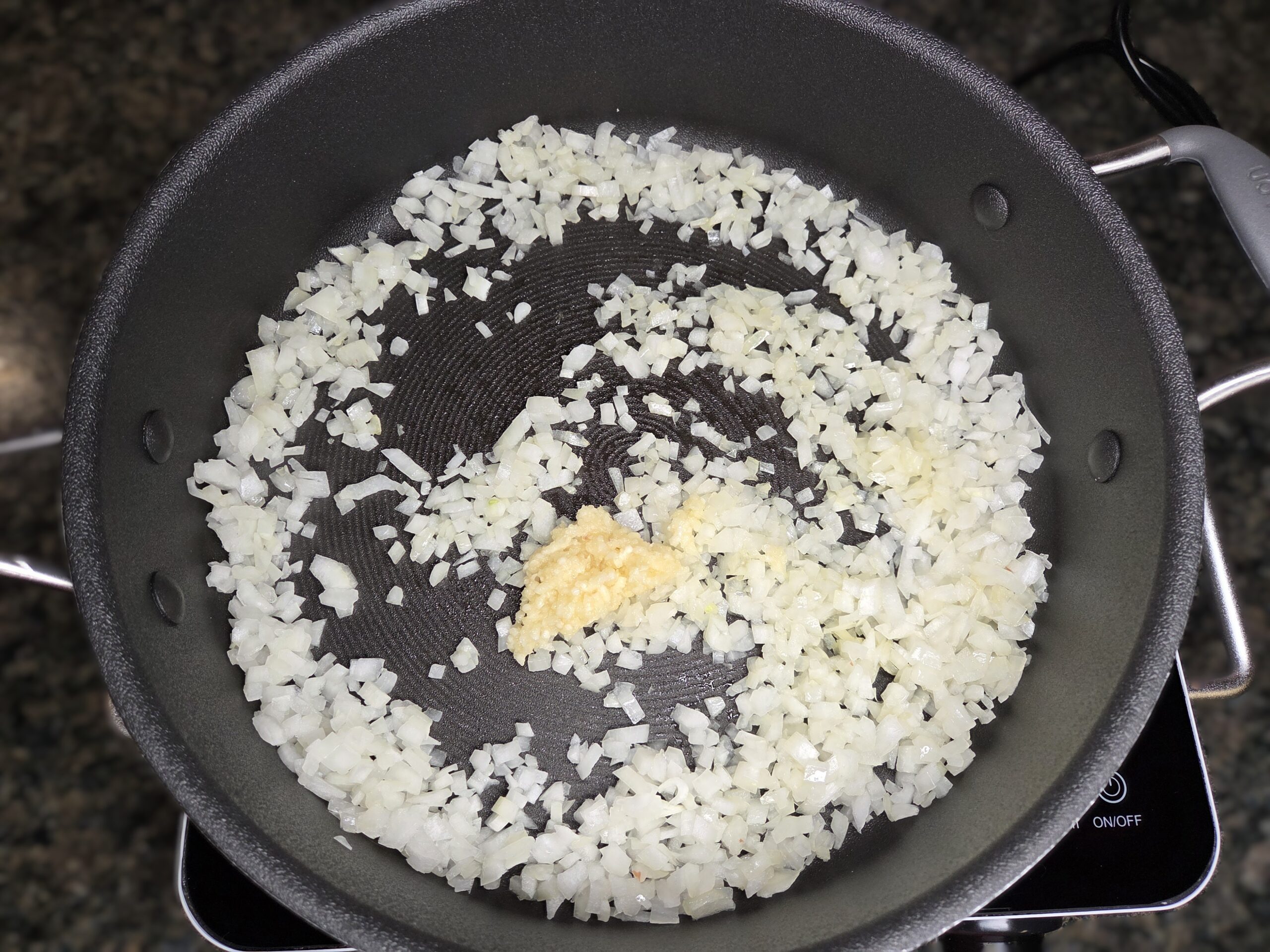 In a large skillet or pot, heat 2 tablespoons of extra‑virgin olive oil over medium heat. Add 1 small finely diced yellow onion and sauté for 4–5 minutes, until softened. Stir in 4 minced garlic cloves and cook for another 1–2 minutes, just until fragrant.
