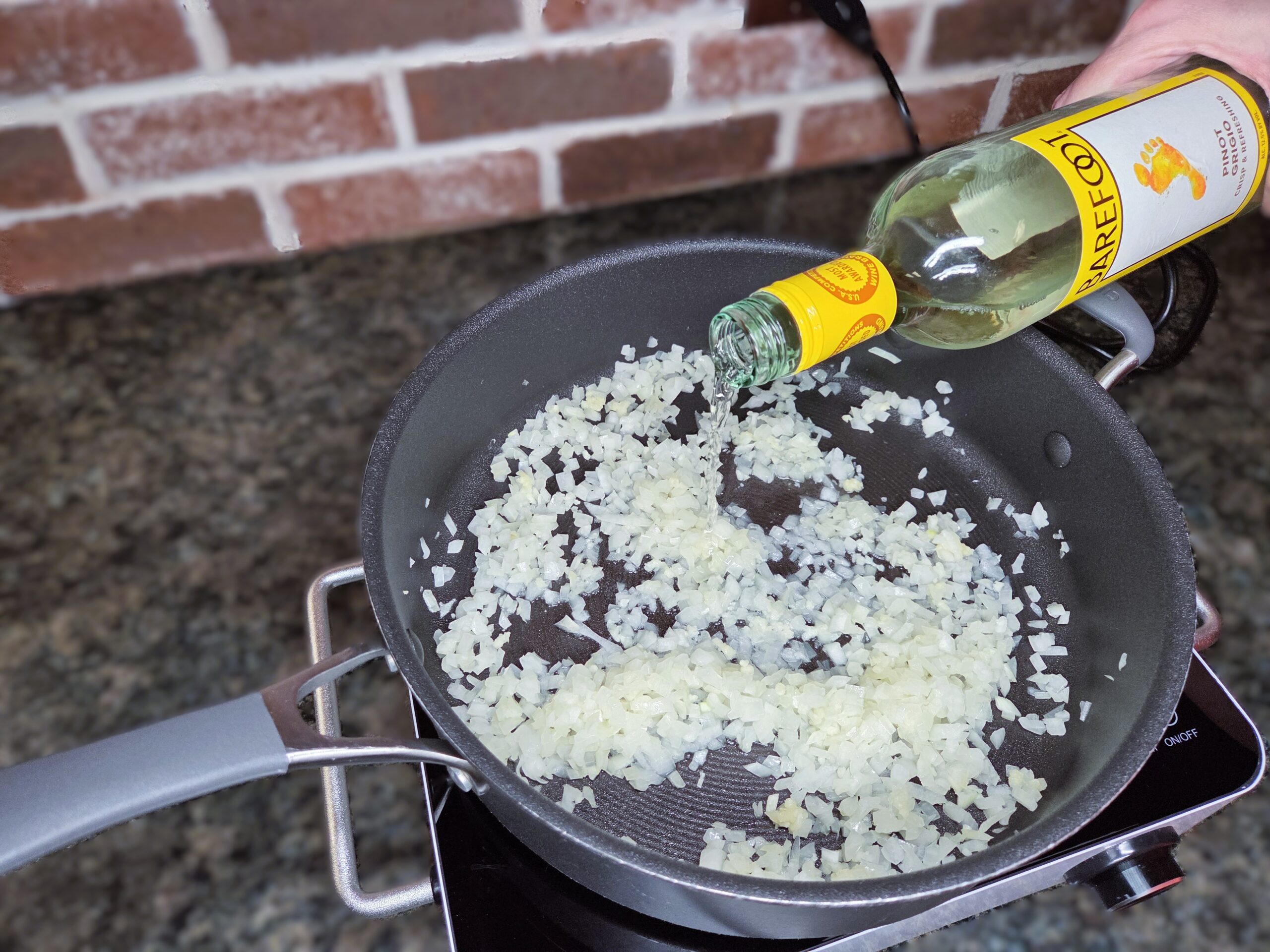 Add ½ cup of liquid to the skillet and let it cook for 1–2 minutes. I used Pinot Grigio, but water, vegetable broth, or red wine all work well.