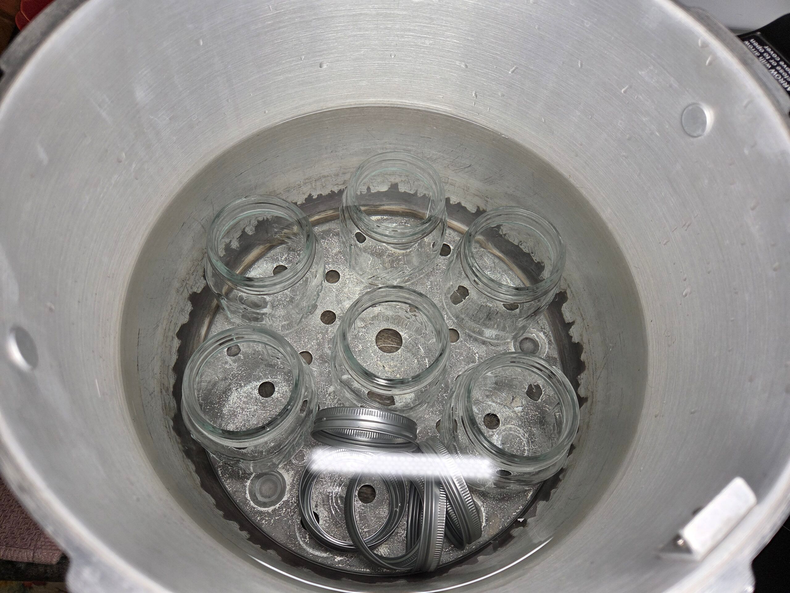 Wash the jars, lids, and bands in warm, soapy water and rinse well. Place the jars right side up in a boiling‑water canner fitted with a rack. Do not boil lids. Add warm water until it covers the jars by about 1 inch. Bring the water to a boil and boil the jars for 10 minutes if you are below 1,000 feet elevation; add 1 minute of boiling time for every additional 1,000 feet. Reduce the heat and keep the jars hot until you’re ready to fill them.