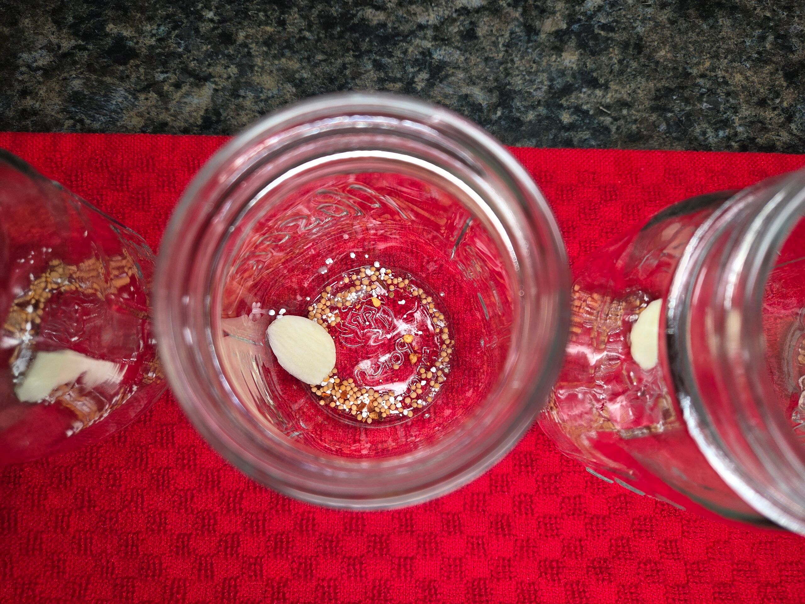 Working quickly, remove the jars from the canner and set them on a towel. If it is easiest for you to pack one at a time or an assembly line, do what is comfortable for you. Add 1/8 teaspoon of pickle crisp to the bottoms of each jar, 1/8 teaspoon of mustard seed,1 slice of garlic clove, and 1/16 teaspoon red pepper flakes if using.