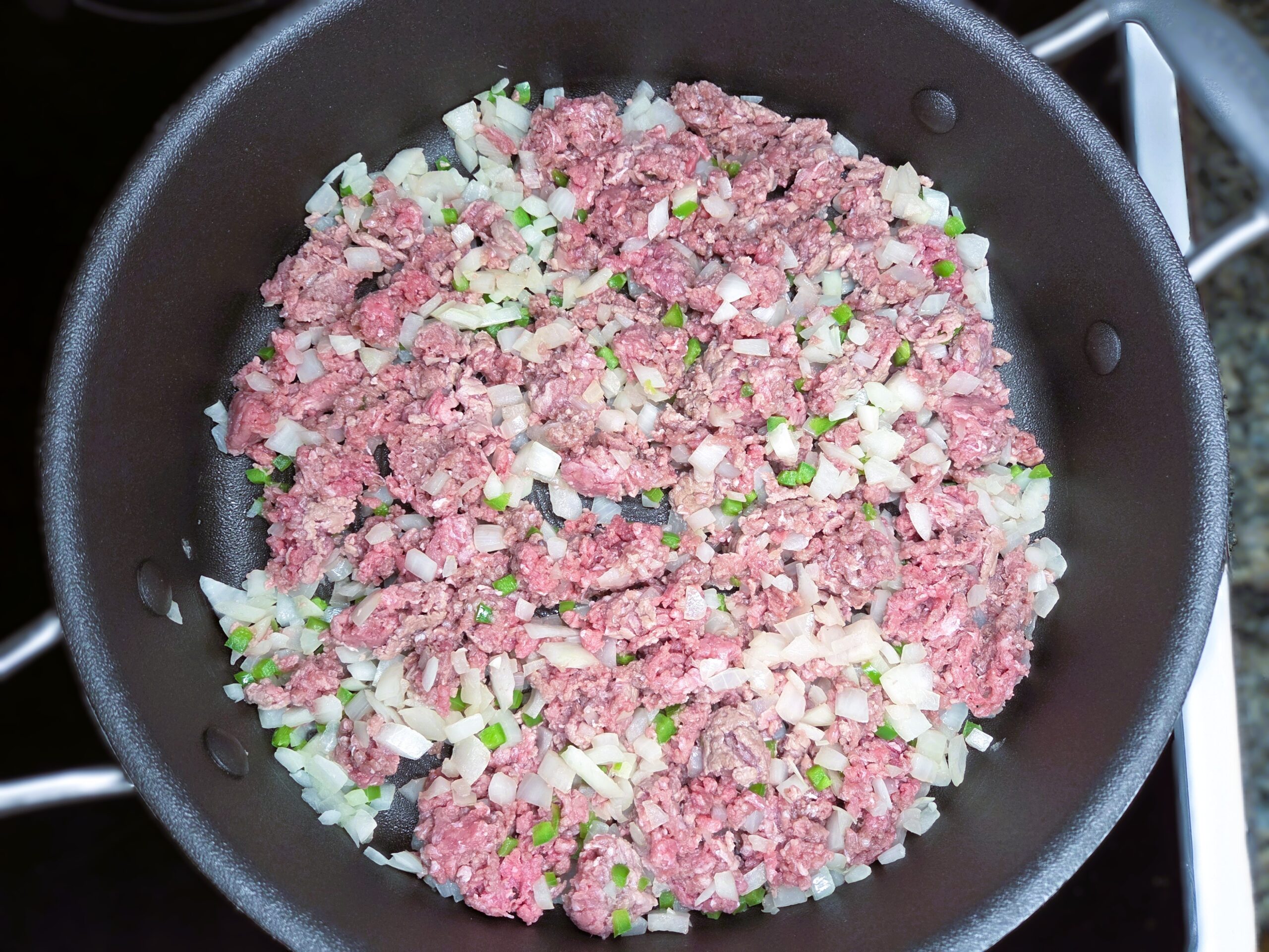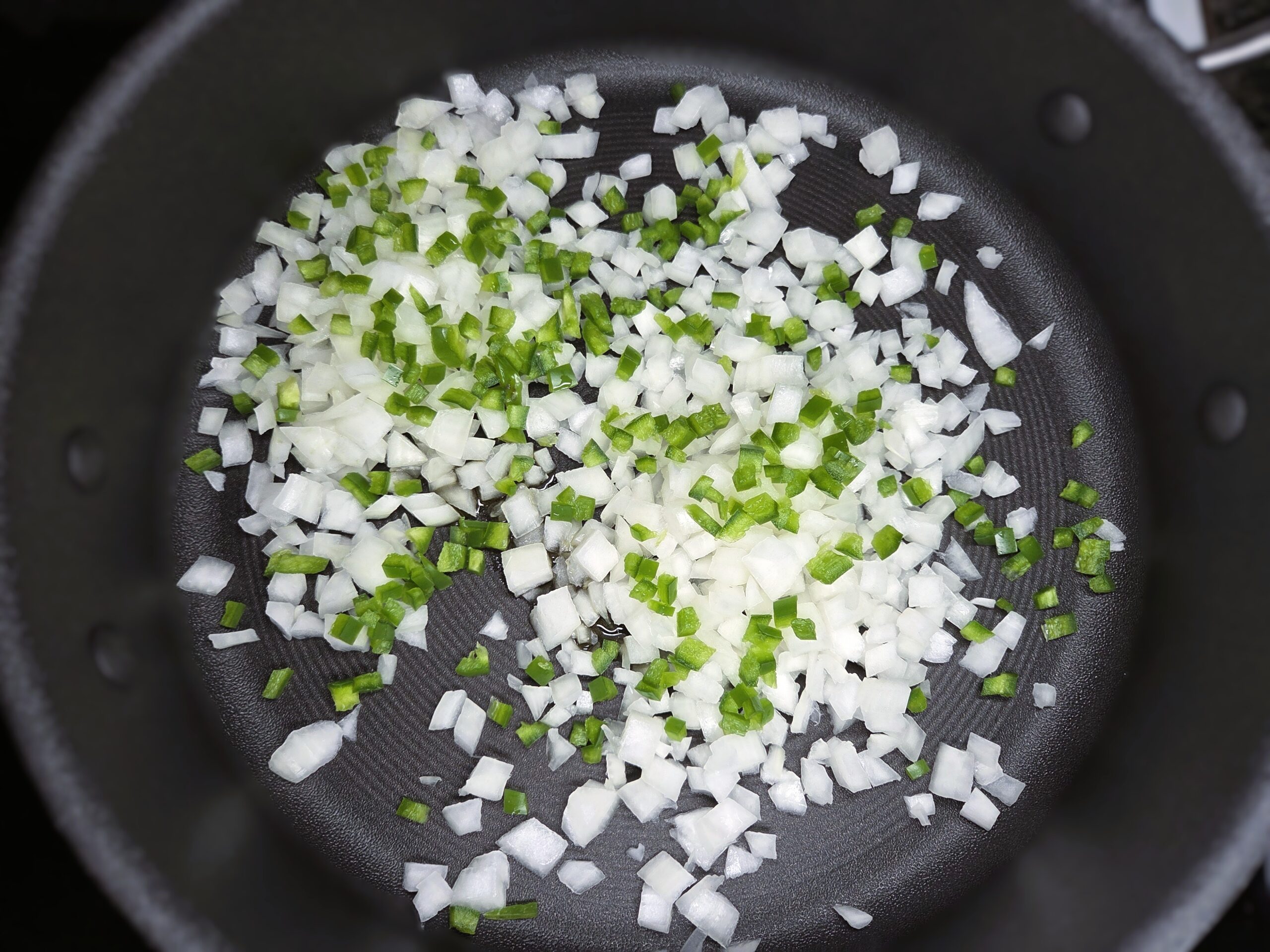 Stem, seed, and finely dice two jalapeƱo peppers. Dice one yellow onion. Heat a tablespoon of olive or vegetable oil in a large skillet over medium heat. Add the diced jalapeƱos and onion, and sautƩ for about 5-6 minutes until the vegetables soften.