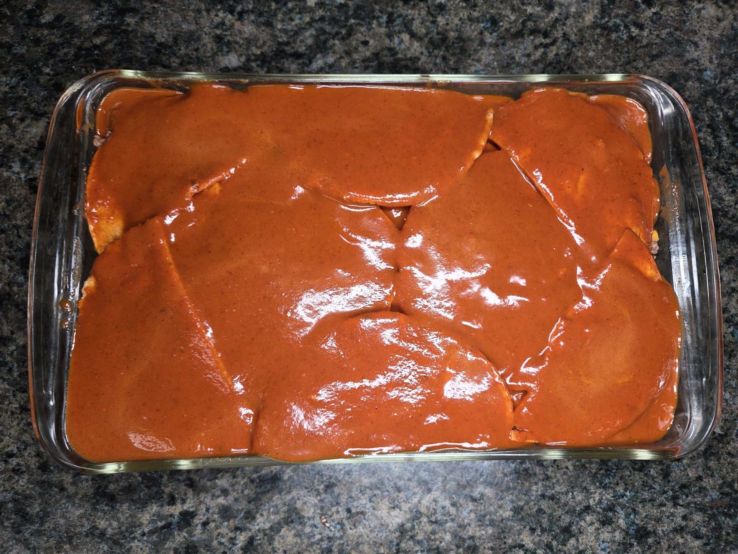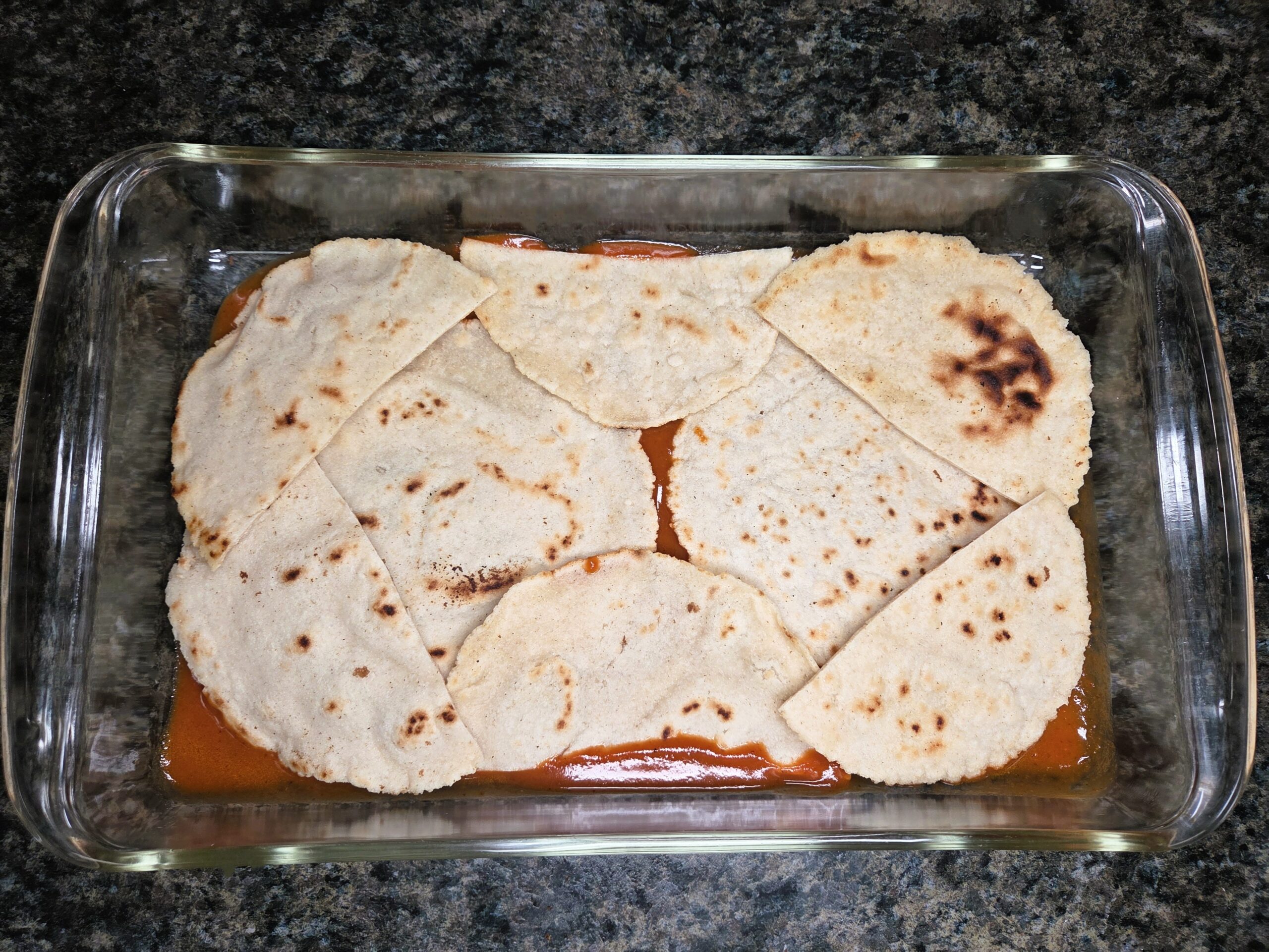 Spread 1/2 cup of enchilada sauce evenly across the bottom of a 2-quart baking dish. Line the bottom of the dish with 5 corn tortillas, using two whole ones and 3 cut in half and trimmed to fit the dish.