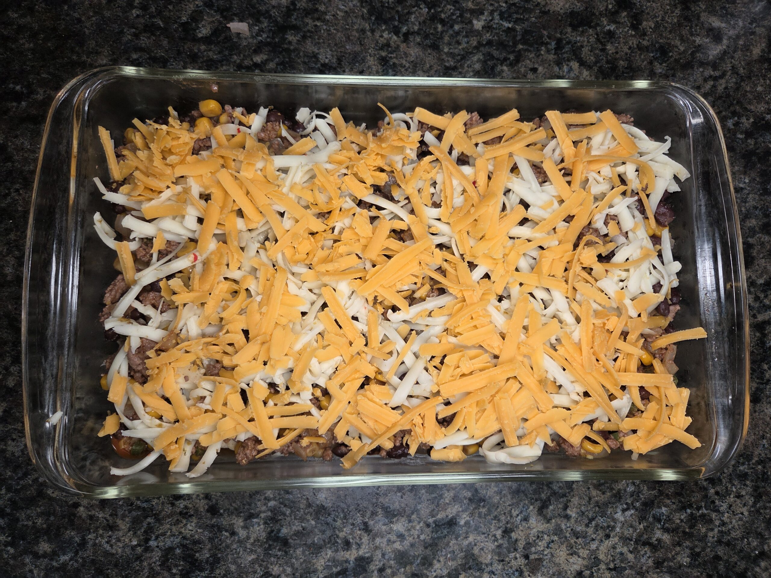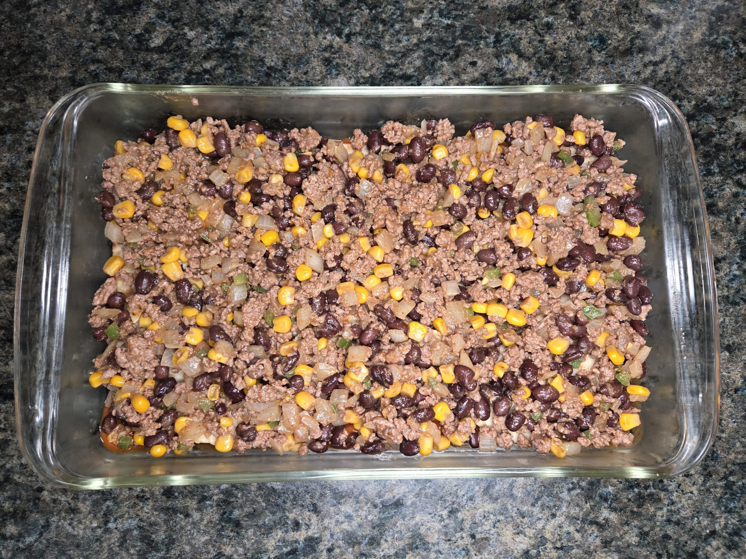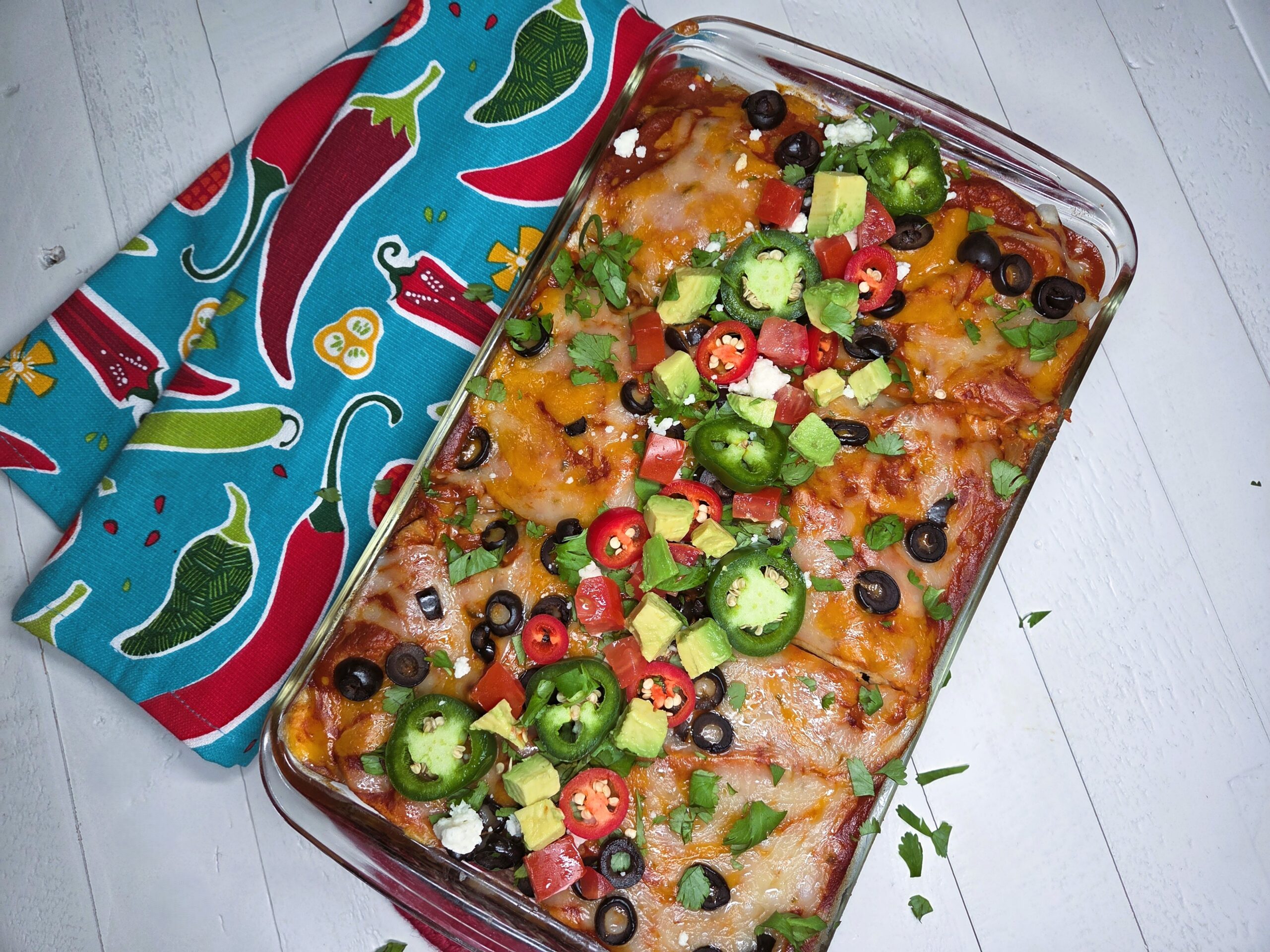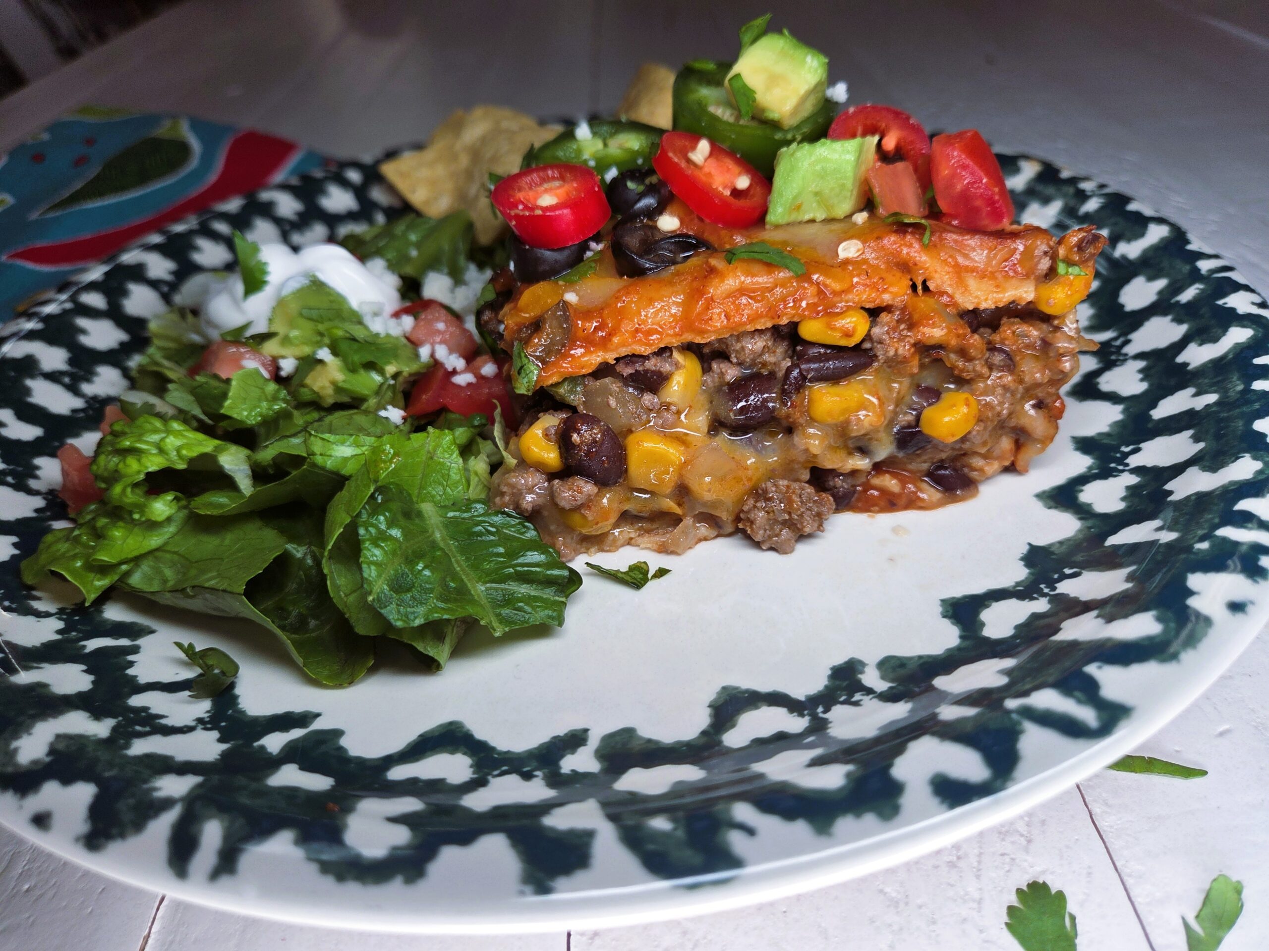 Layers of perfectly seasoned ground beef, tender corn tortillas, rich red enchilada sauce, fire-roasted sweet corn, spicy jalapeƱos, and melty cheddar-pepper jack cheese come together in a casserole that’s pure southwestern soul food — finished with a vibrant topping of fresh jalapeƱo, cilantro, queso fresco, creamy avocado, and juicy diced tomatoes.