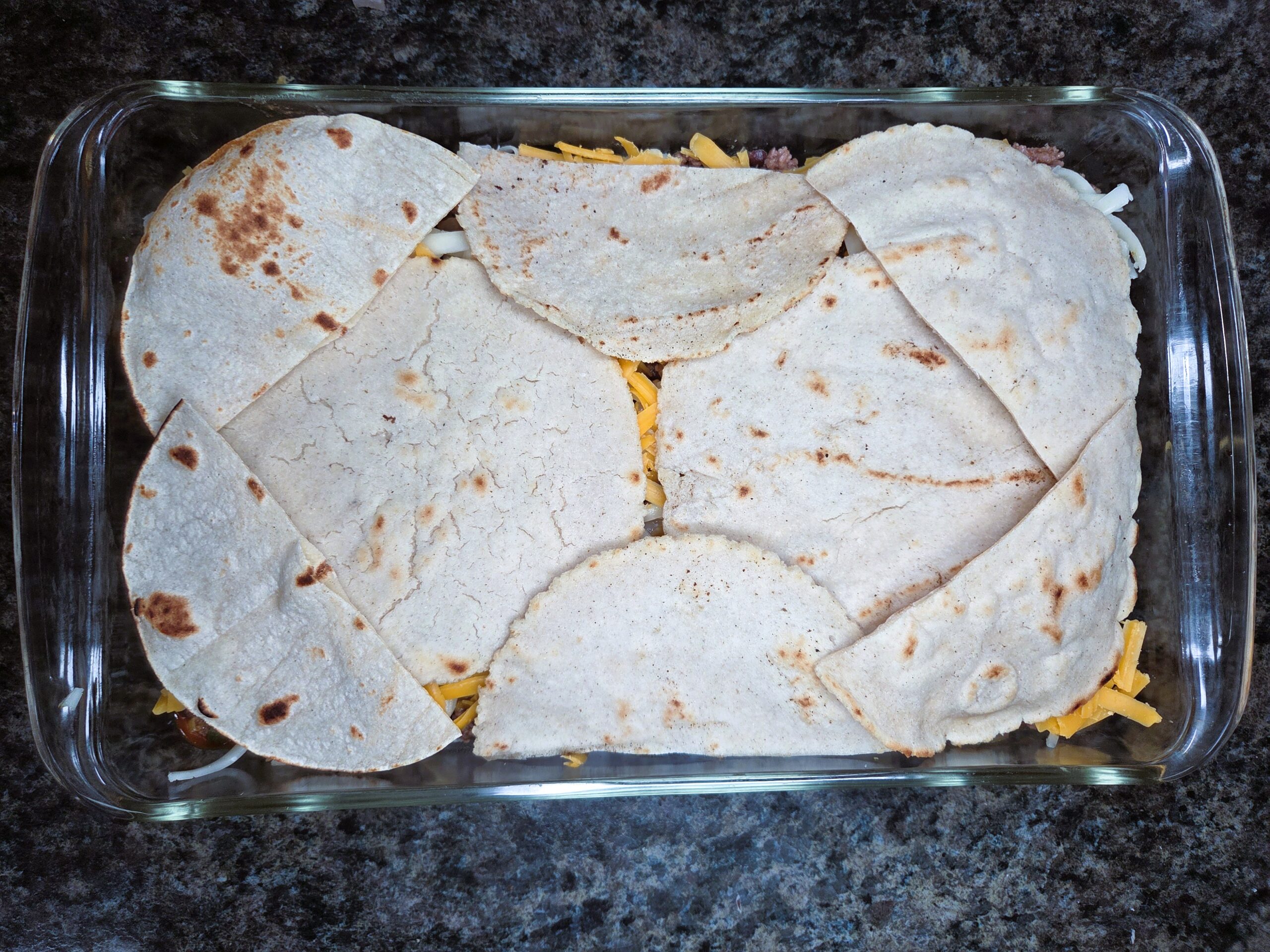 Layer the remaining tortillas over the cheese layers, placing two whole tortillas in the center and three halved tortillas trimmed to fit around them.