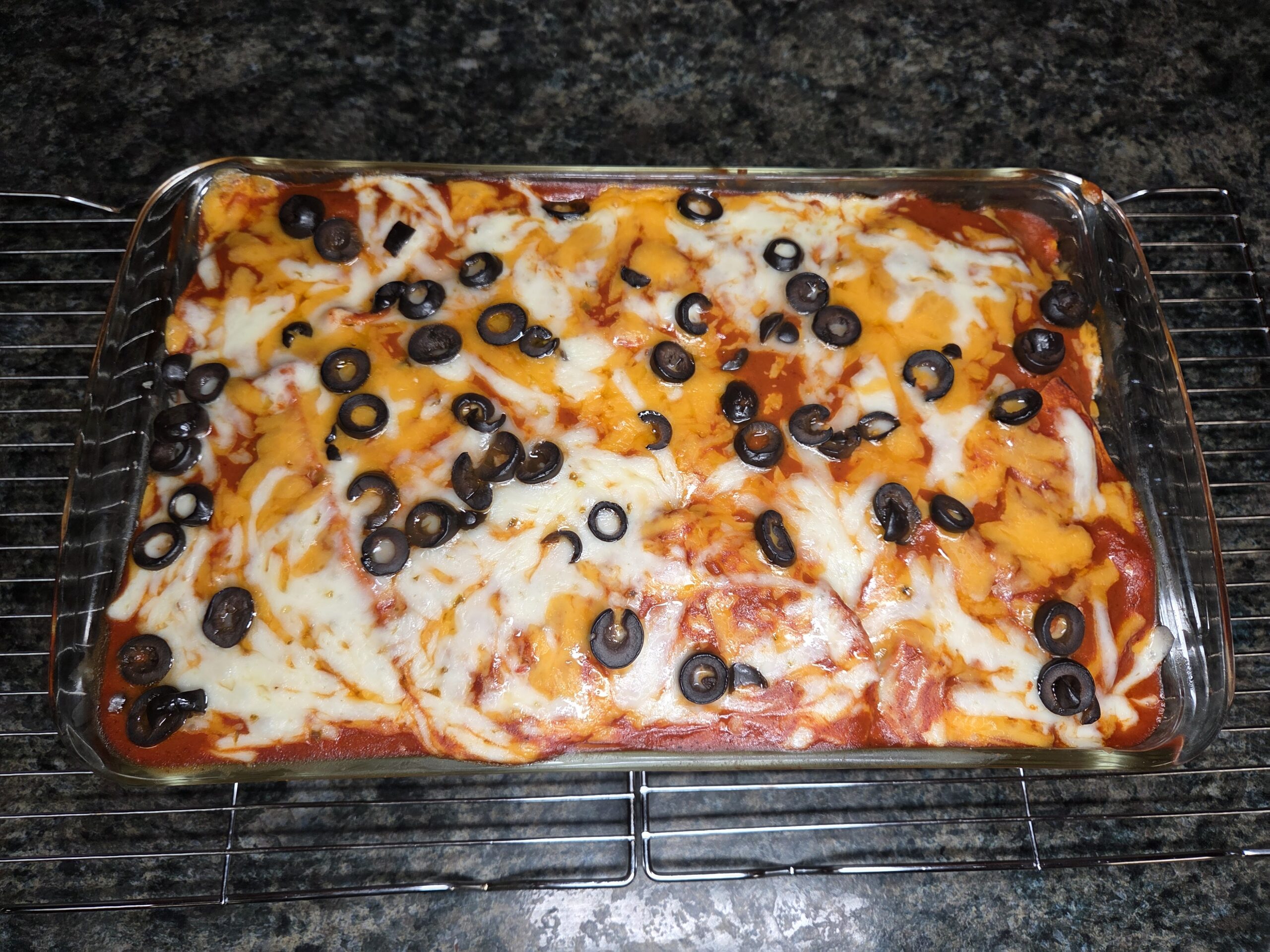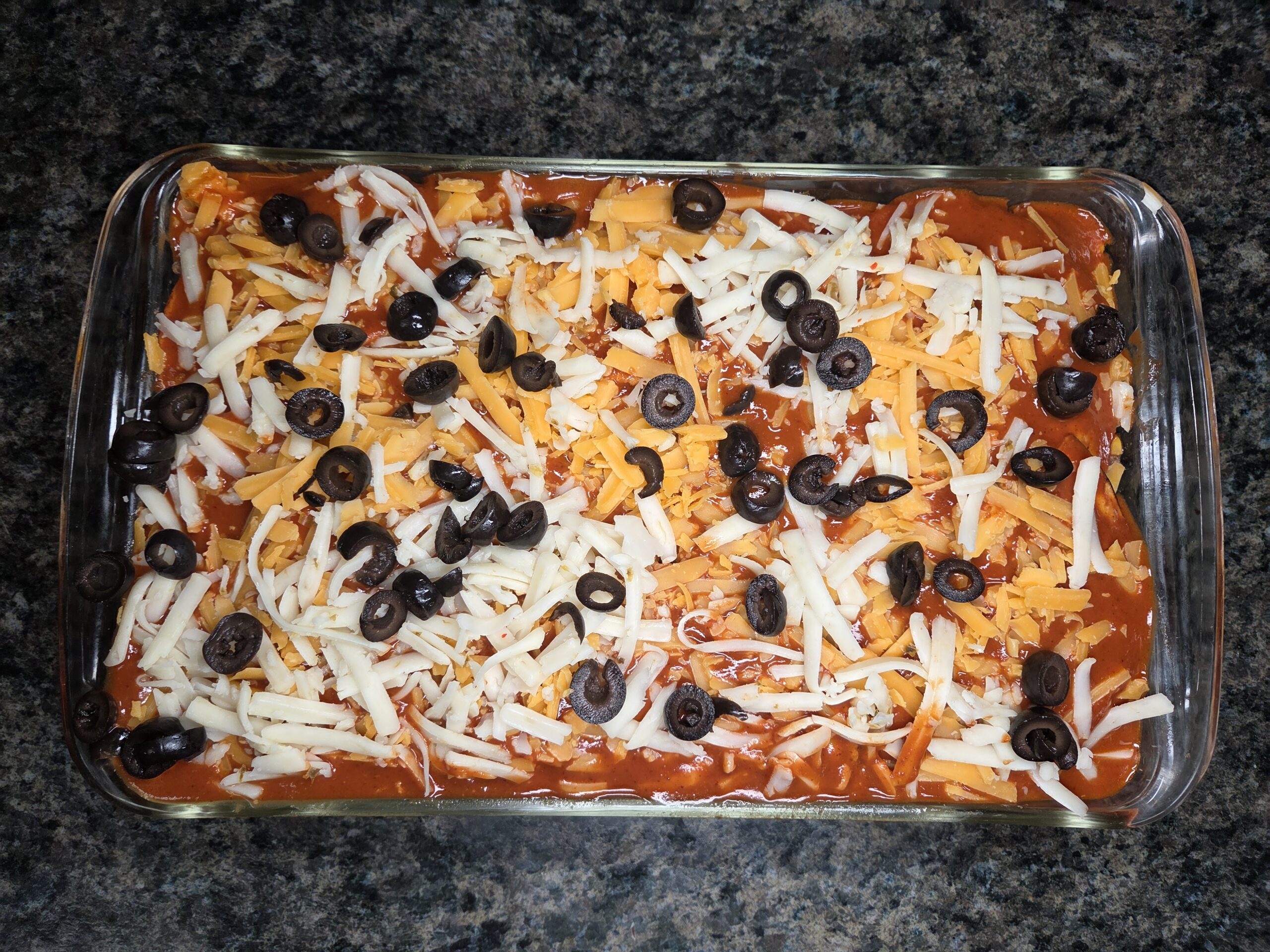 Sprinkle all the remaining pepper jack cheese and cheddar cheese evenly over the top of the casserole and add half of the black olives on top.