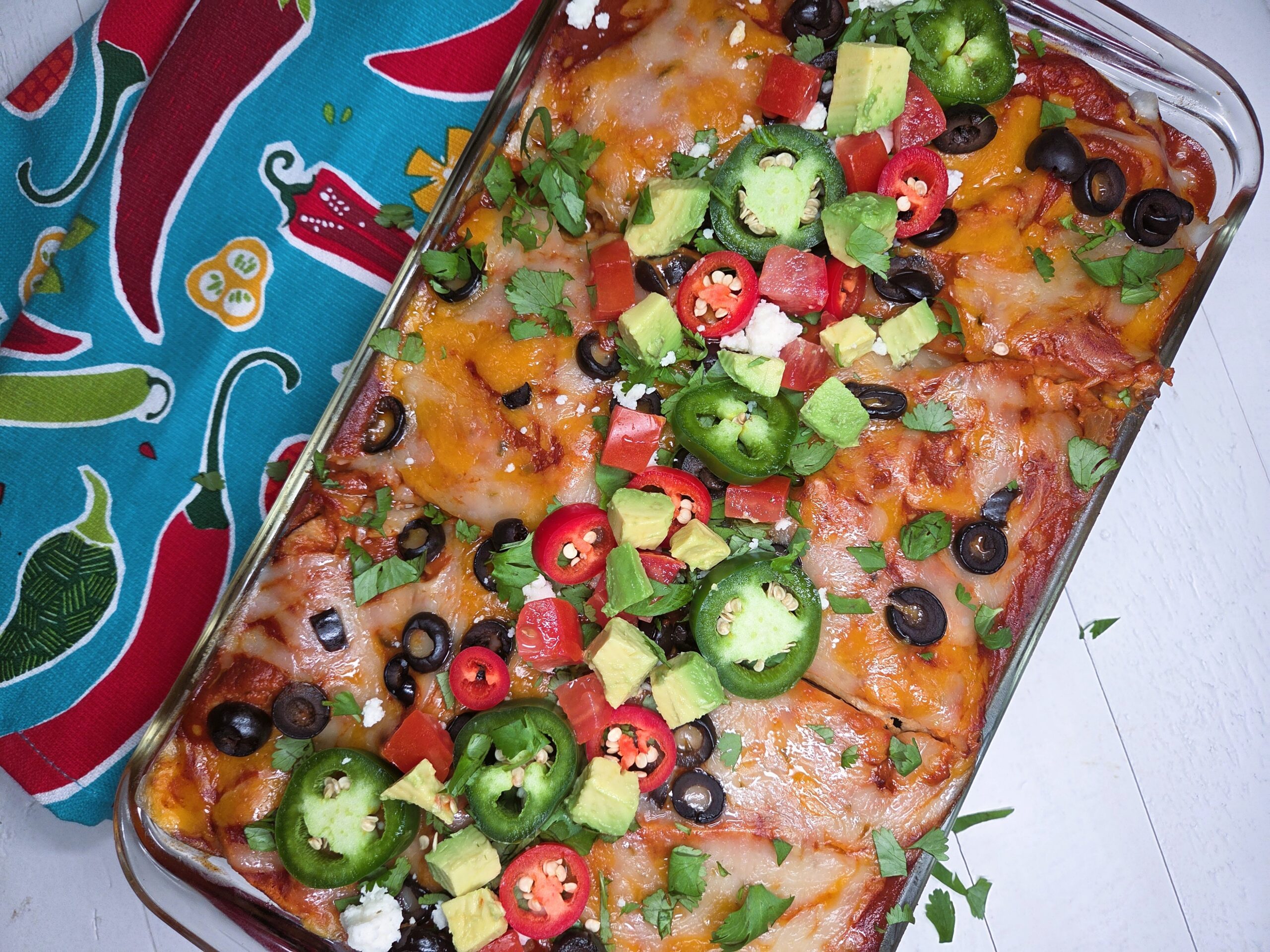 Once the Enchilada Casserole is baked, let it cool for 15 minutes before cutting it into your preferred portions. Top it off with fresh cilantro, jalapeƱo slices, diced avocado, chopped tomatoes, crumbled queso fresco, and the remaining black olives.