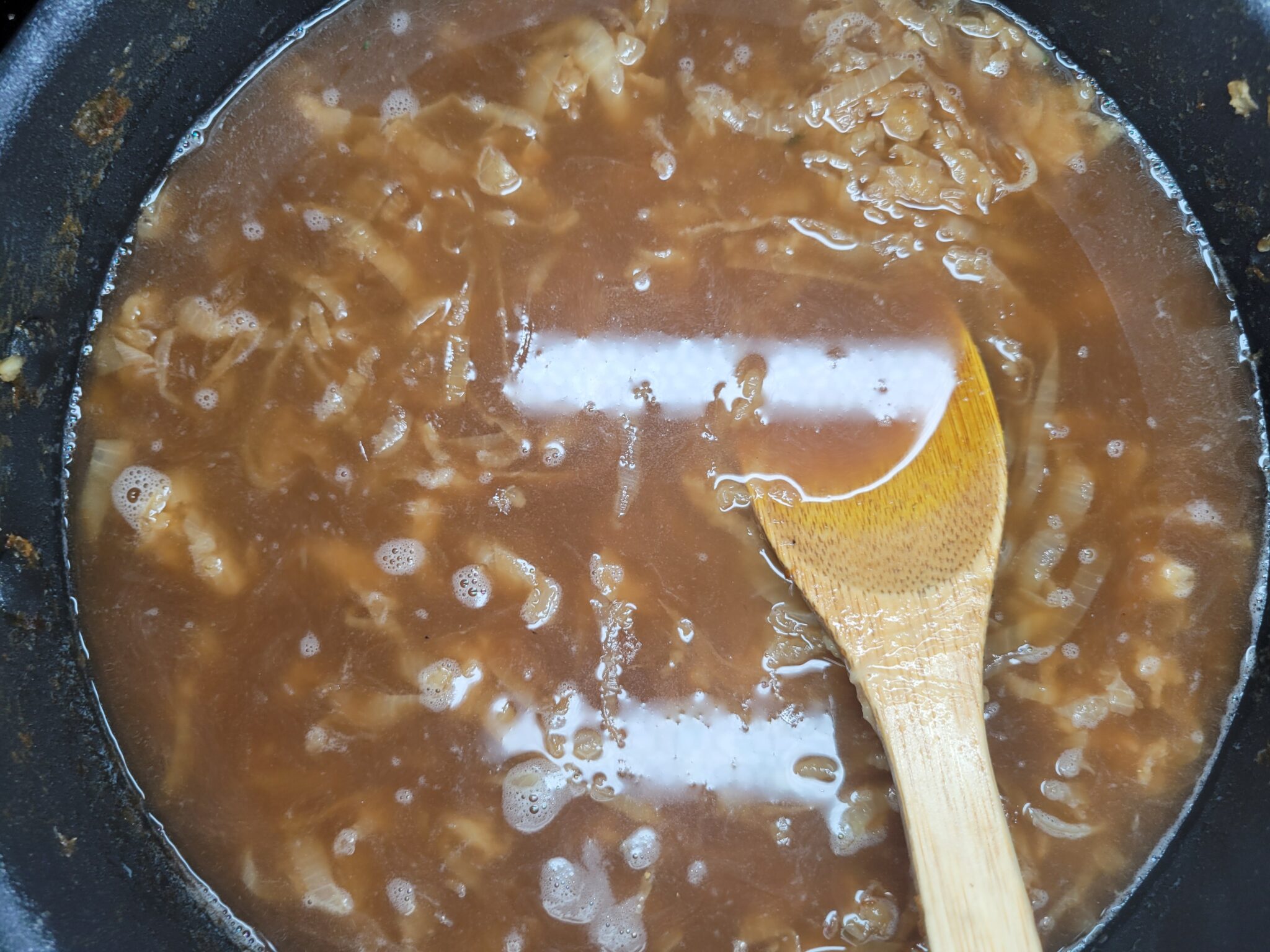 Then add 4 cups of beef broth. Bring to a boil, then reduce the heat to a simmer. Cover and stir occasionally for about 45 minutes to an hour.