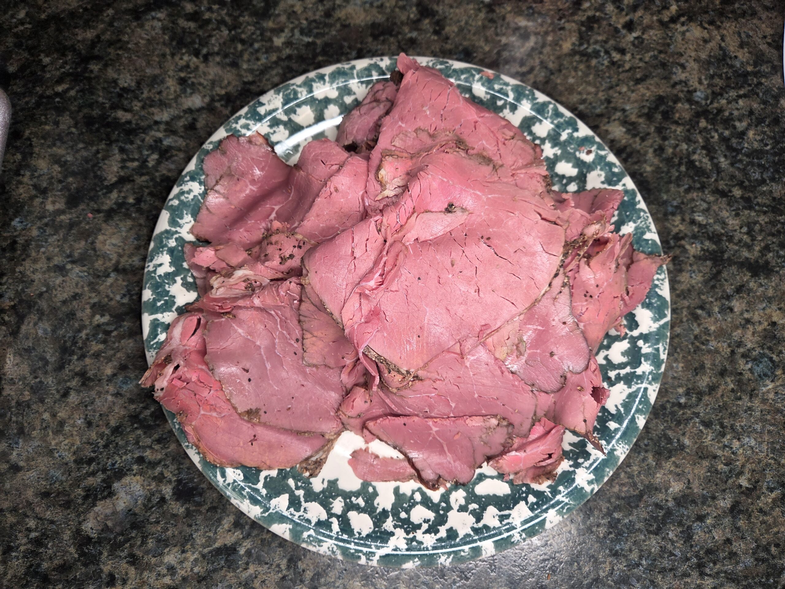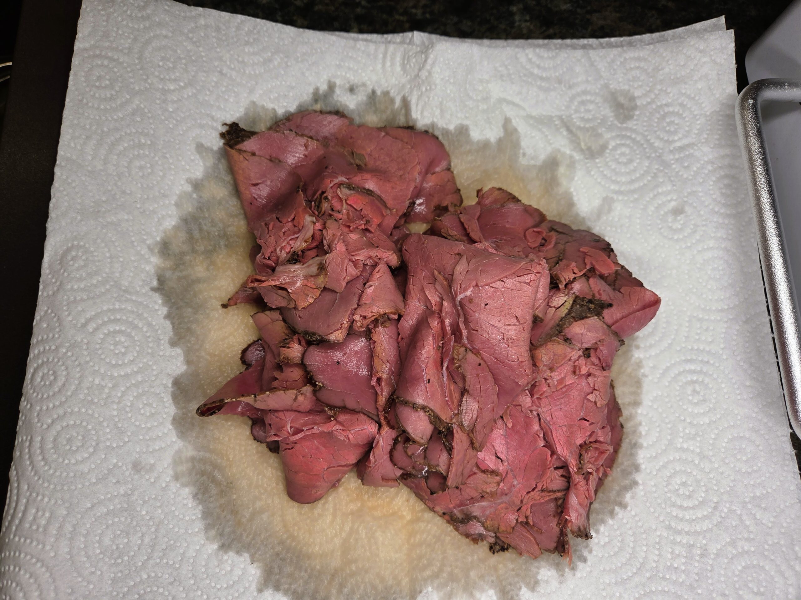 Transfer the pastrami to a paper‑towel‑lined plate and let it drain briefly.