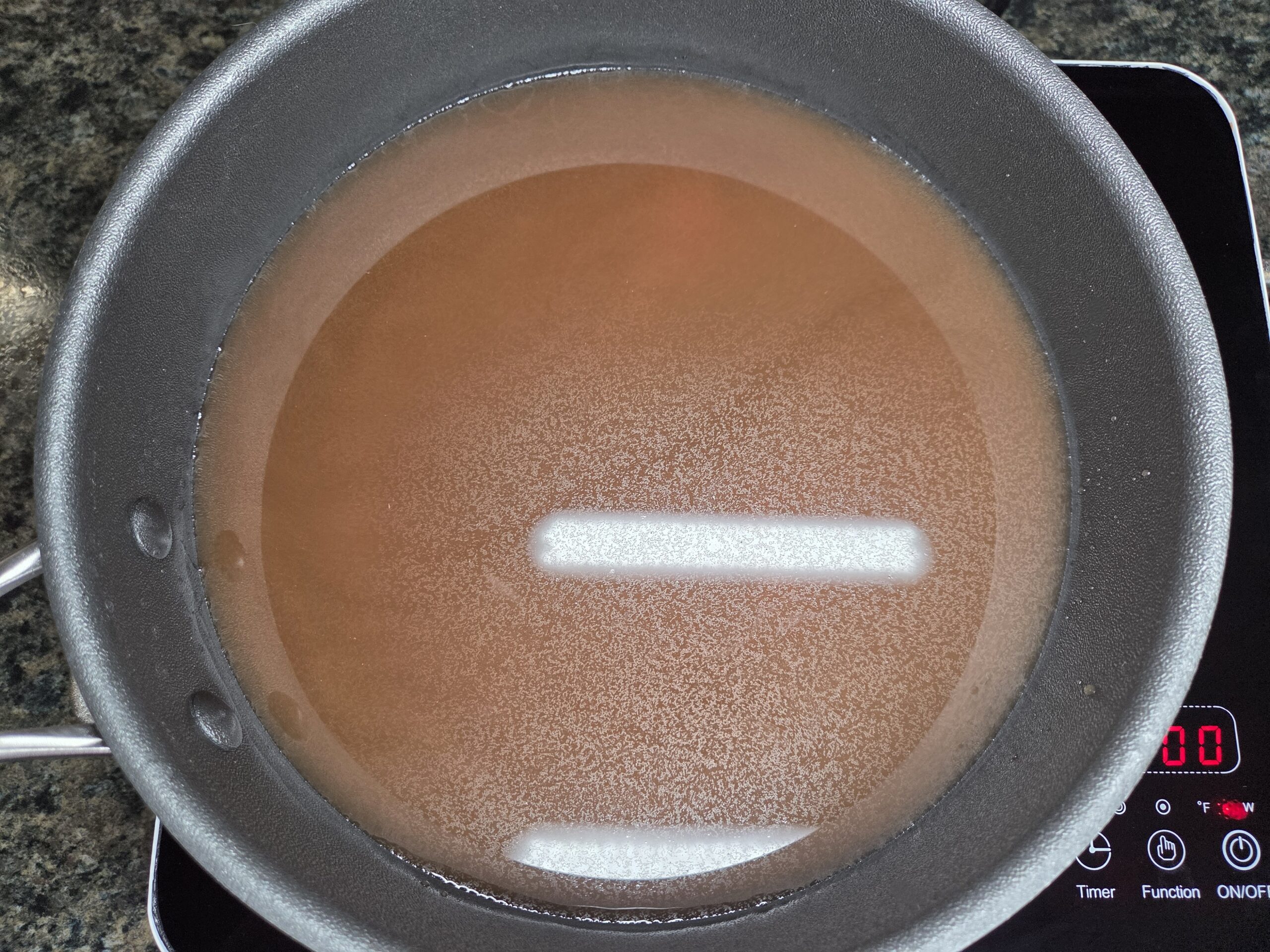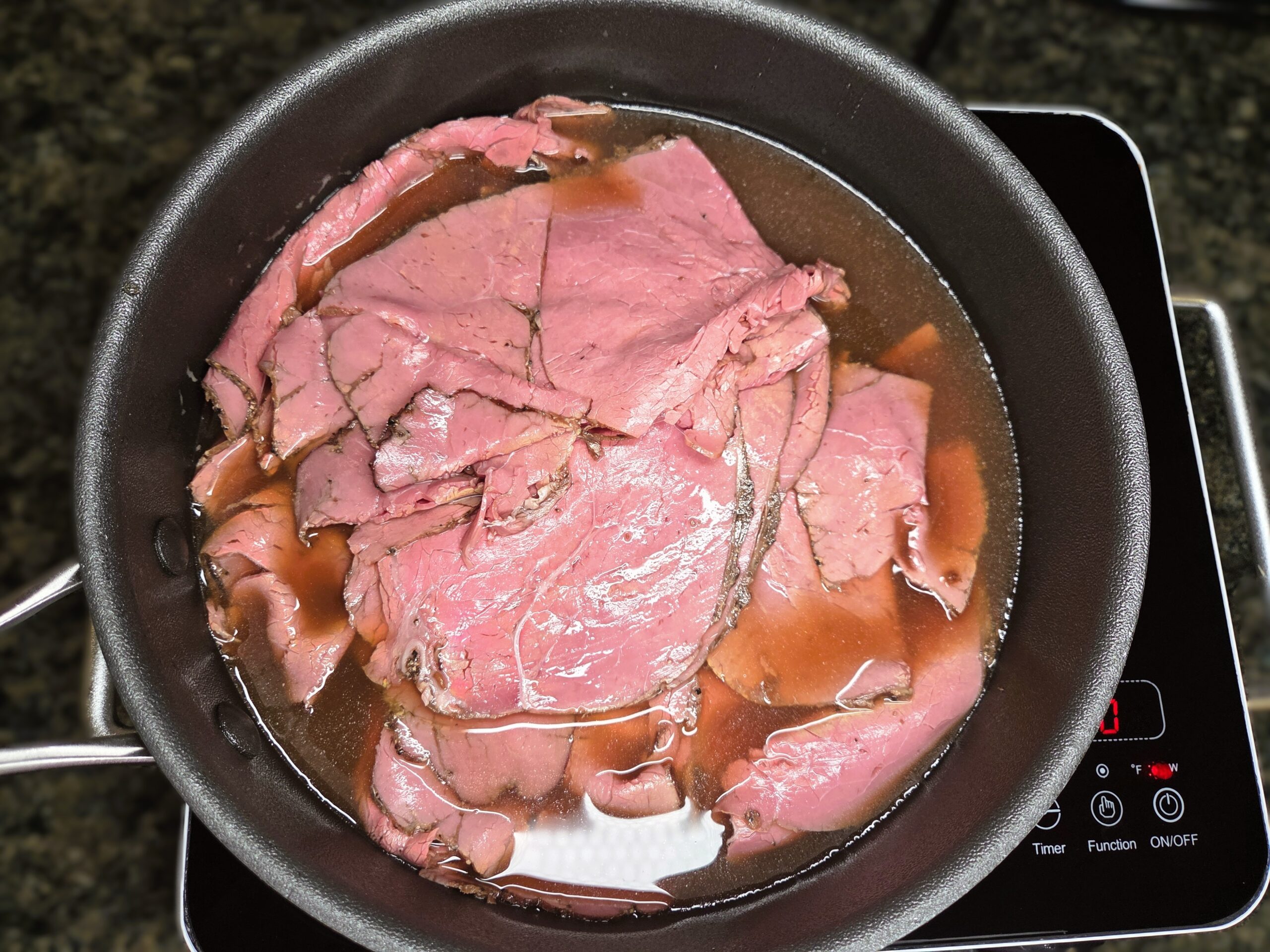 Add the pastrami slices to the hot broth and let them simmer on low for a few minutes, just until heated through.