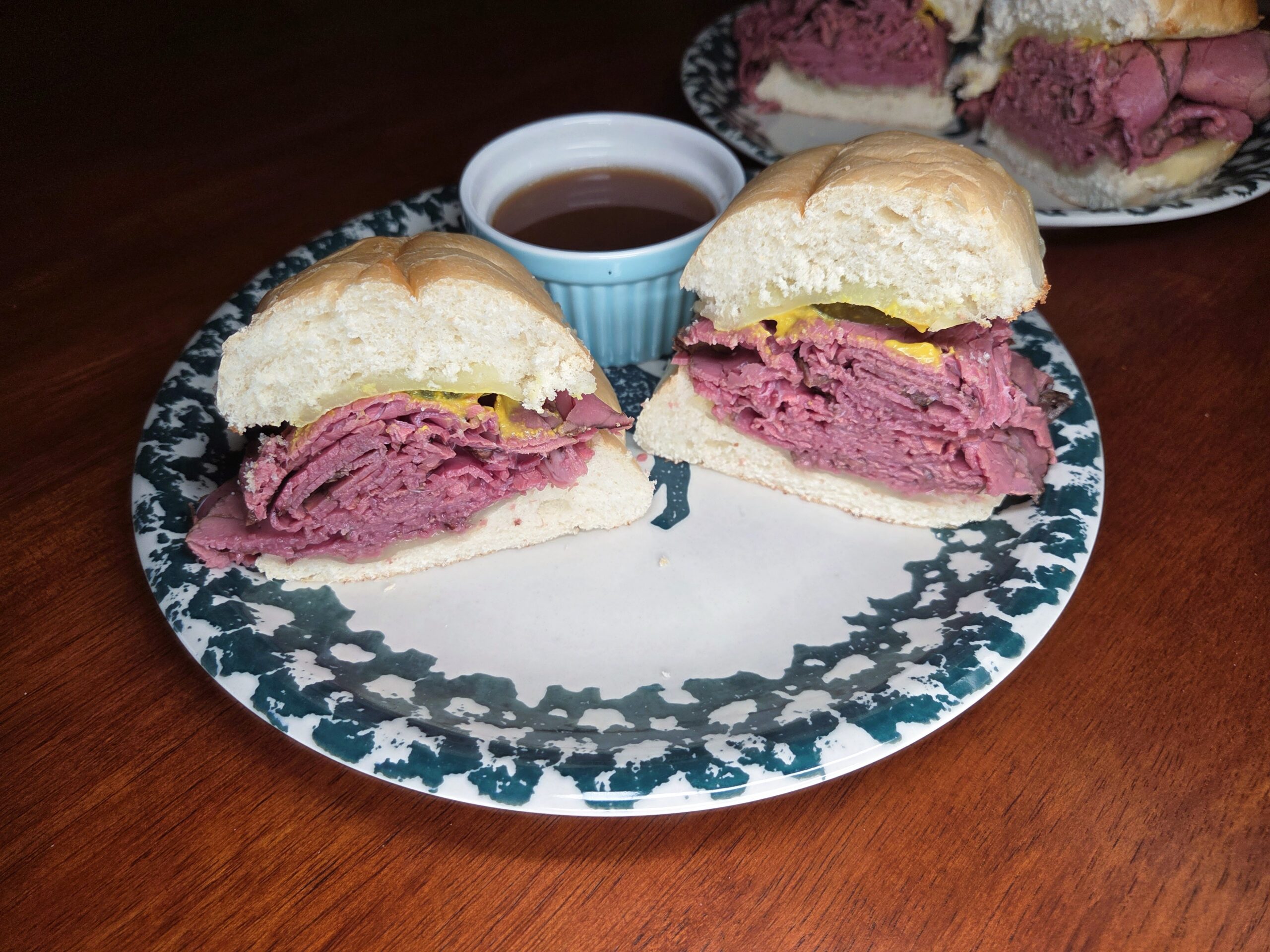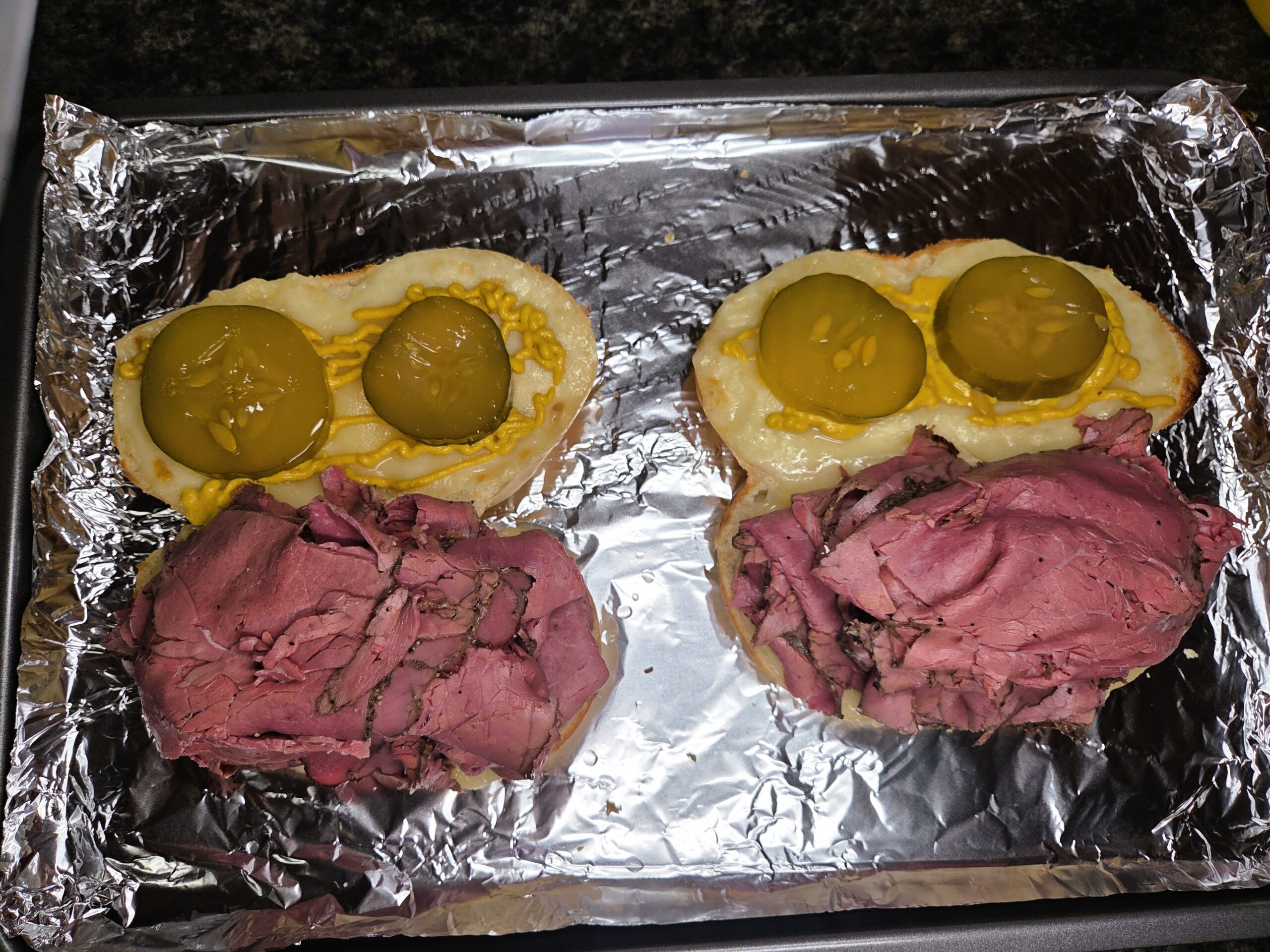Once the rolls come out of the broiler, add your desired amount of mustard, pickles, and the warmed pastrami. Serve with au jus.