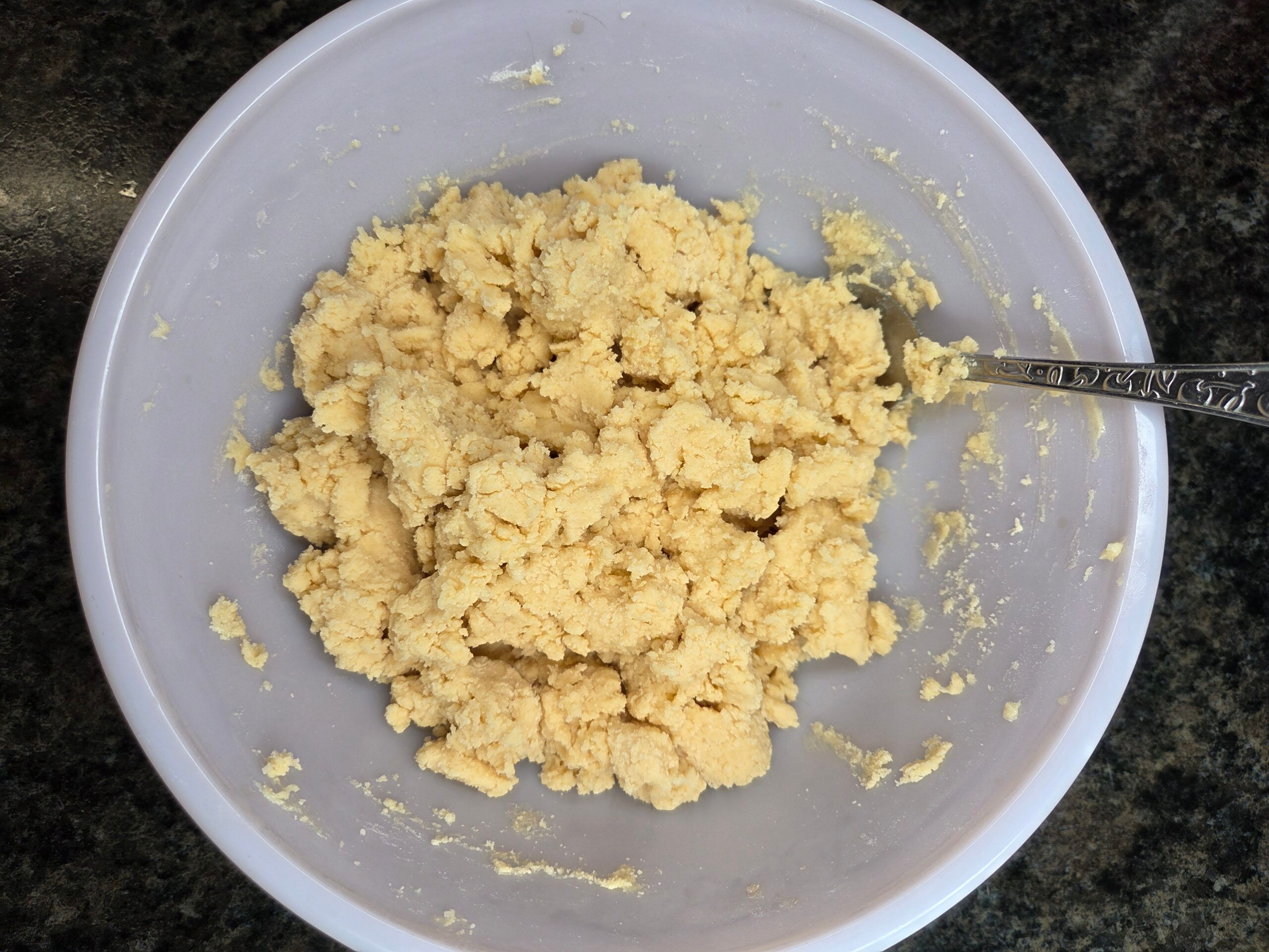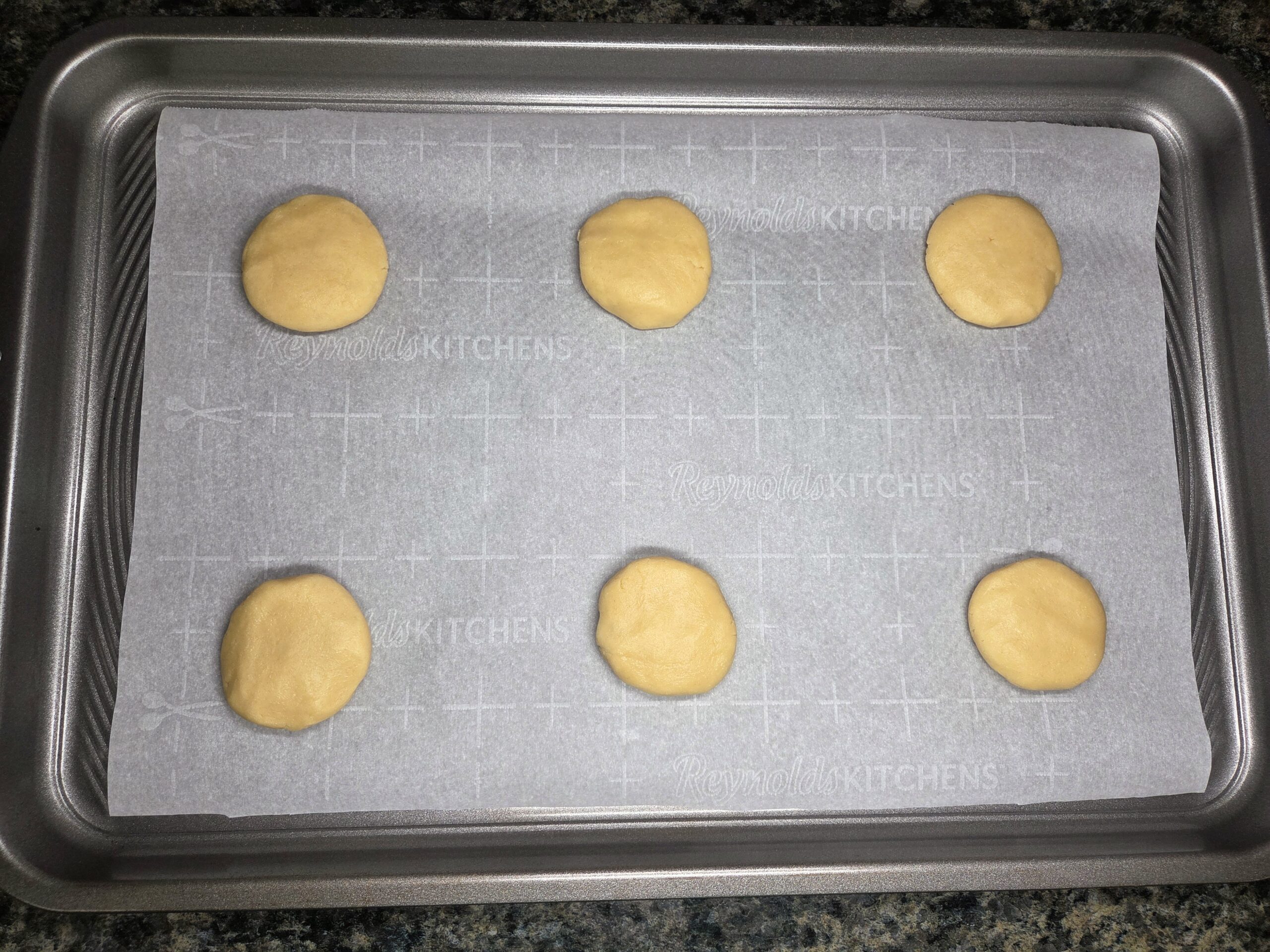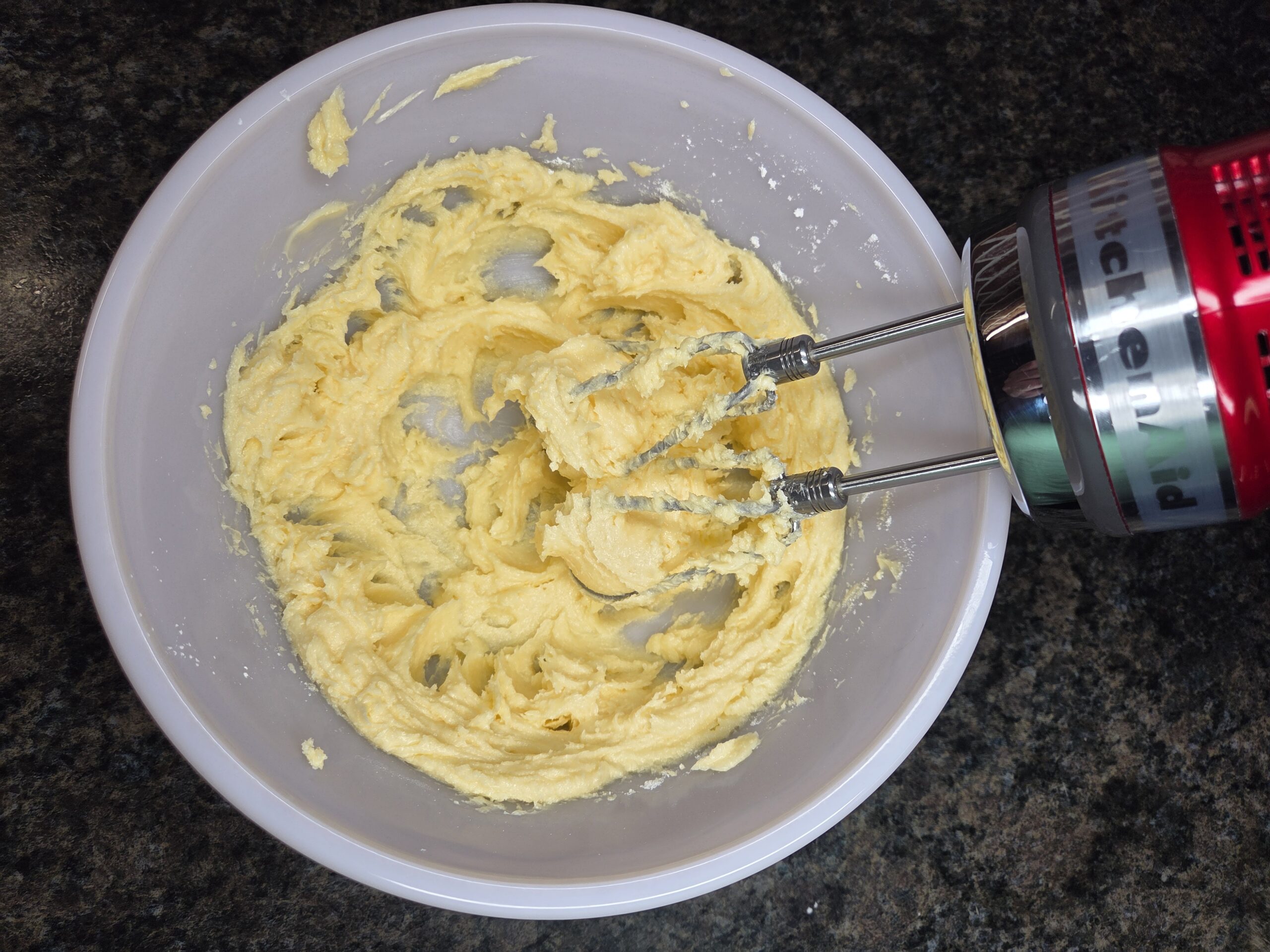 Preheat oven to 350°F and line a baking sheet with parchment paper. Cream together 1 cup of softened room-temperature butter, 1/2 cup of granulated sugar, and 1/4 cup of powdered sugar until smooth and fluffy.
