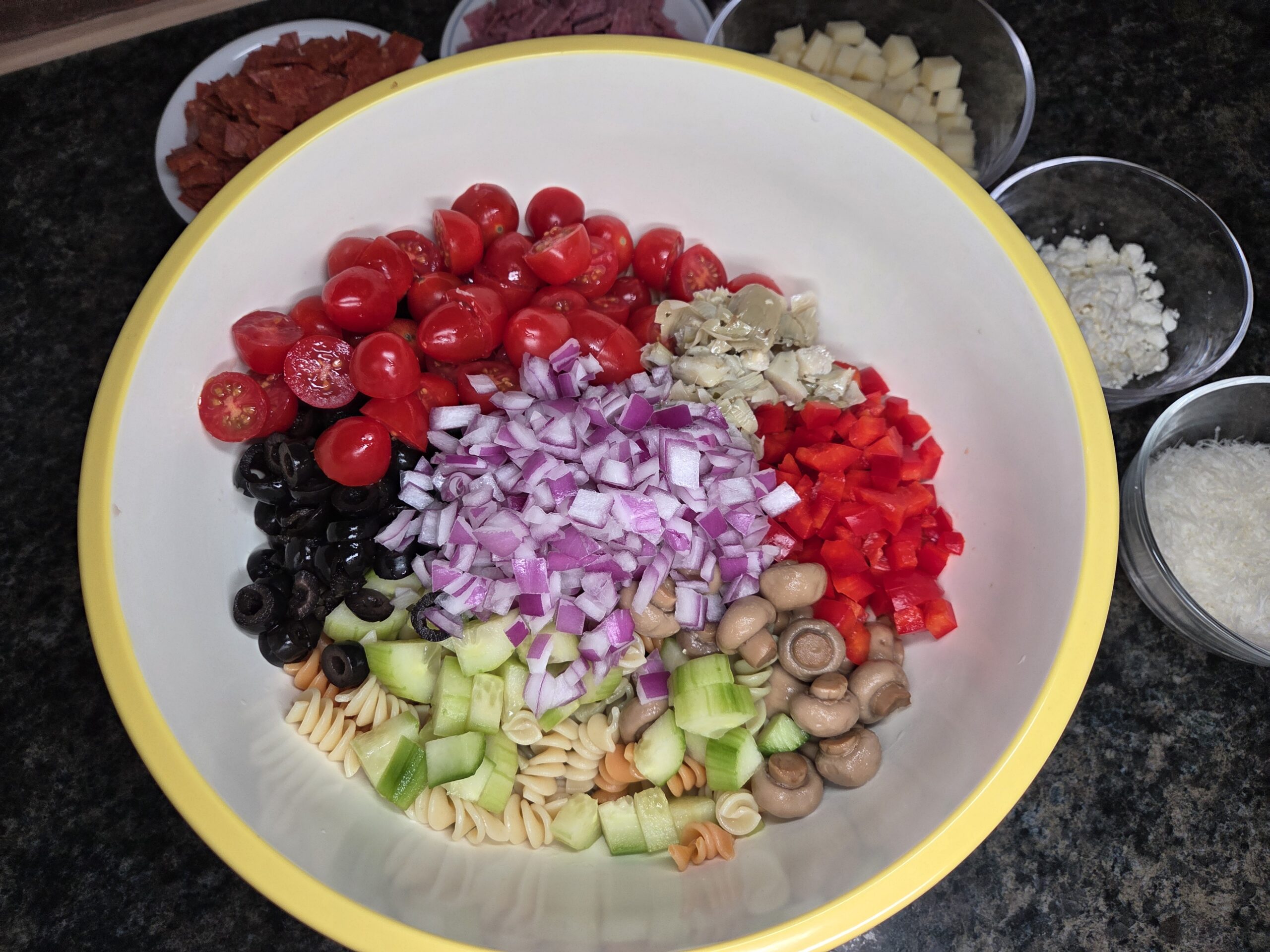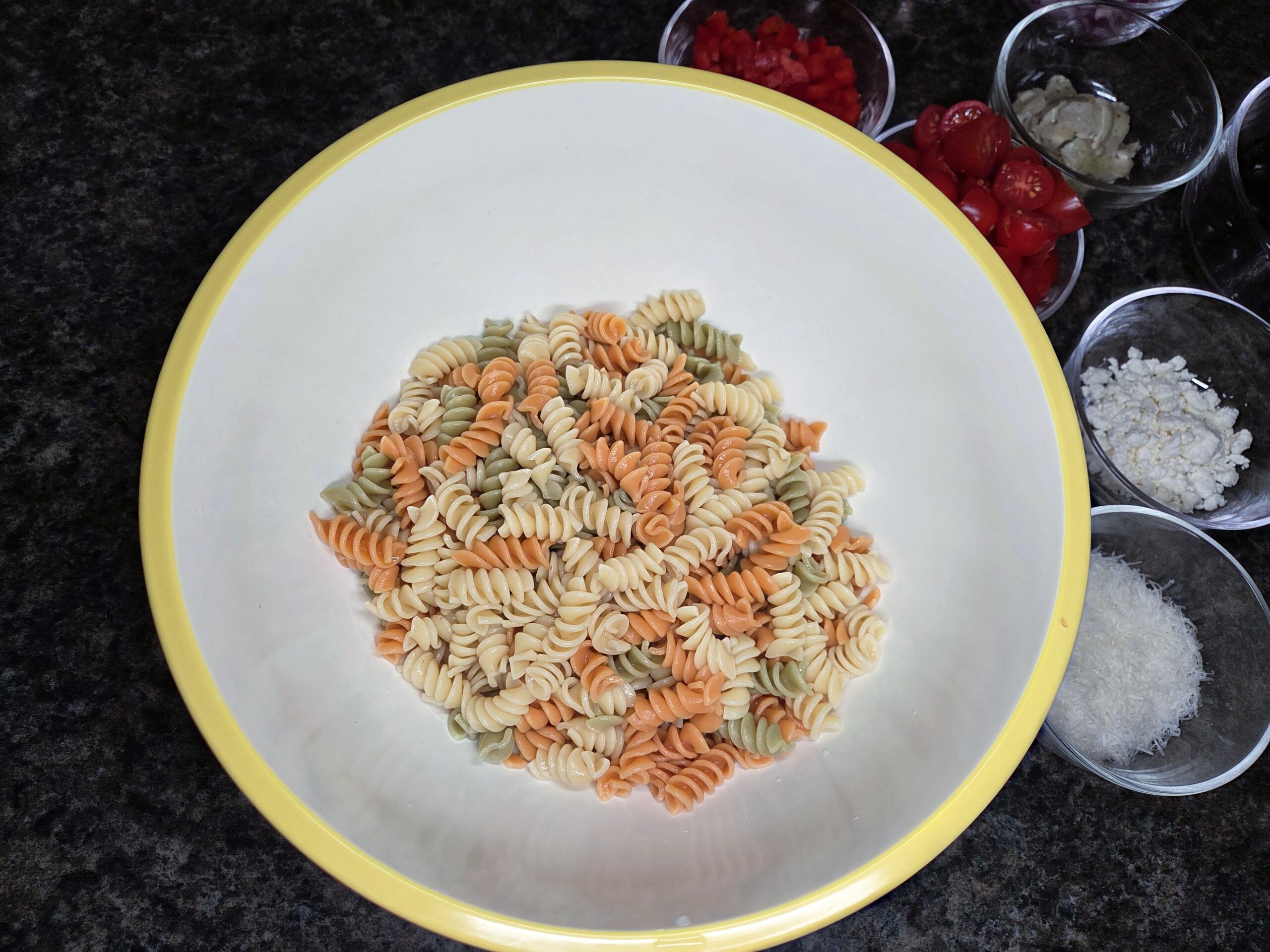 Boil pasta according to the packaging instructions until al dente. While the pasta is cooking, cut up and measure the remaining ingredients. Once the pasta is done, drain and rinse under cold water, and place it in a very large bowl.