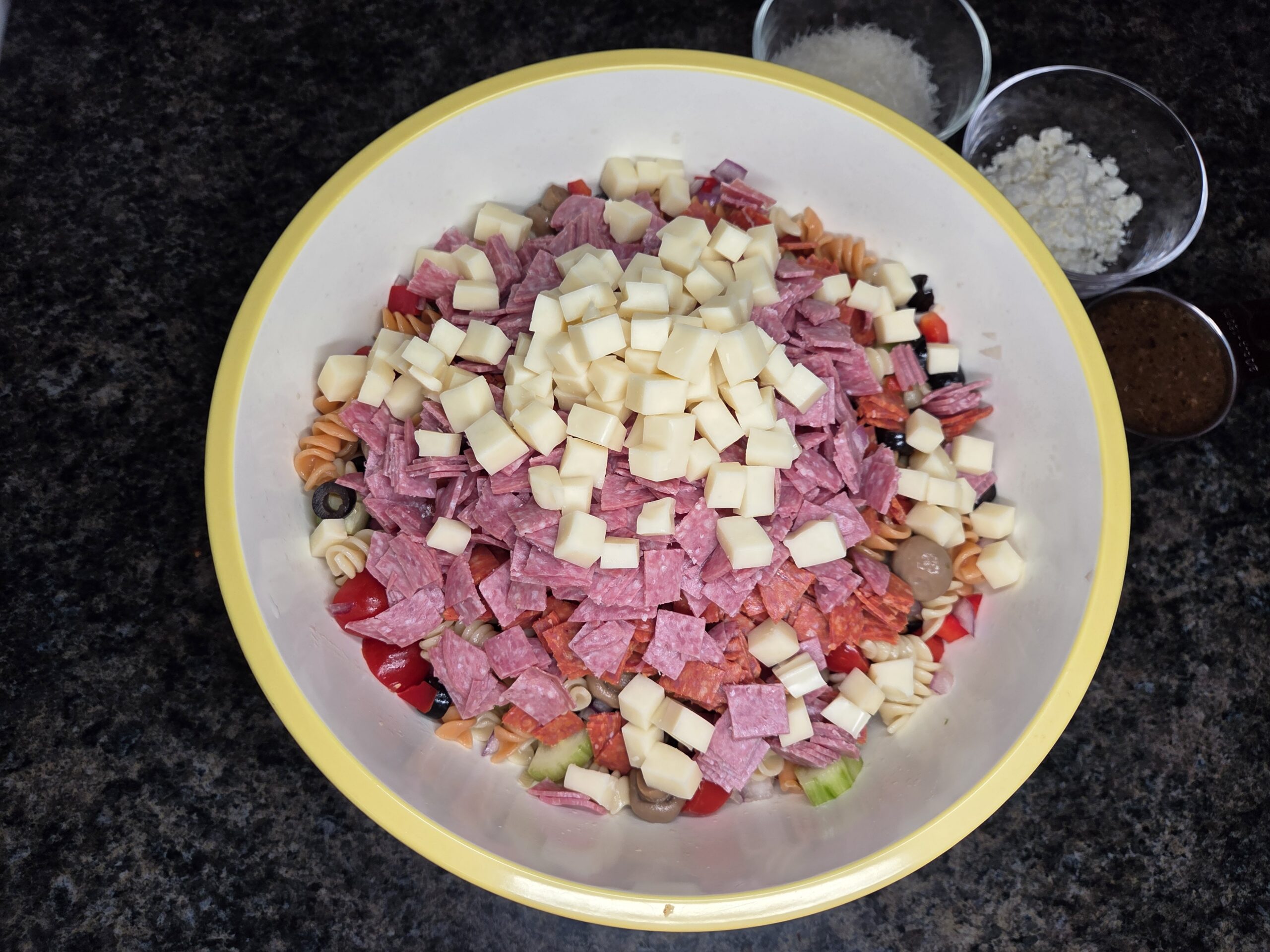 Add the chopped salami, pepperoni, and cubed mozzarella cheese to the bowl, then gently stir until everything is evenly combined.
