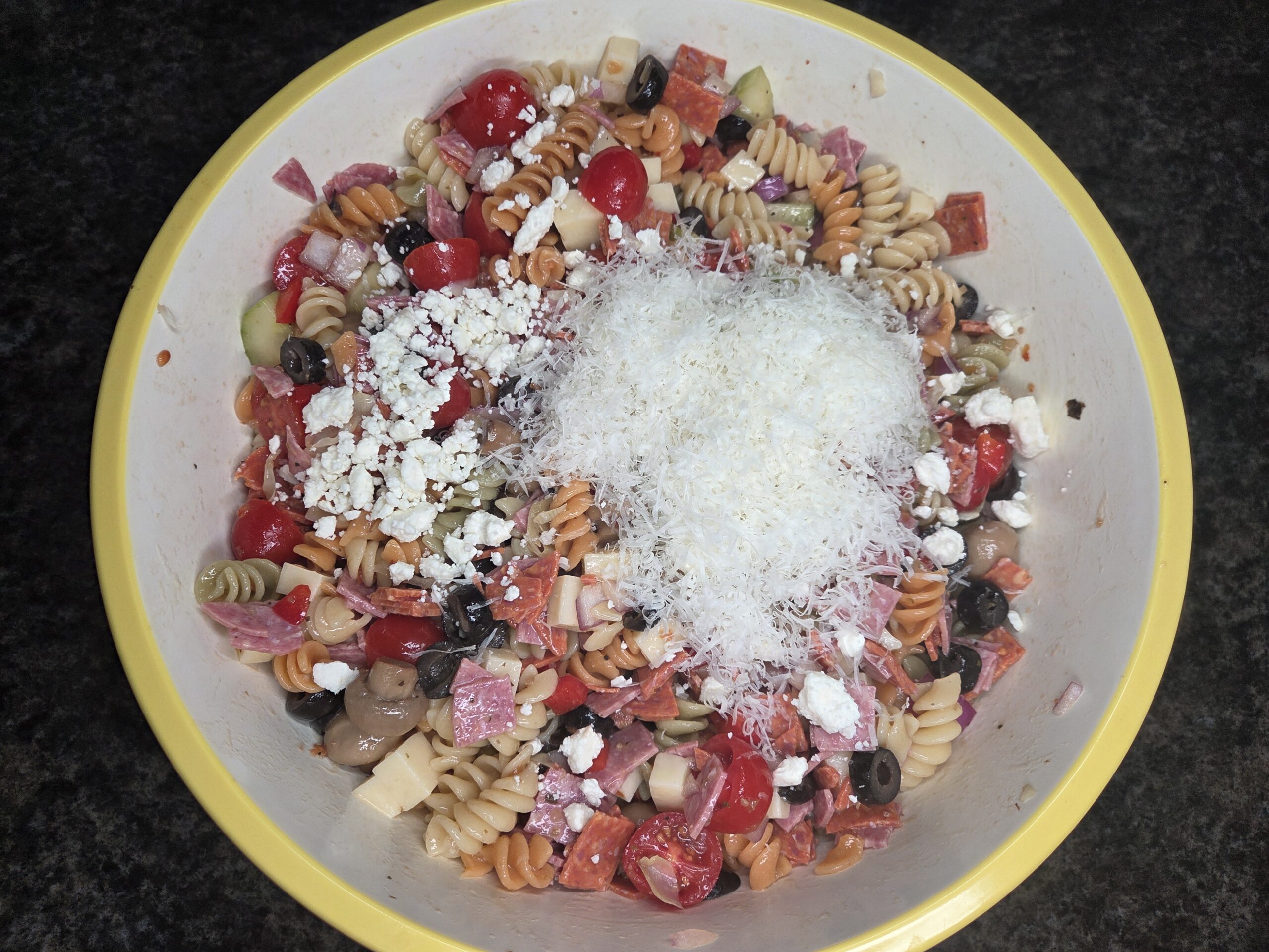 Lastly, stir in the grated Parmesan and feta crumbles. Toss everything together until well combined.