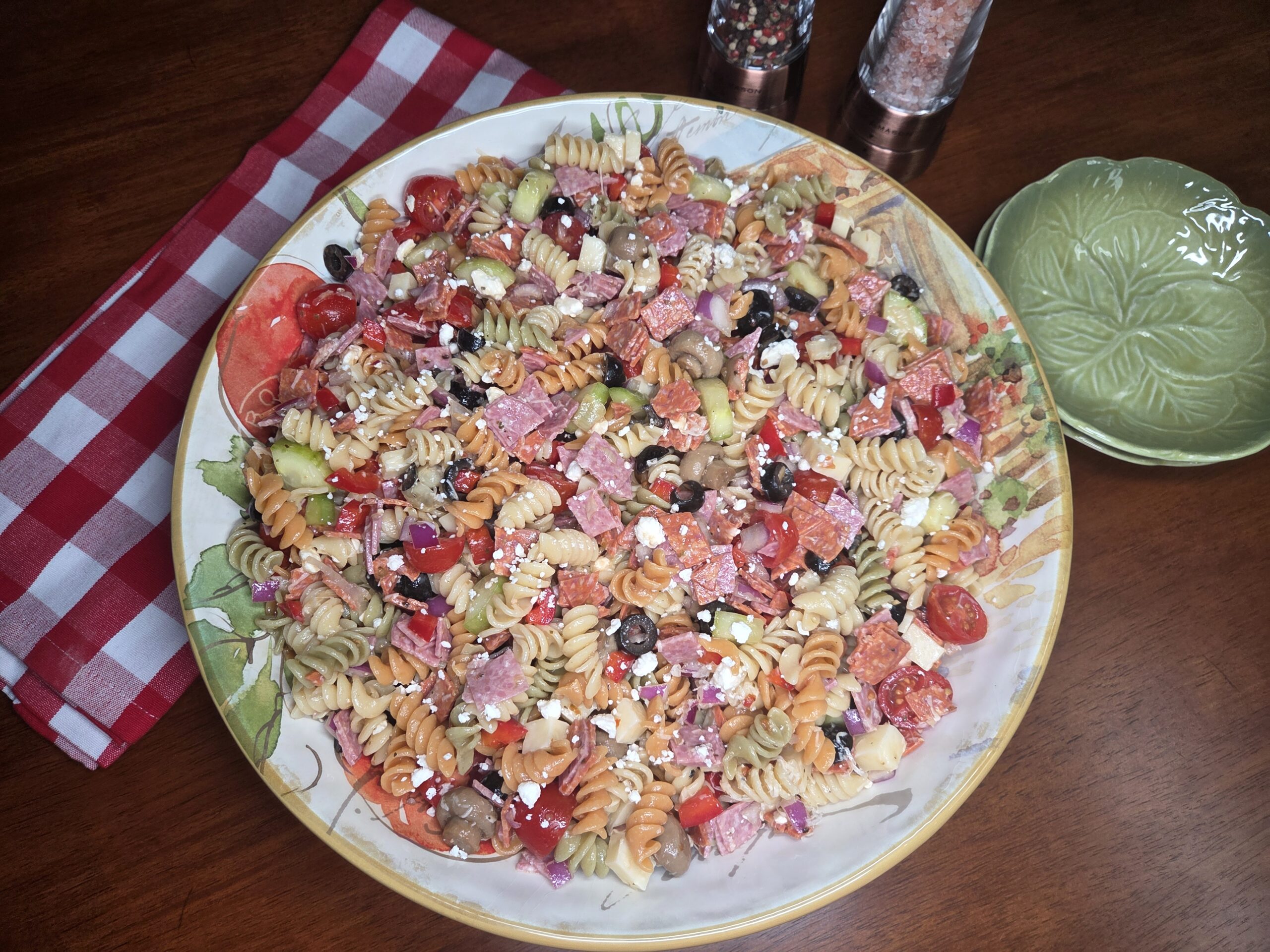 Italian pasta salad is perfect for a picnic or BBQ with family and friends. It’s quick to make, feeds a crowd, and is packed with veggies, meats, pasta, and a bright, zesty dressing!